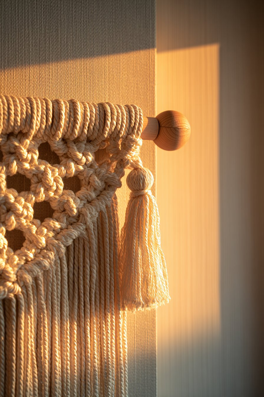 The magic happens during golden hour when afternoon light streams through nearby windows, casting dramatic shadows that emphasize every knot and twist in the macramé work. These shadows add another layer of visual interest, making the piece feel alive and dynamic rather than static. The vertical orientation is crucial—it draws the eye upward, making ceilings feel higher while perfectly proportioning to the narrow wall without overwhelming it. The natural fiber texture introduces an organic element that softens the room and provides tactile appeal.