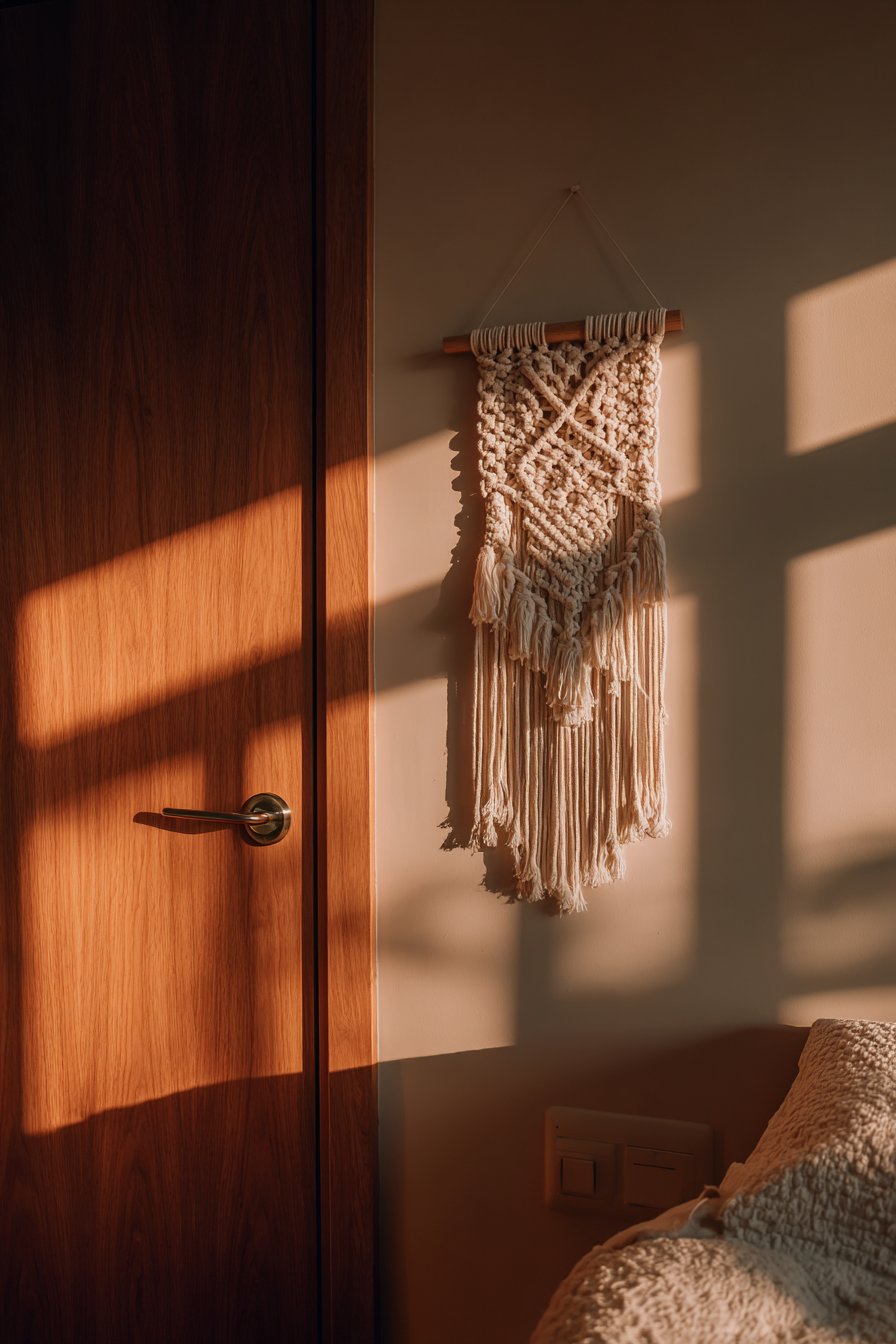 A handcrafted macramé wall hanging becomes the focal point on a narrow bedroom wall, spanning an impressive 48 inches vertically while maintaining a svelte 10-inch width that perfectly suits the slim space beside a doorframe. Natural cotton rope, worked into intricate knots and patterns, creates dimensional texture that plays beautifully against warm beige walls. Wooden beads incorporated throughout the design add weight and visual interest, while long fringe at the bottom creates movement and softness. This piece isn’t just decoration—it’s functional art that brings bohemian warmth and handcrafted authenticity to the space.