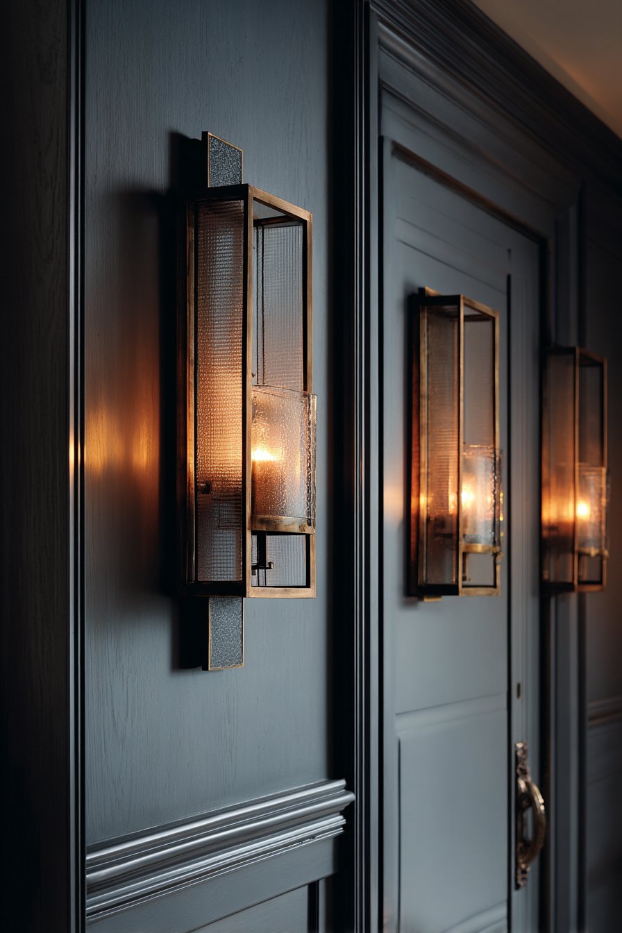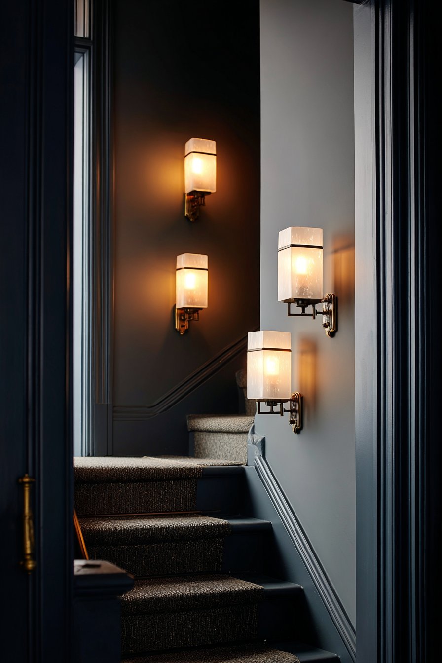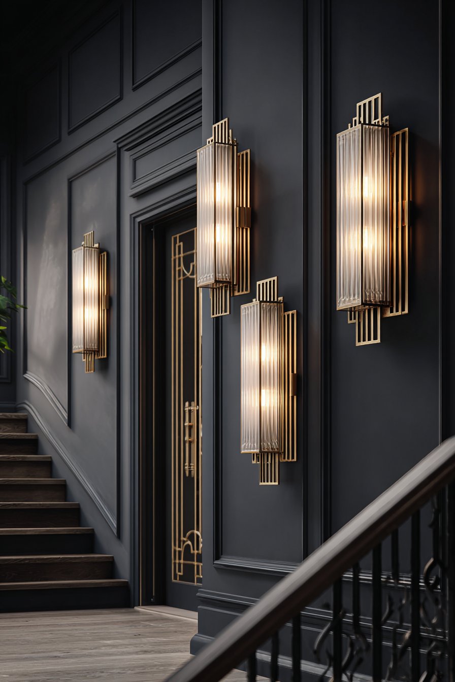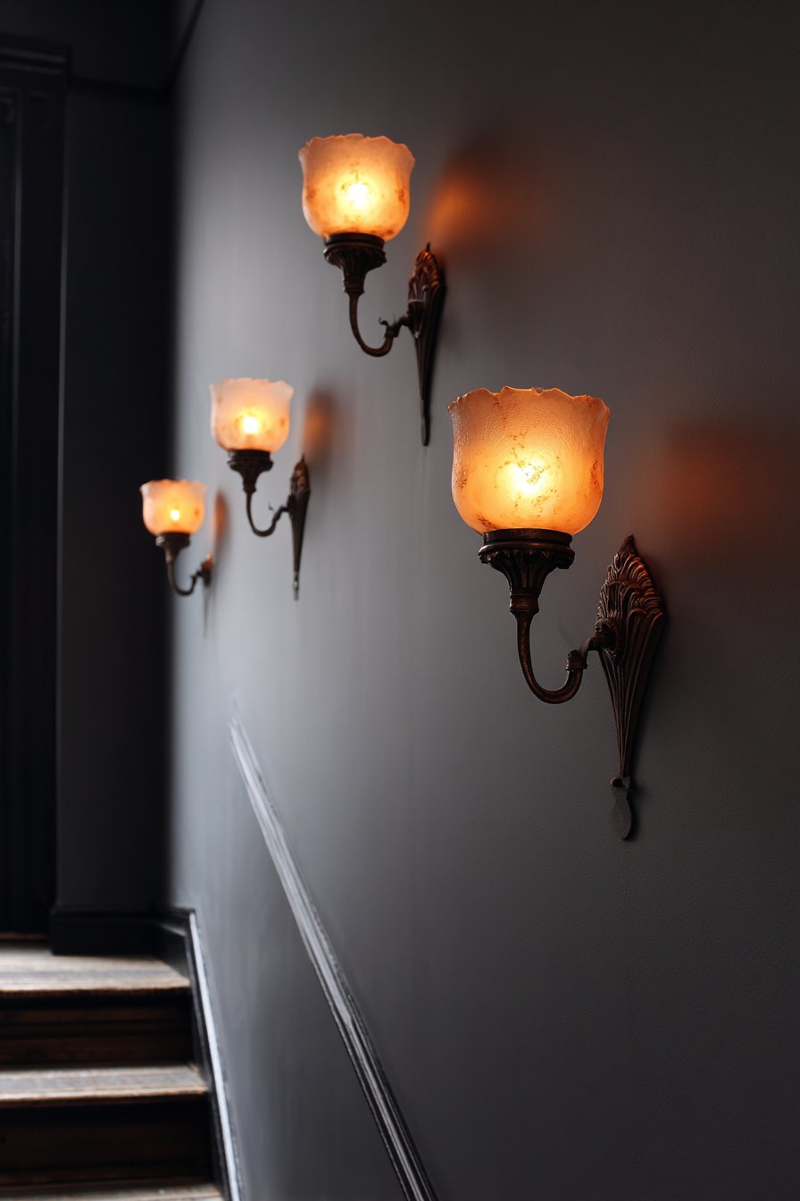 Three vintage-inspired Art Deco brass wall sconces march vertically up a narrow 12-inch wall between a staircase and doorframe, creating both illumination and architectural interest. Each sconce features frosted glass shades that diffuse light softly, while the brass finish gleams with warm metallic luster against deep charcoal gray walls. The staggered heights—positioned at approximately 24-inch intervals—create visual rhythm while providing layered ambient lighting that transforms the narrow space from forgotten to featured. This isn’t merely decoration; it’s functional lighting that solves the common problem of dark, awkward spaces between architectural elements.