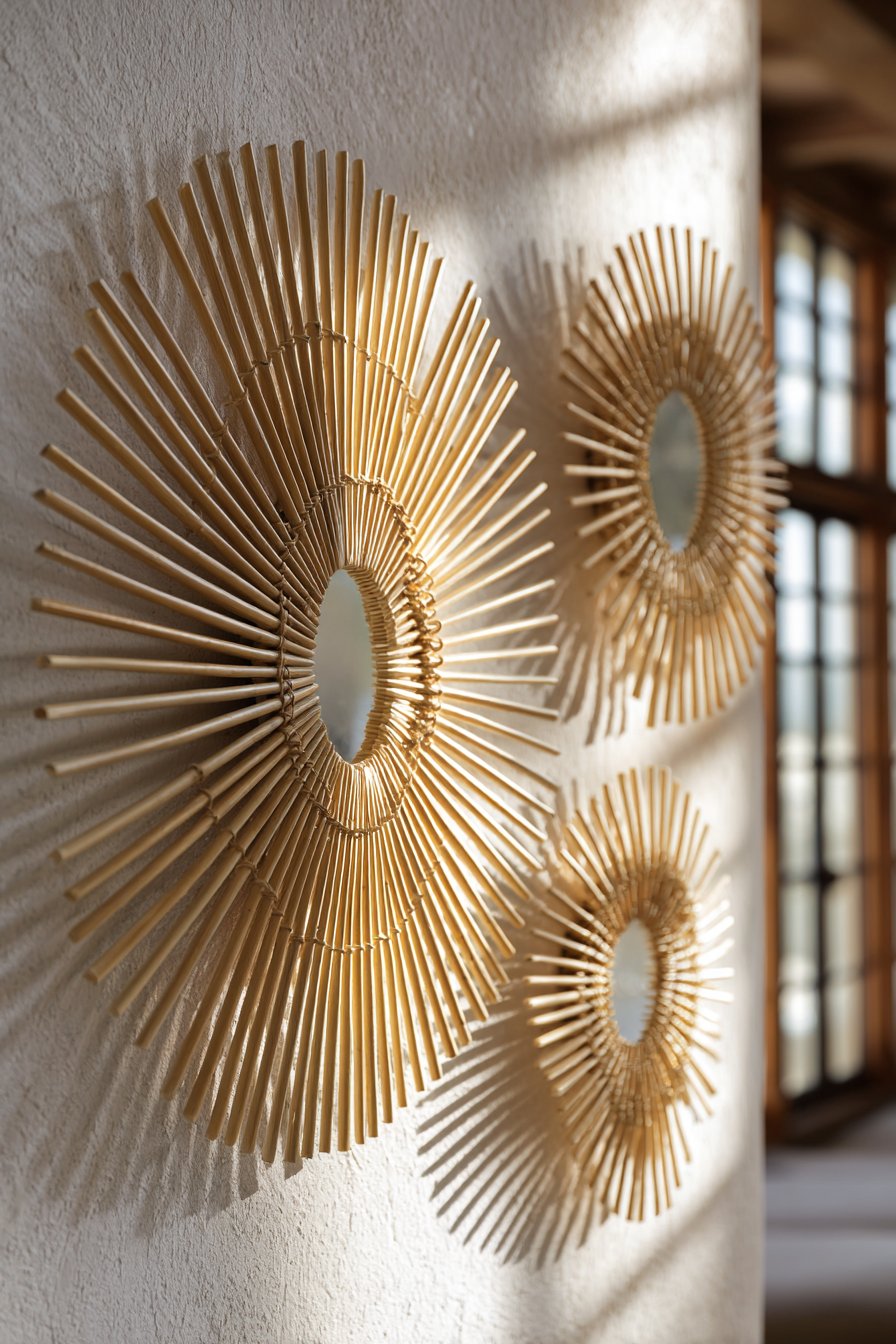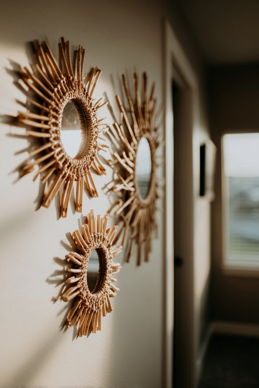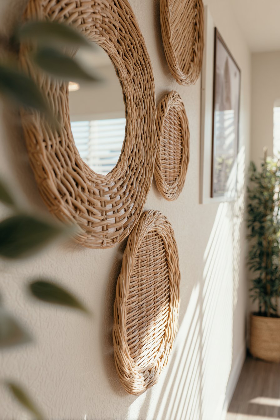 Three round rattan mirrors in graduated sizes create a sculptural focal point on a narrow 18-inch hallway wall, demonstrating how simple geometric repetition can deliver sophisticated results. The mirrors range from 8 to 14 inches in diameter, arranged vertically with consistent 6-inch spacing that creates visual rhythm without monotony. Each mirror’s natural woven frame brings bohemian texture and warm neutral tones that glow against crisp white walls, while the reflective surfaces capture and multiply light throughout the space. This arrangement feels curated and intentional—the kind of thoughtful detail that elevates a home from simply decorated to genuinely designed.