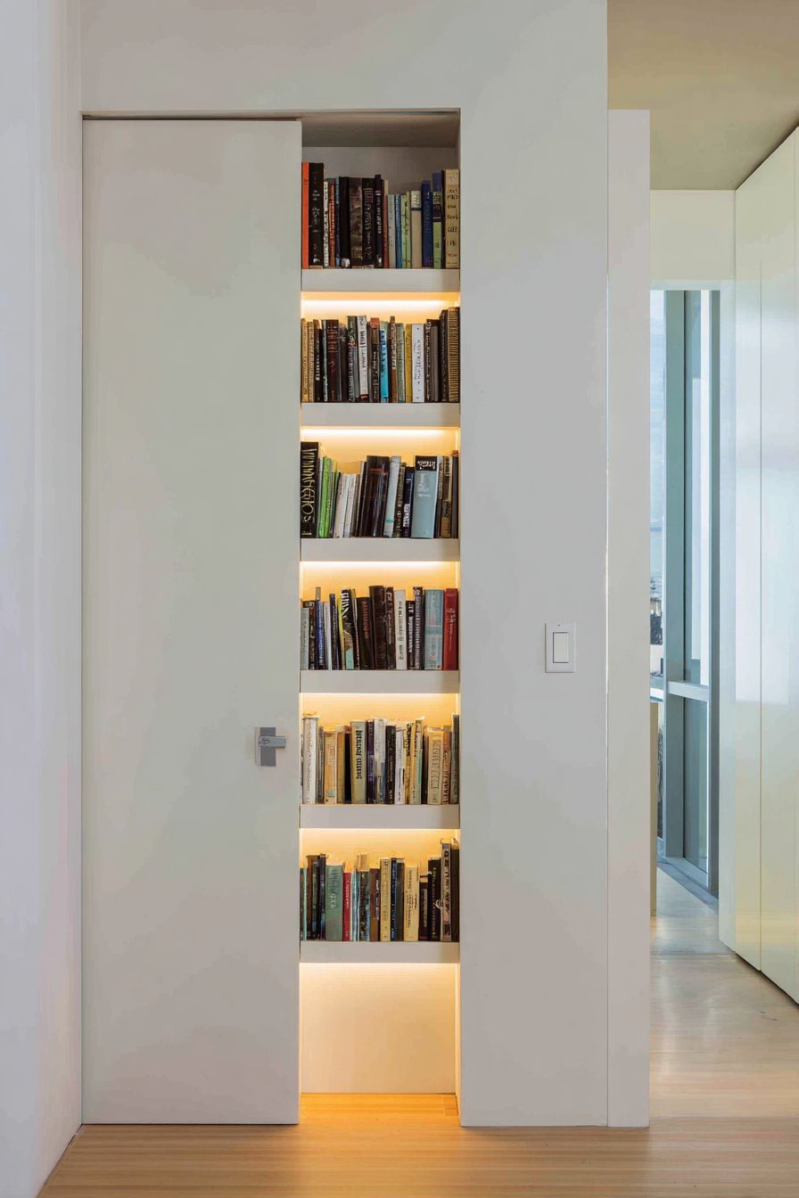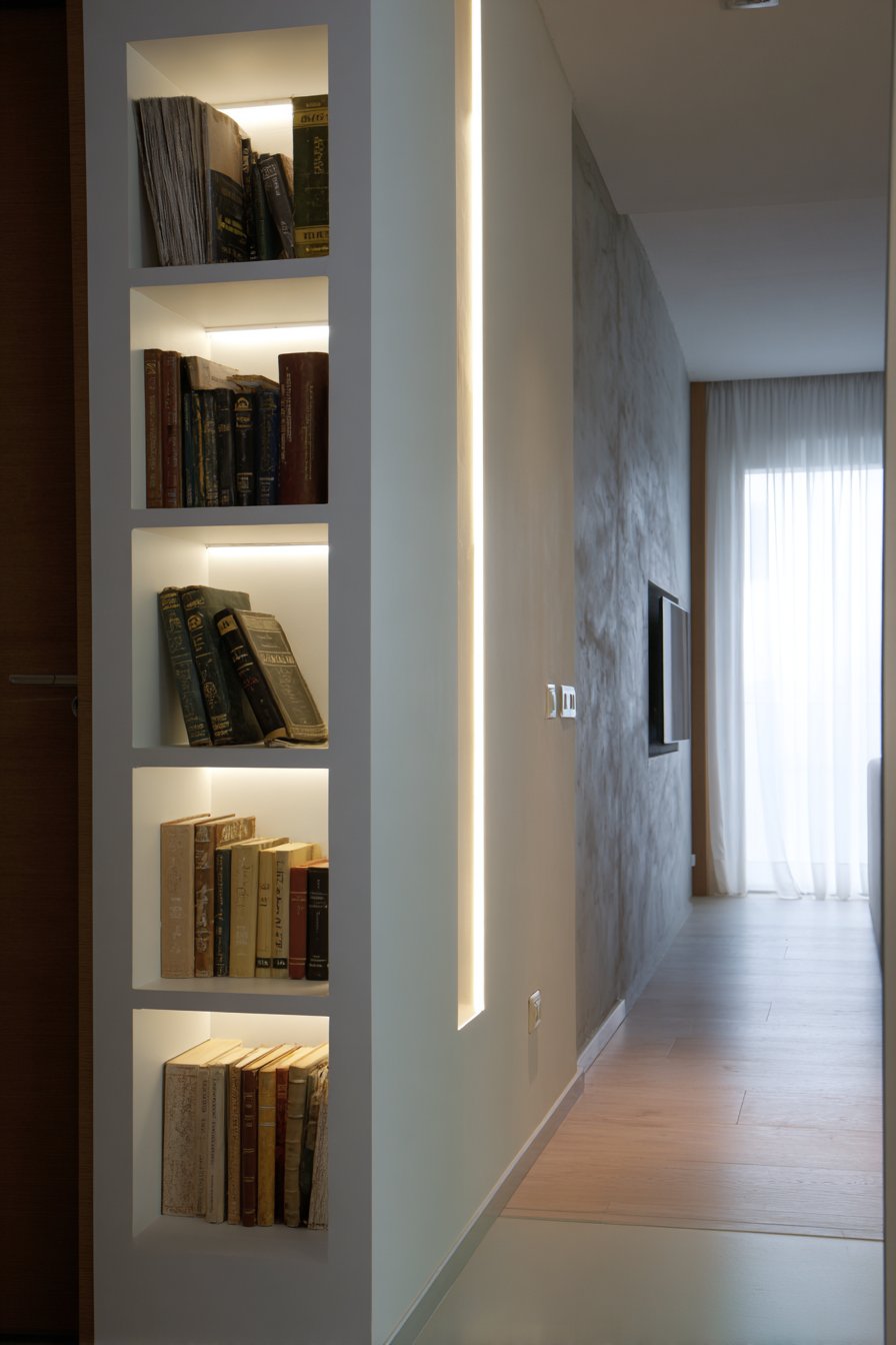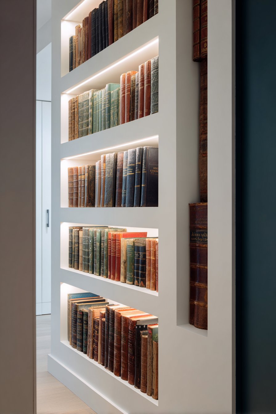 A narrow wall between two rooms becomes a architectural feature with a slim built-in book niche, only 8 inches deep but visually rich with integrated LED strip lighting. Four floating shelves in crisp white paint display a carefully curated collection of hardcover books arranged vertically—their spines creating an unintentional color gradient from deep blues to warm terracottas. The recessed design creates shadow and depth, making the narrow wall feel like an intentional architectural element rather than leftover space. LED lighting illuminates each shelf from behind, creating a gallery-like presentation that highlights the books while providing soft ambient illumination to surrounding areas.