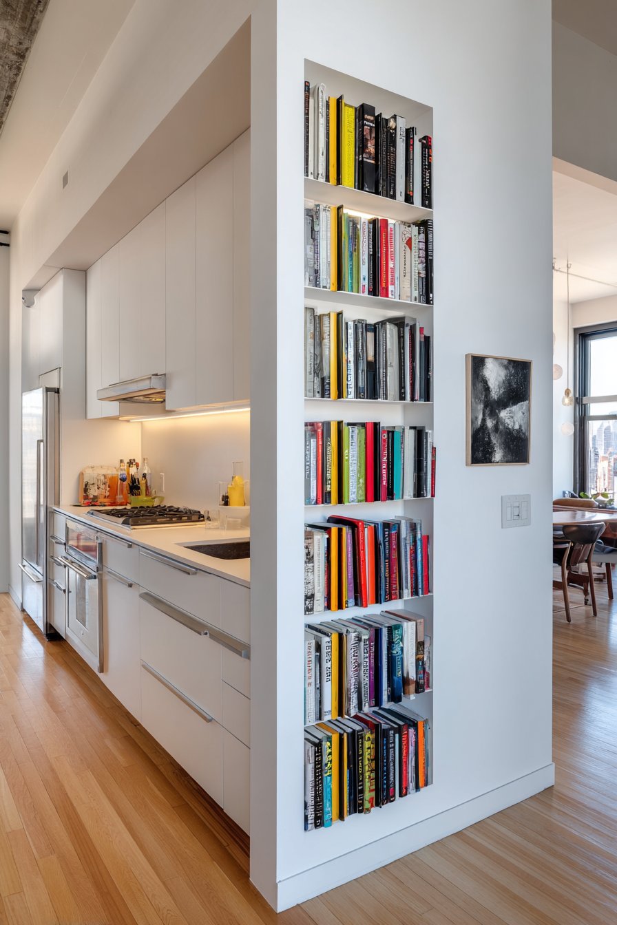 Beyond aesthetics, this approach demonstrates intelligent space utilization in modern apartments where every inch counts. The 8-inch depth is perfect for standard hardcover books without protruding into walkways or feeling bulky. The white shelves and surrounding white walls create a clean gallery aesthetic that makes the colorful book spines pop with maximum impact. This is narrow wall decor that serves both form and function—providing storage, display, lighting, and architectural interest simultaneously.