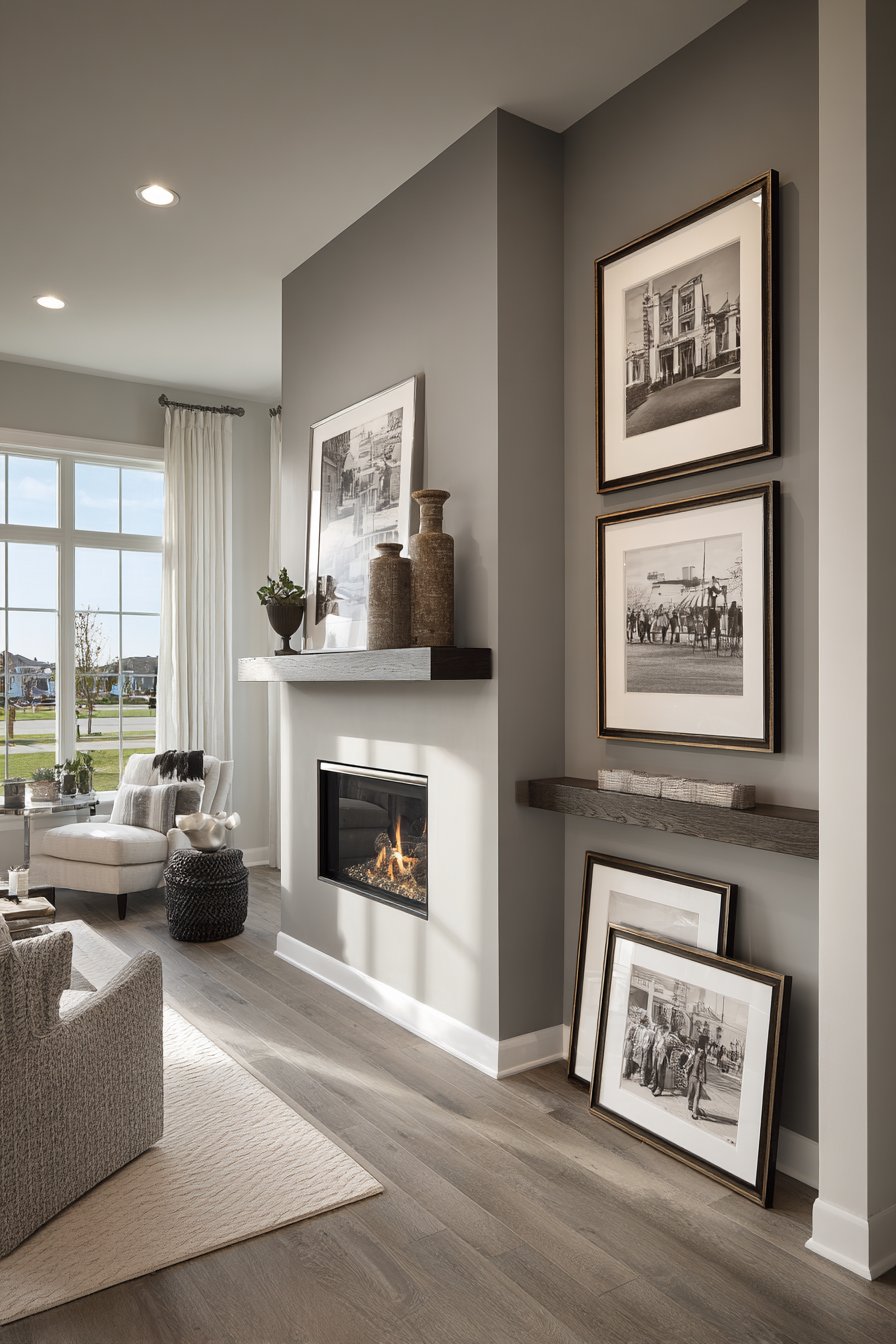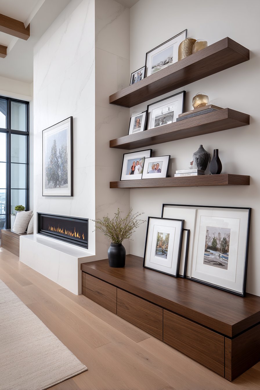Transform a 14-inch wide wall beside a fireplace into a dynamic family photo gallery using three thin floating ledges in dark walnut finish. Unlike traditional gallery walls where photos are permanently mounted, this system allows for constant evolution—frames simply lean against the wall on the ledges, making it easy to rotate images seasonally or as your collection grows. Matching black frames in various sizes create cohesion while offering flexibility, and the natural wood ledges add warmth that complements the fireplace’s cozy ambiance. This isn’t a static display; it’s a living gallery that evolves with your family’s story.
