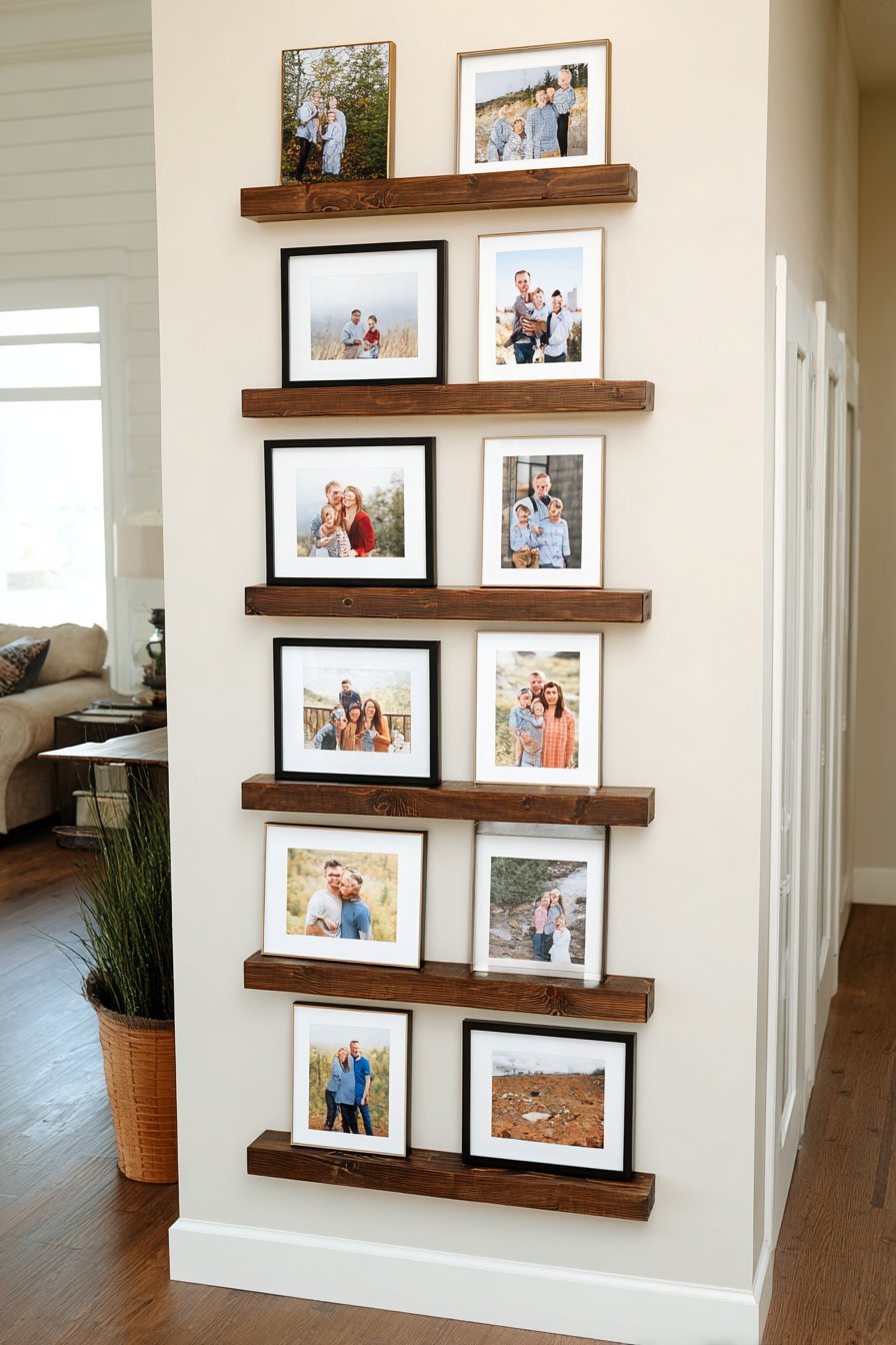 This approach works beautifully on narrow walls that might otherwise be awkward to decorate. The ledges themselves create strong horizontal lines that visually widen the narrow space, while the flexibility of the system means you’re never locked into one arrangement. Change photos with the seasons, feature vacation memories, or rotate children’s artwork—the possibilities are endless and endlessly adaptable.