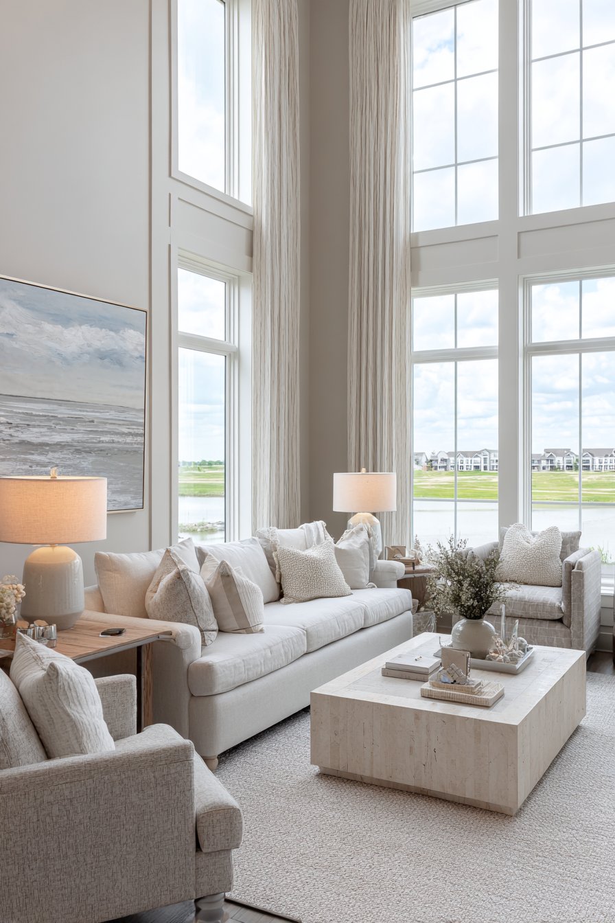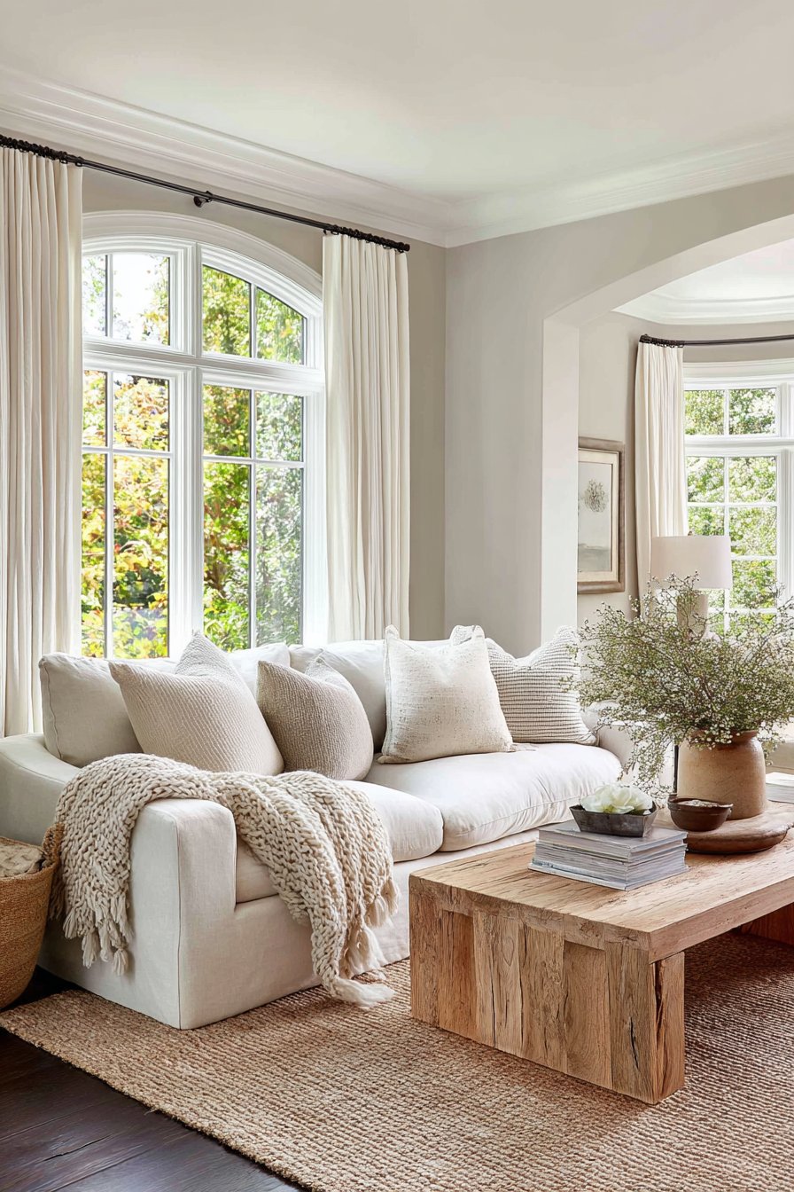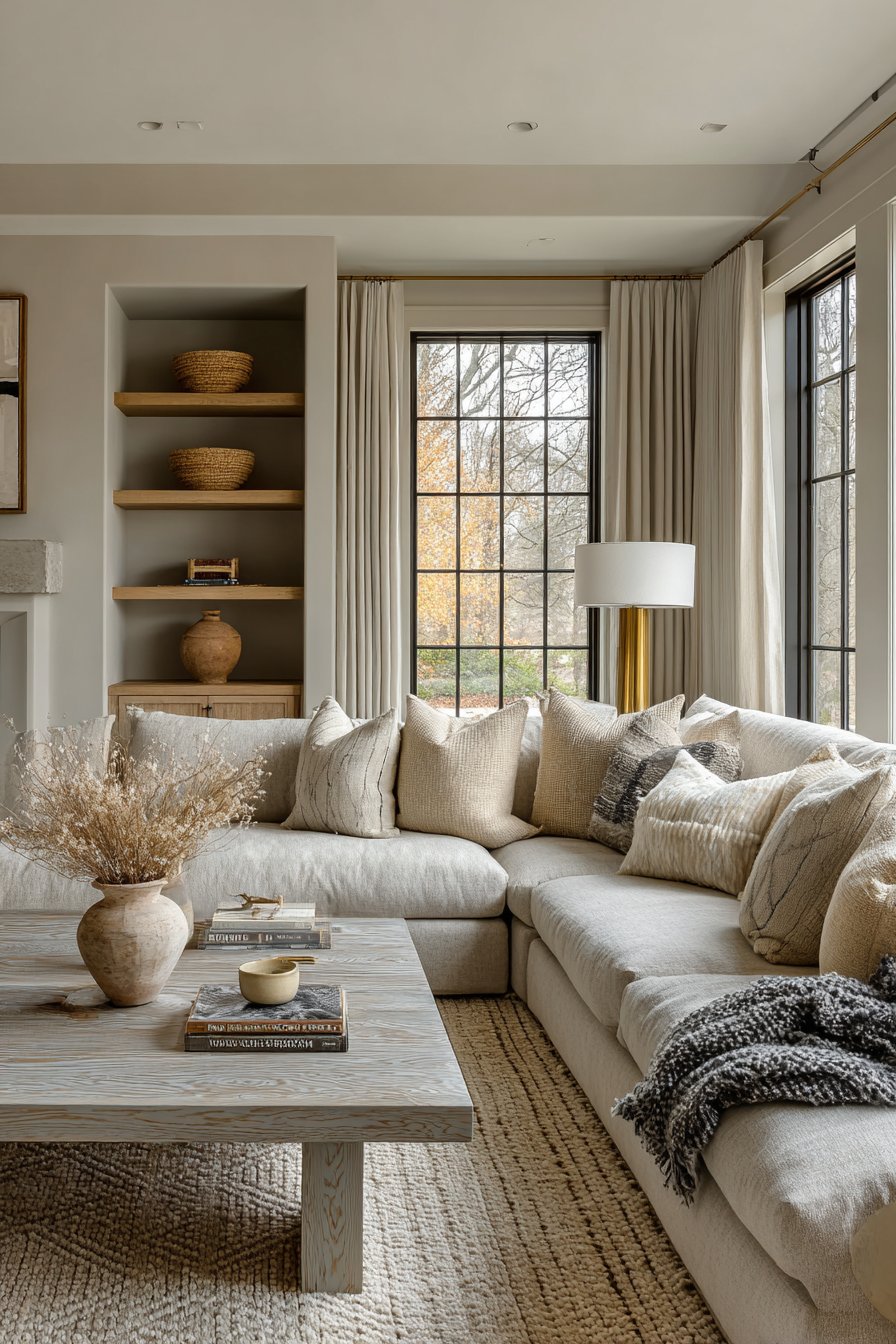 This stunning showcase represents the epitome of neutral living room design, where every element works in perfect harmony to create a space of exceptional beauty and tranquility. The foundation begins with a plush oatmeal linen sectional that anchors the room with its generous proportions and inviting texture. The sofa’s natural fabric showcases subtle variations in tone, while varied throw pillows in ivory, sand, and natural flax add dimensional interest without disrupting the cohesive palette.
