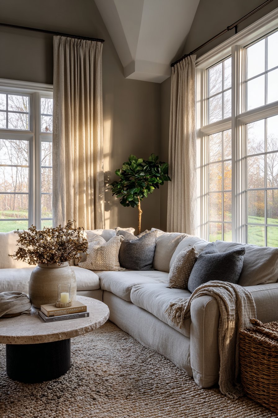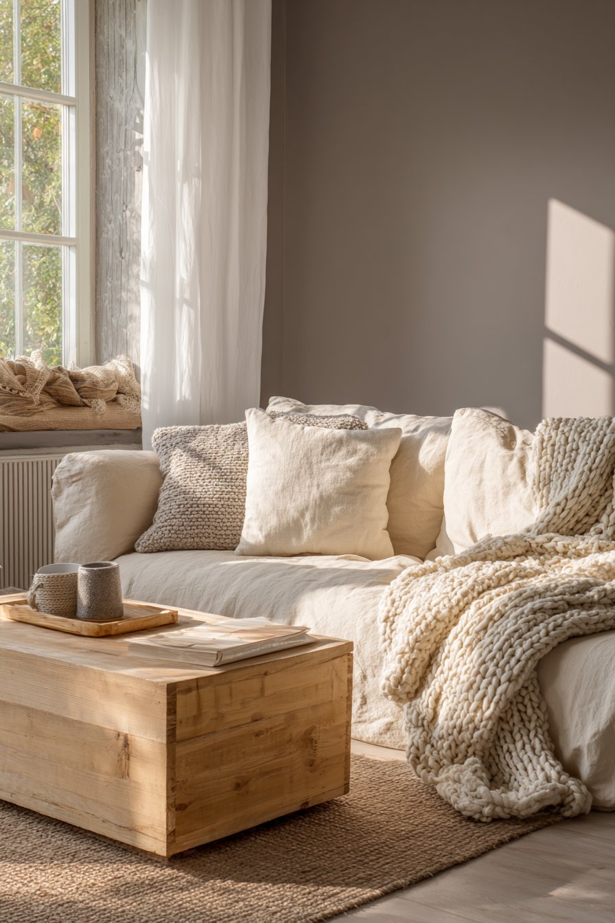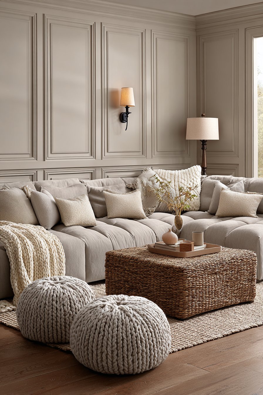 Walls in greige with subtle warm undertones create a cocoon-like atmosphere that feels protective and comforting. Table lamps with natural linen shades positioned on side tables provide warm ambient lighting that enhances the room’s cozy character, particularly important during evening hours when natural light fades. The combination of plush fabrics, natural materials, and warm lighting creates an irresistibly comfortable retreat.