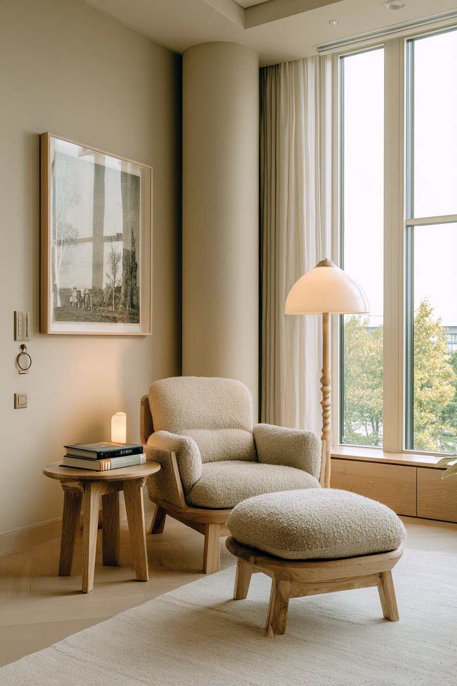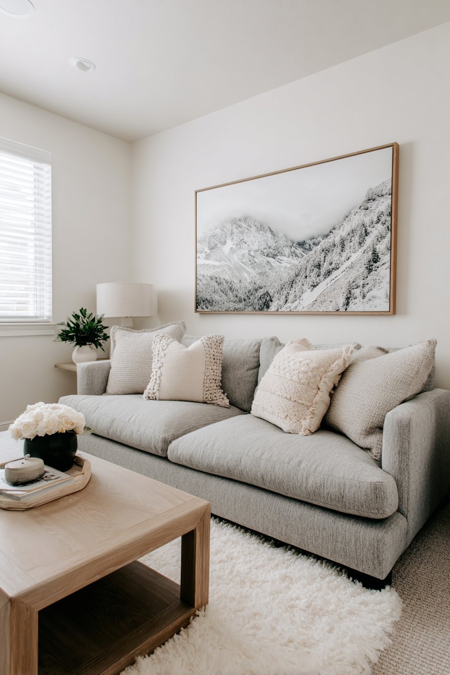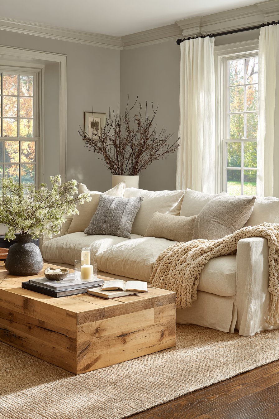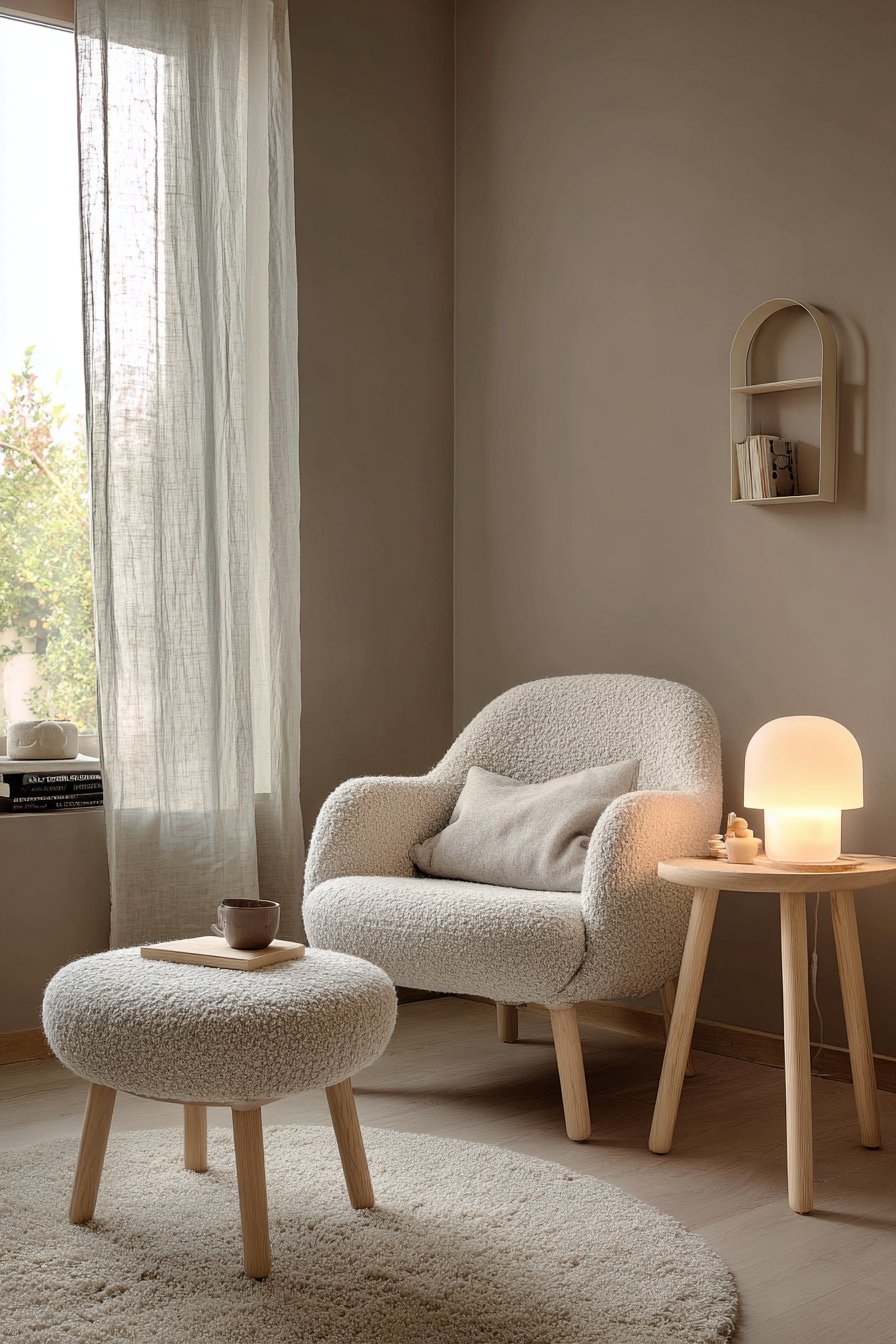 Walls in greige with subtle warm undertones create a cocoon-like atmosphere that feels protective and comforting. Table lamps with natural linen shades positioned on side tables provide warm ambient lighting that enhances the room’s cozy character, particularly important during evening hours when natural light fades. The combination of plush fabrics, natural materials, and warm lighting creates an irresistibly comfortable retreat.