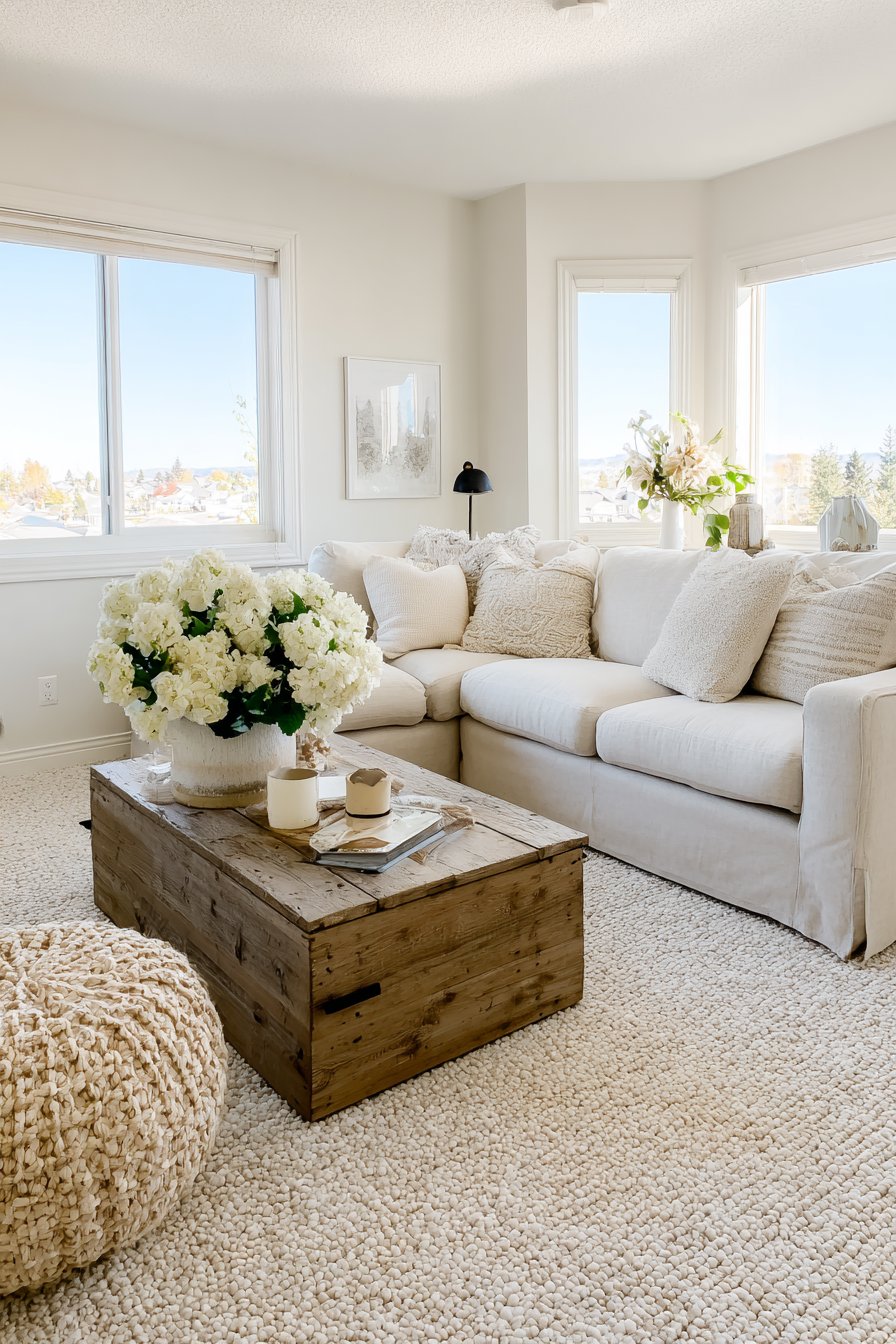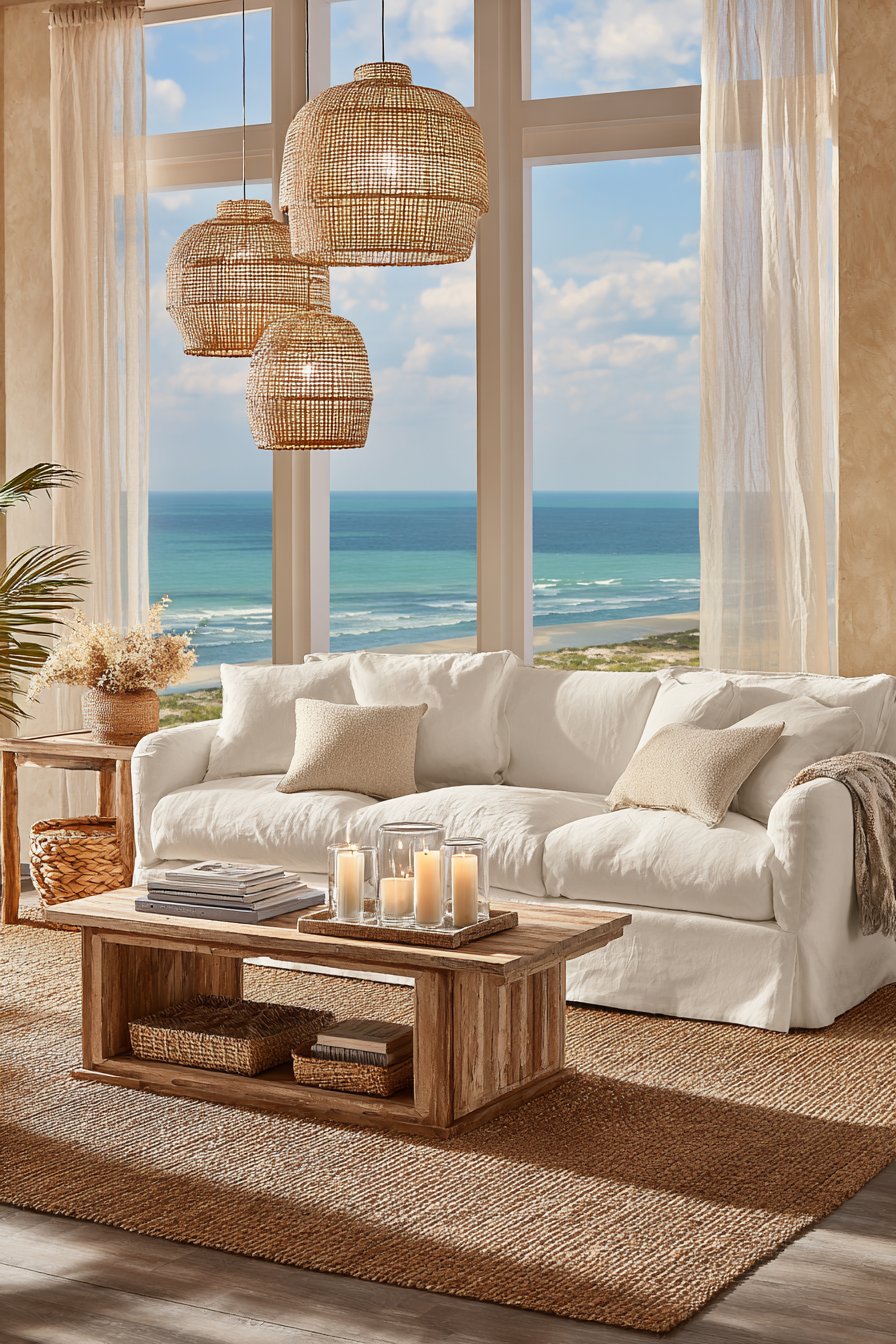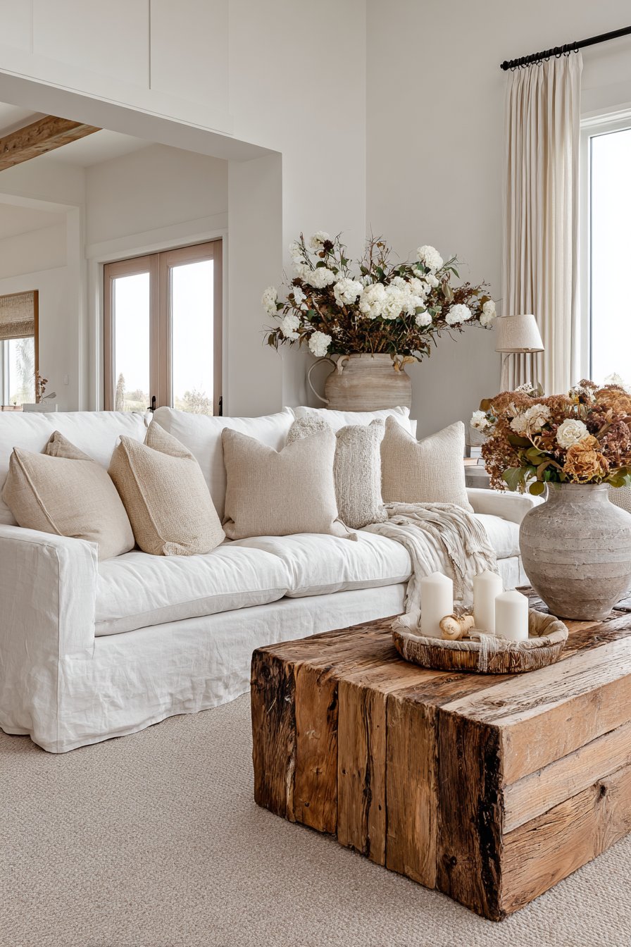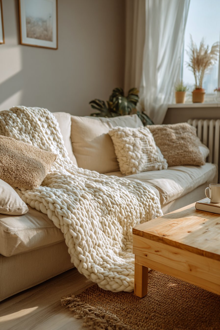 The foundation of this inviting space centers on a comfortable cream-colored linen sofa with deep seating and generously proportioned loose cushions that practically invite you to sink in and stay awhile. The sofa’s relaxed silhouette and natural fabric create an atmosphere of effortless elegance, while chunky knit throw blankets in oatmeal and natural cotton draped casually across the arms suggest a lived-in warmth that makes guests feel immediately at home.