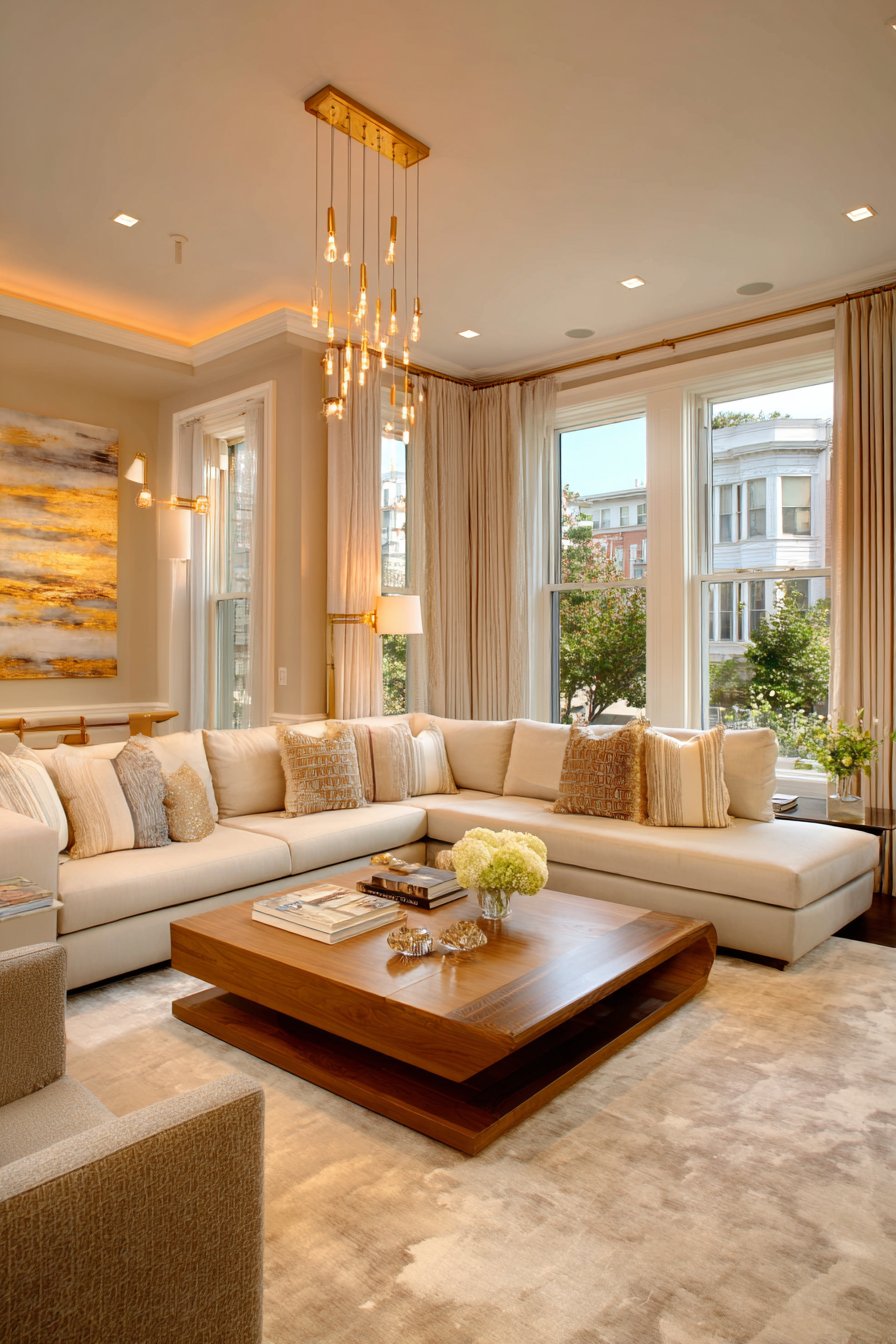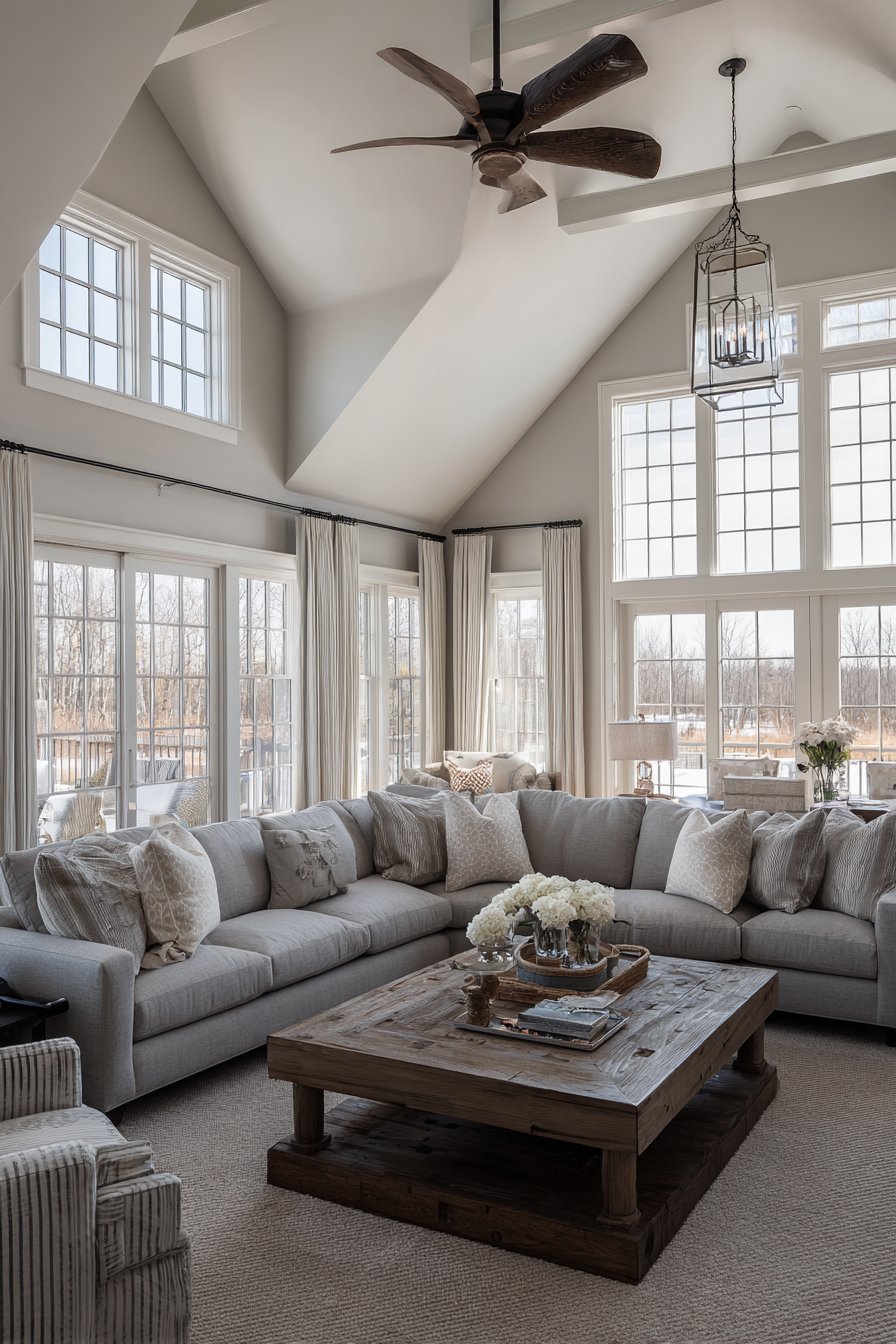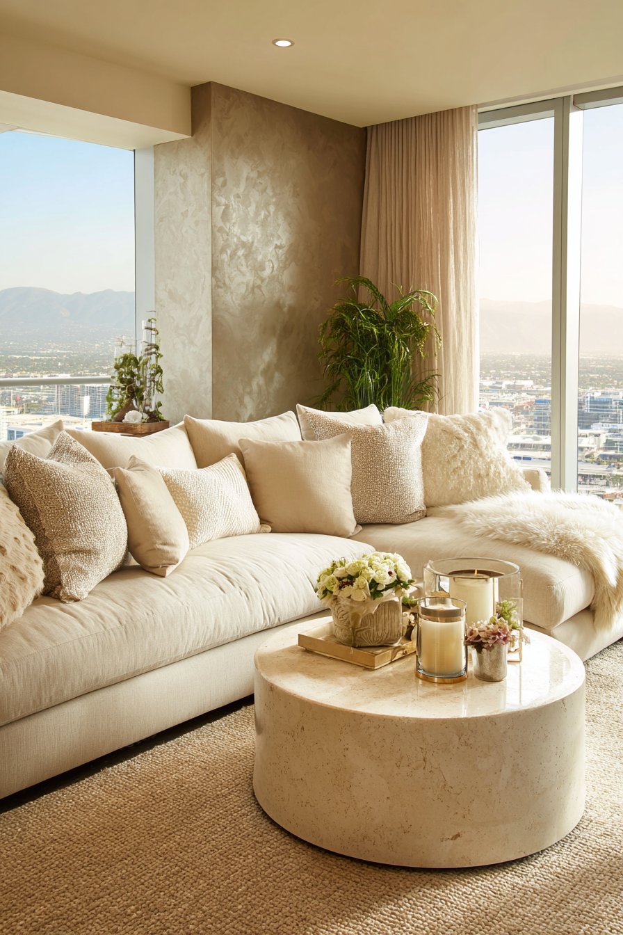 This design addresses the unique opportunities and challenges of rooms with dramatic high ceilings. A tall neutral-toned sectional appropriately scaled for the vertical space prevents furniture from appearing dwarfed by the room’s proportions. The sectional’s substantial height and presence anchor the space while its neutral upholstery maintains visual calm despite its size.