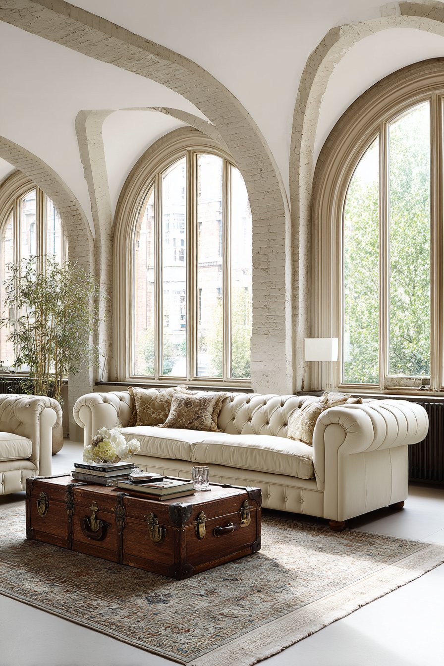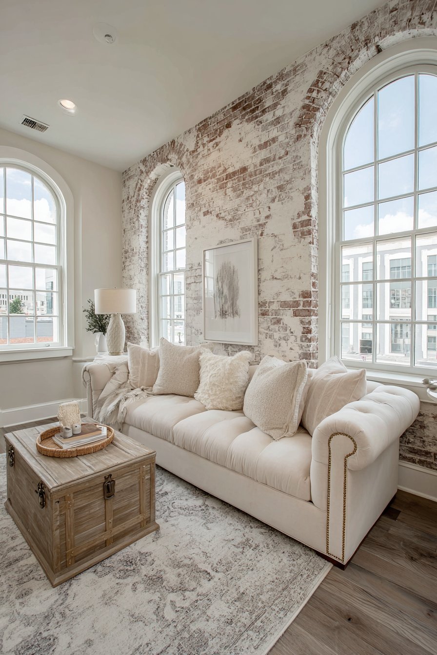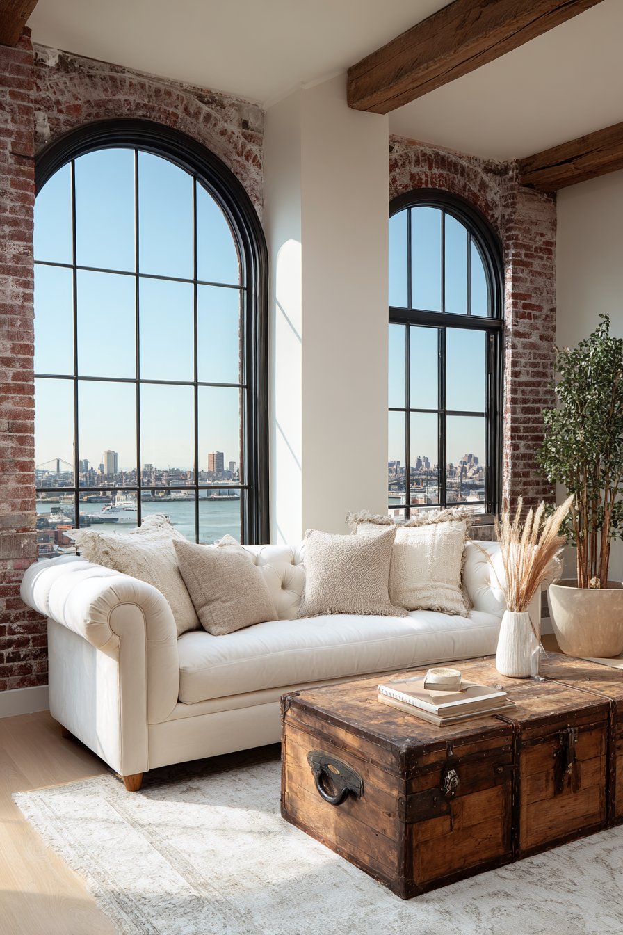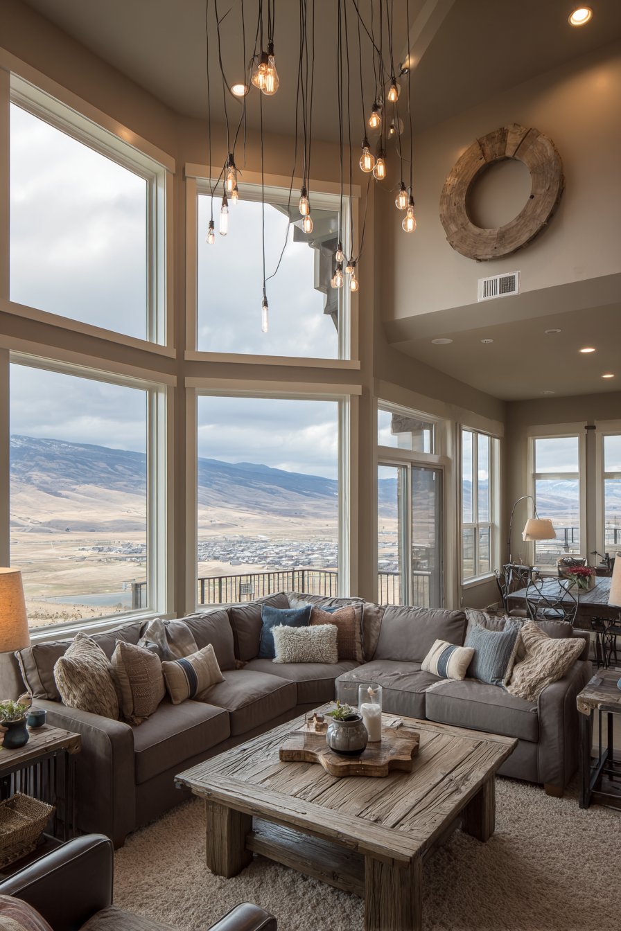 This design addresses the unique opportunities and challenges of rooms with dramatic high ceilings. A tall neutral-toned sectional appropriately scaled for the vertical space prevents furniture from appearing dwarfed by the room’s proportions. The sectional’s substantial height and presence anchor the space while its neutral upholstery maintains visual calm despite its size.