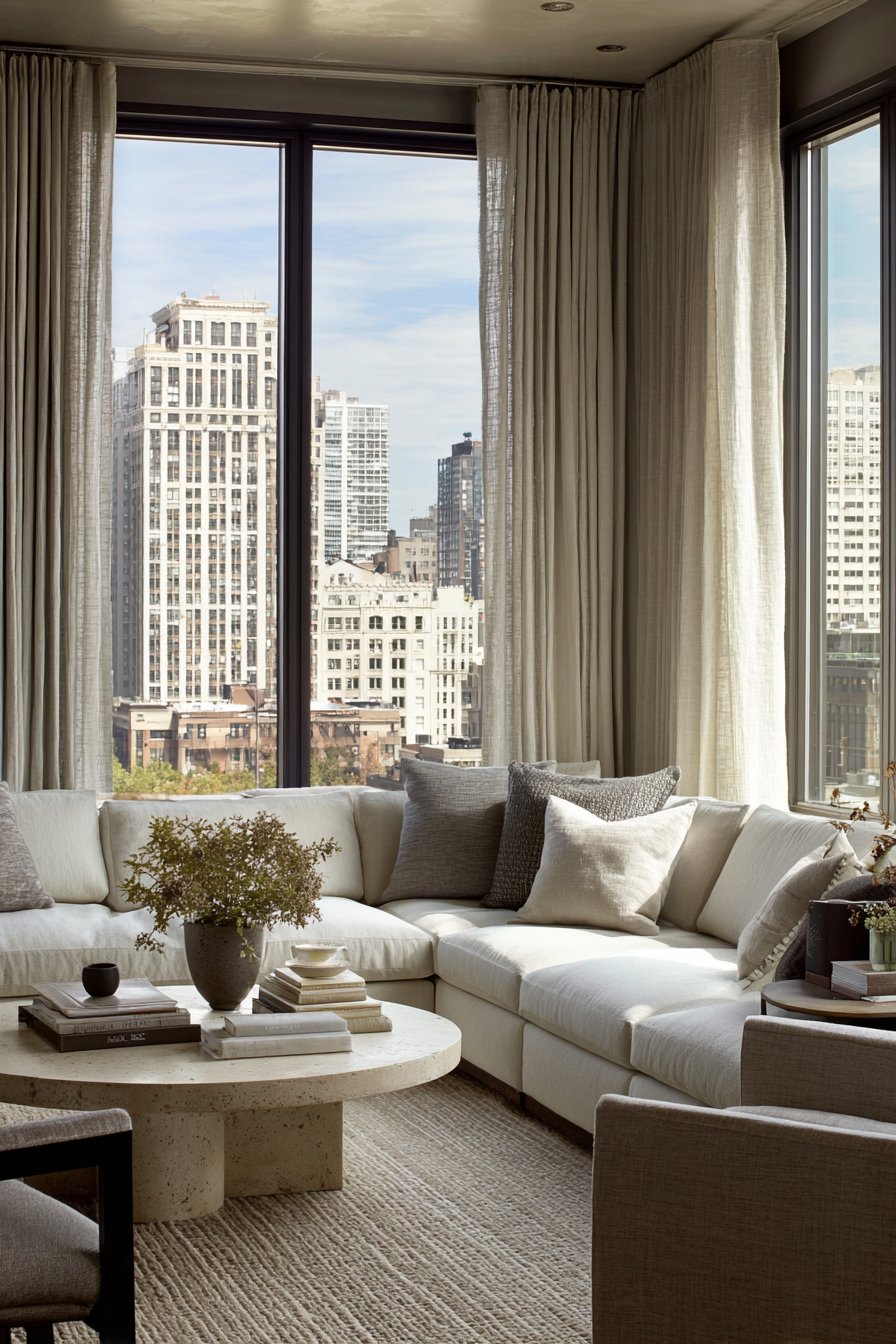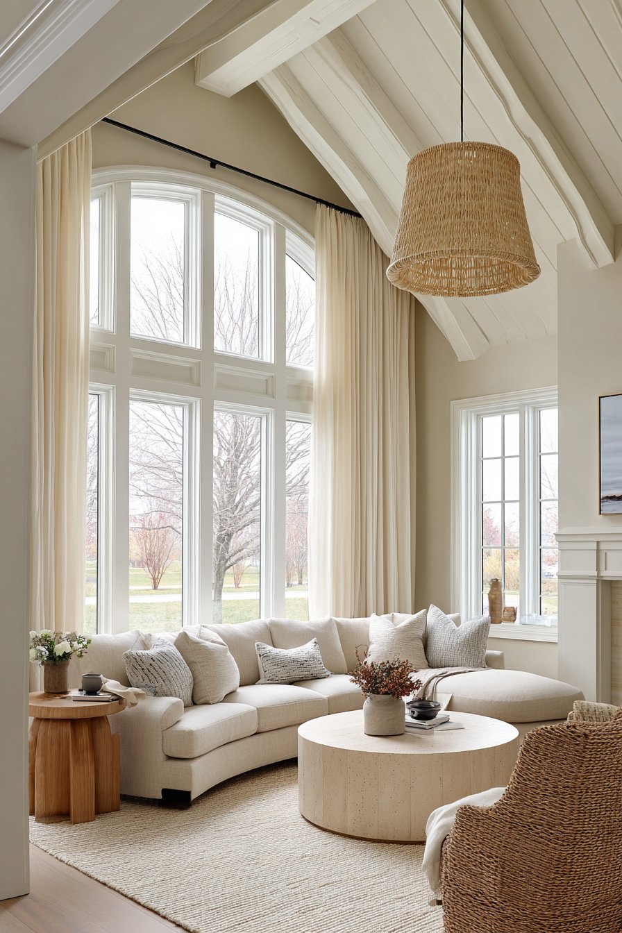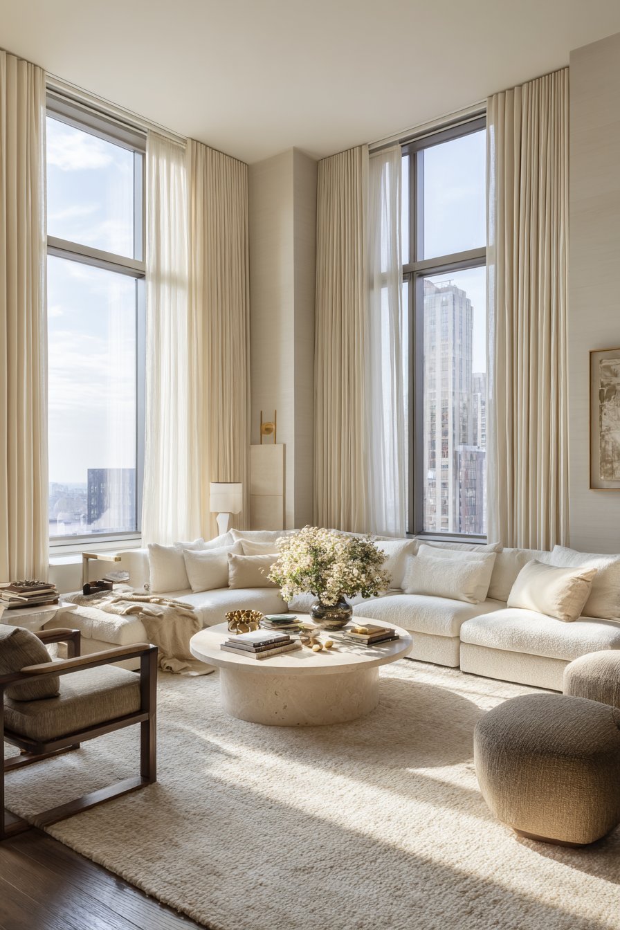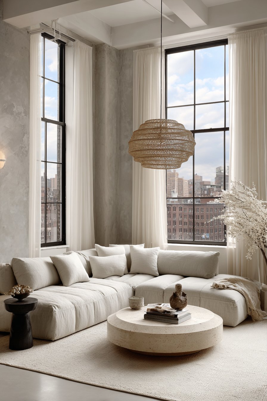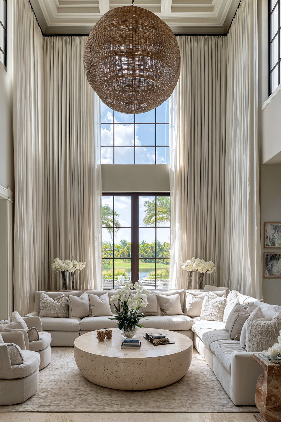 An oversized round coffee table in light travertine provides generous surface area while its circular form softens the angular seating arrangement. The table’s scale must be substantial enough to balance the tall sectional without being overwhelmed. Floor-to-ceiling sheer linen curtains in ivory emphasize the room’s height, drawing the eye upward and celebrating the architectural volume.