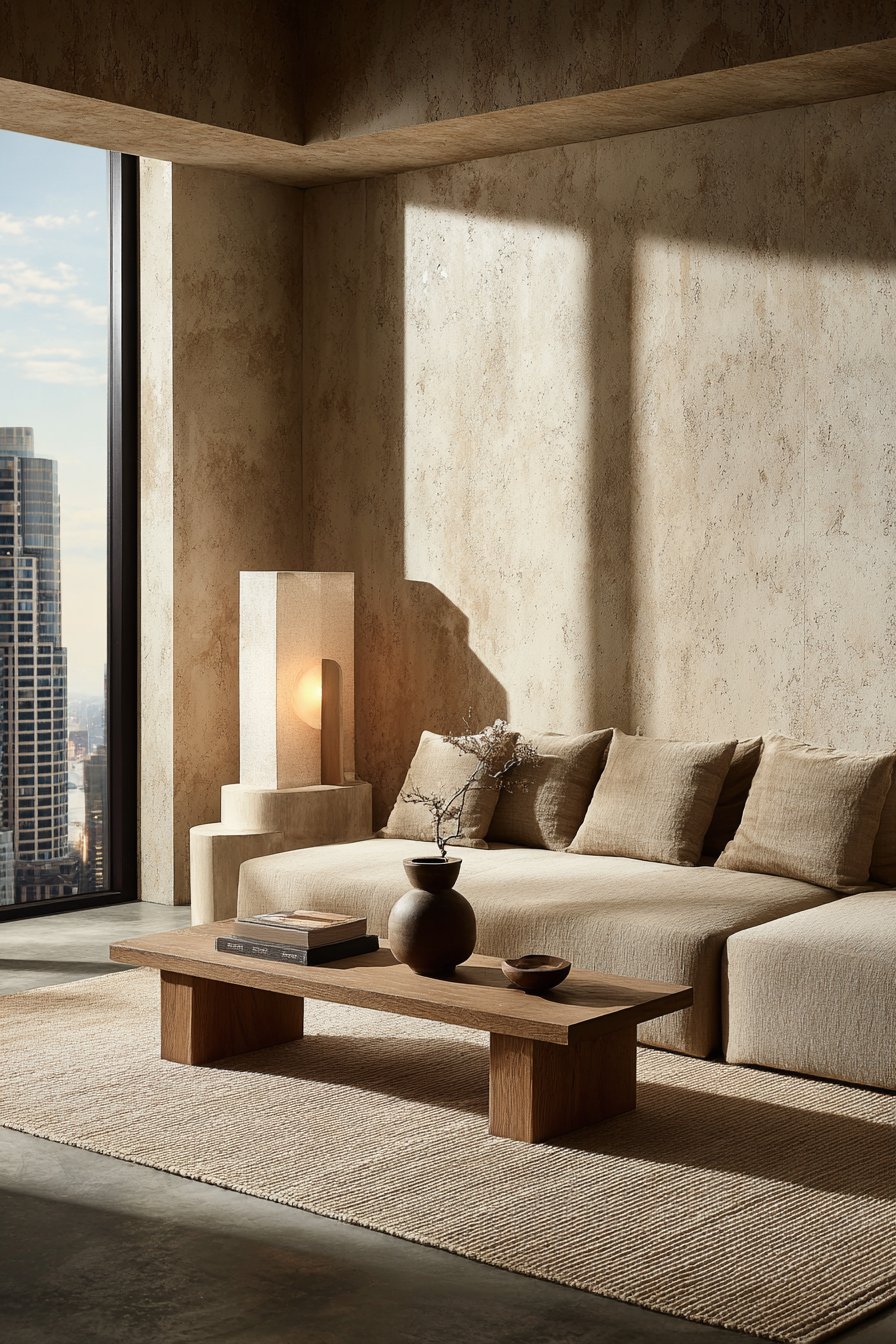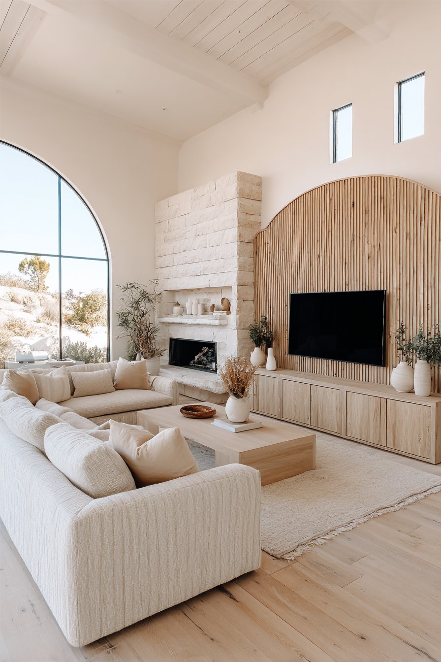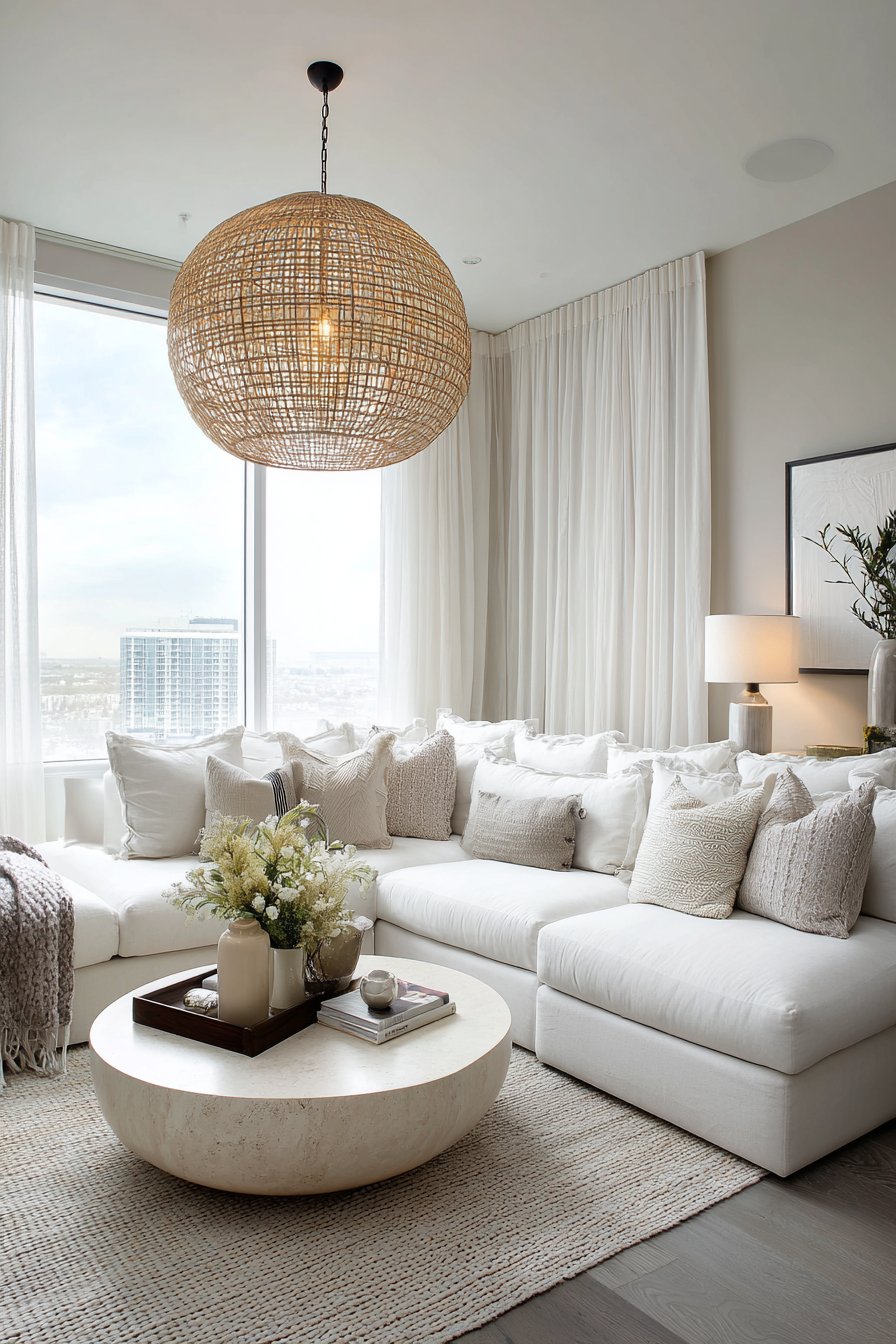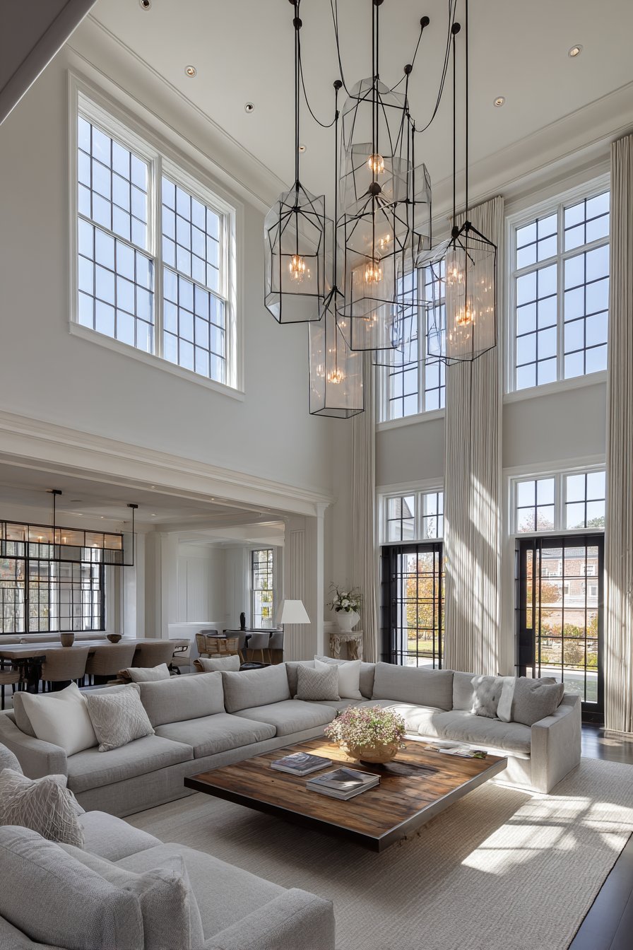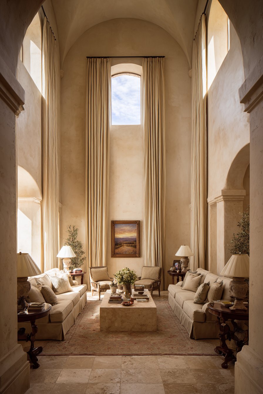 An oversized round coffee table in light travertine provides generous surface area while its circular form softens the angular seating arrangement. The table’s scale must be substantial enough to balance the tall sectional without being overwhelmed. Floor-to-ceiling sheer linen curtains in ivory emphasize the room’s height, drawing the eye upward and celebrating the architectural volume.