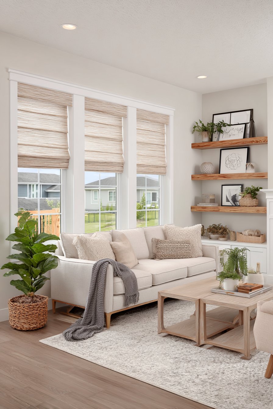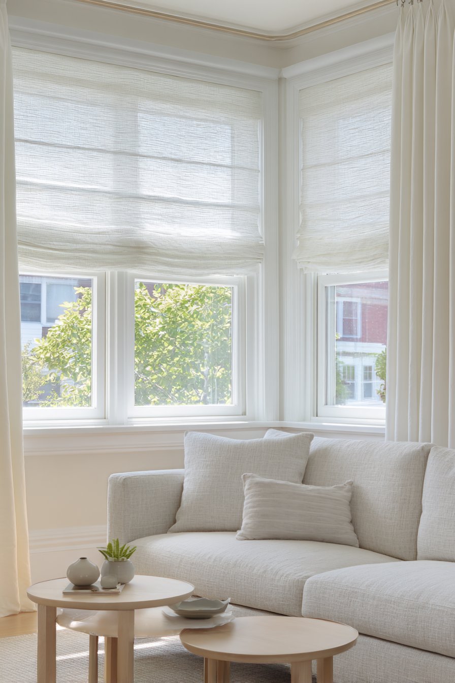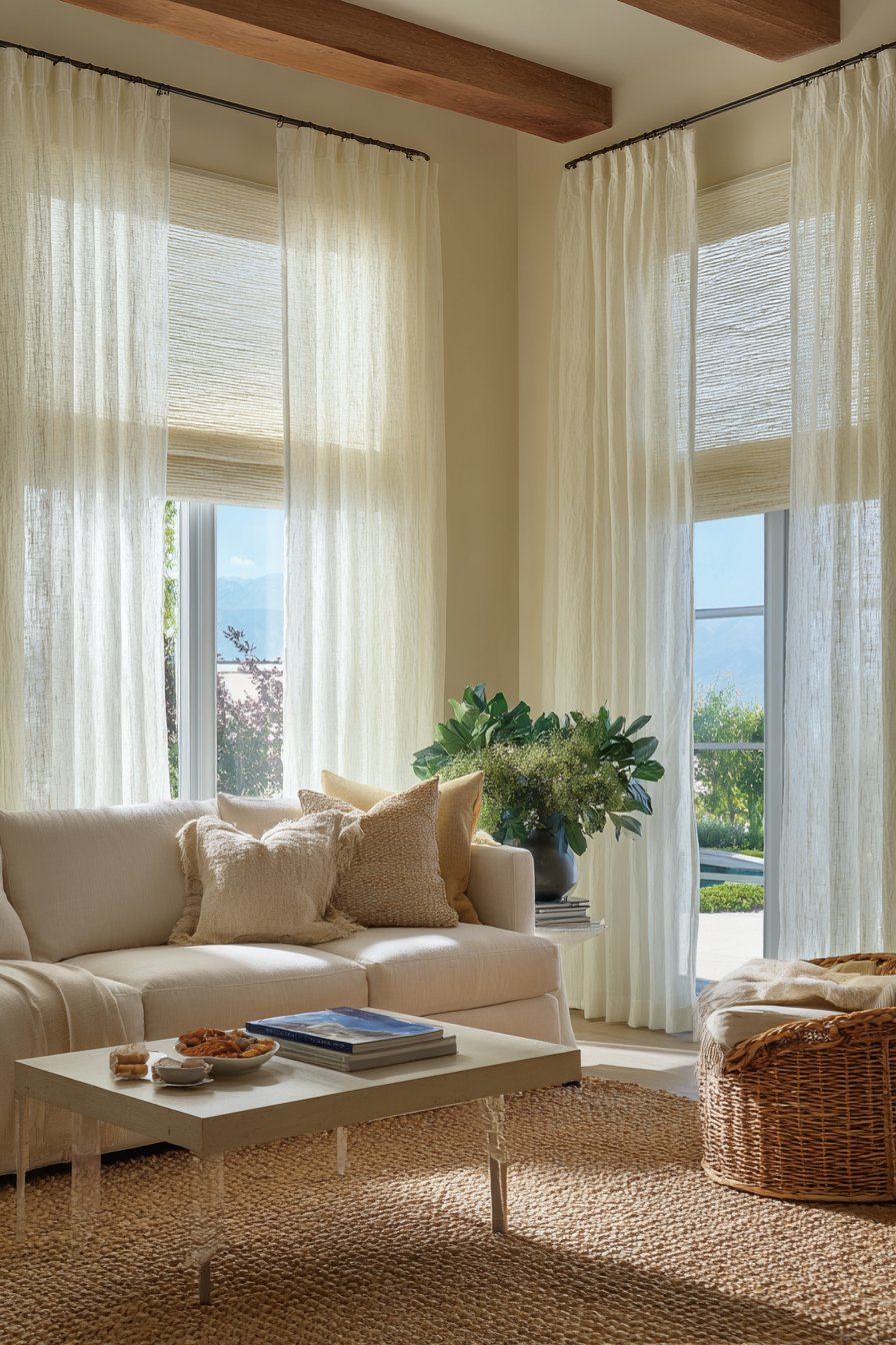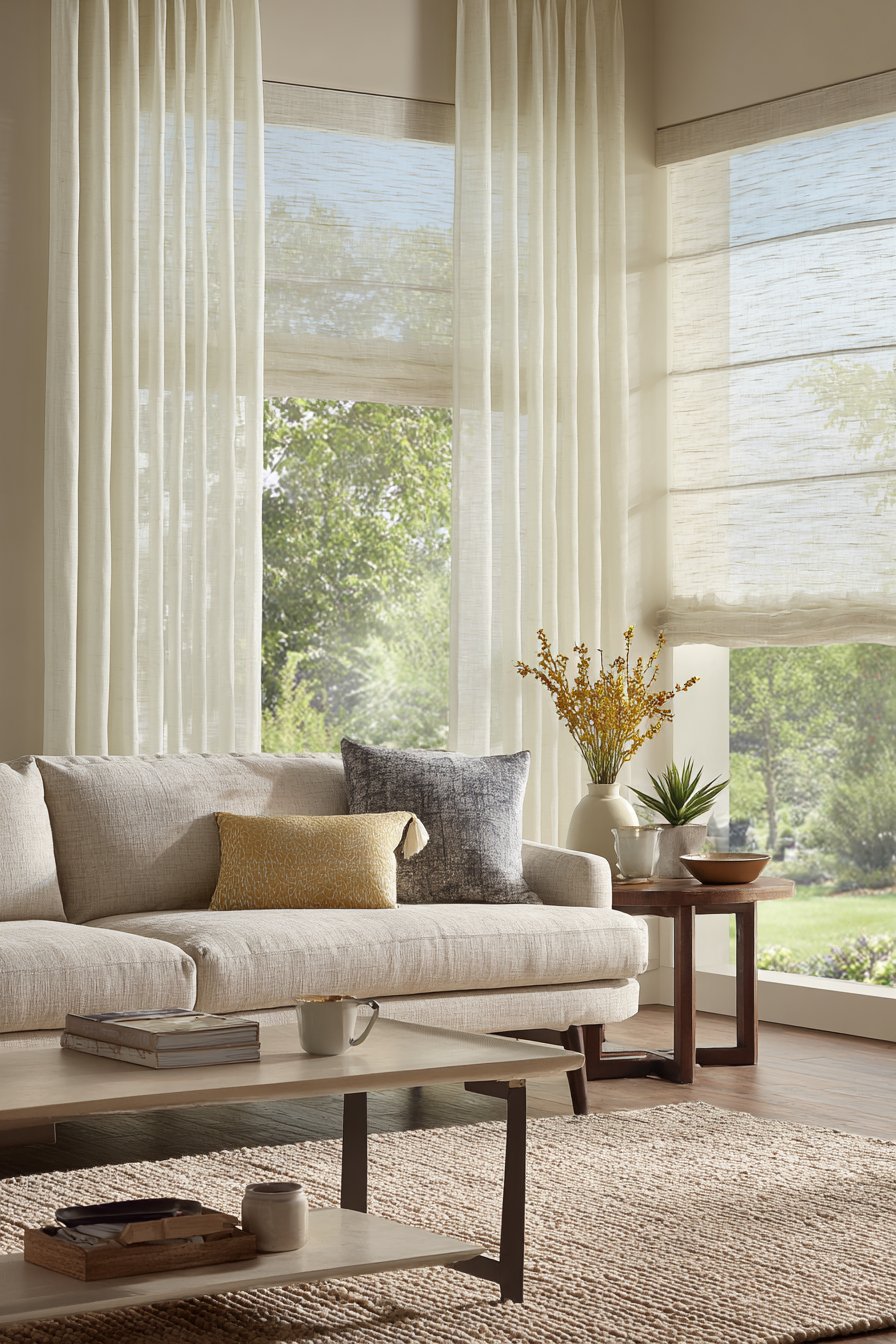 A beige sofa positioned to enjoy the filtered natural light benefits from the flexible control these layered treatments provide. On bright days, the sheers alone might suffice, while evening or harsh afternoon sun might require lowering the roman shades. Paired with a light wood coffee table and neutral woven rug, the arrangement creates a comfortable spot for reading or conversation.