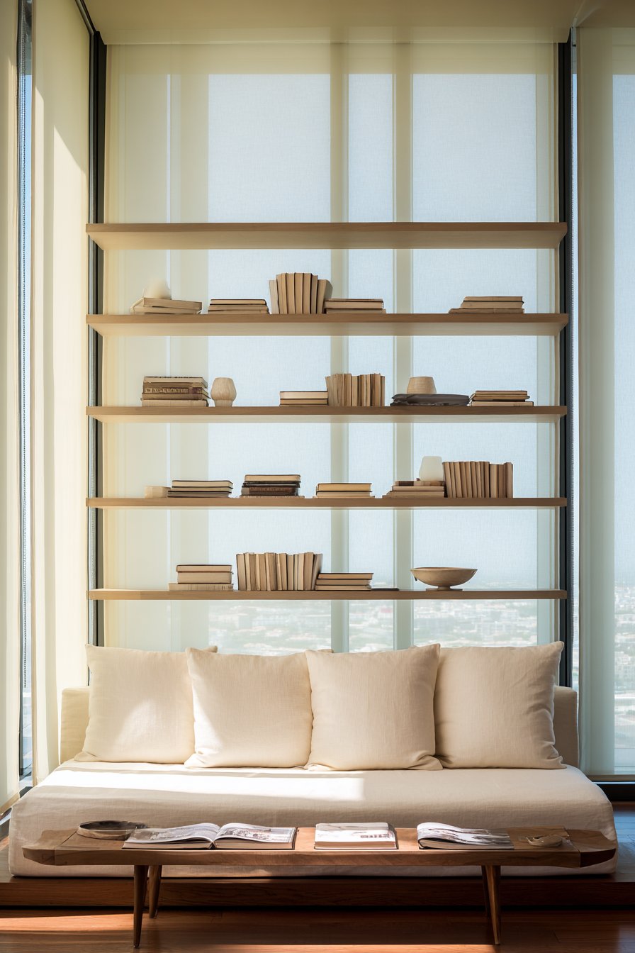- Select low-profile furniture to create visual calm and emphasize horizontal lines