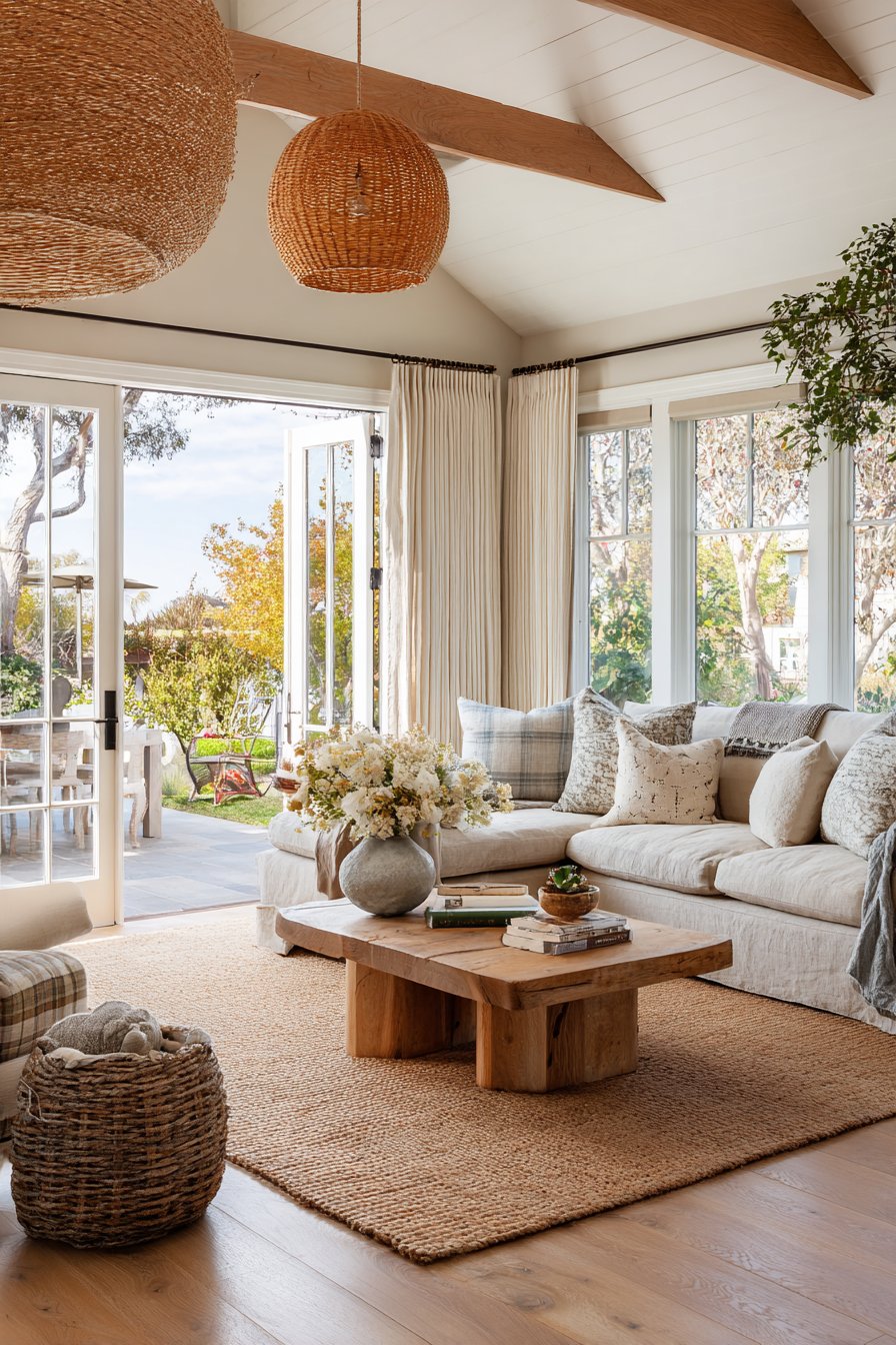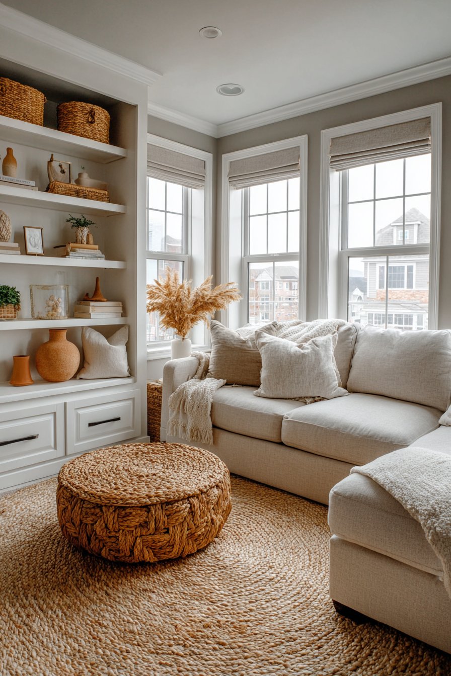 A woven seagrass ottoman serves as a coffee table alternative, introducing natural texture while providing flexible functionality. The ottoman can be used for seating, as a footrest, or as a surface for trays and accessories, making it an especially practical choice for casual family living. Its organic material and rounded form soften the room’s geometry while maintaining the neutral aesthetic.