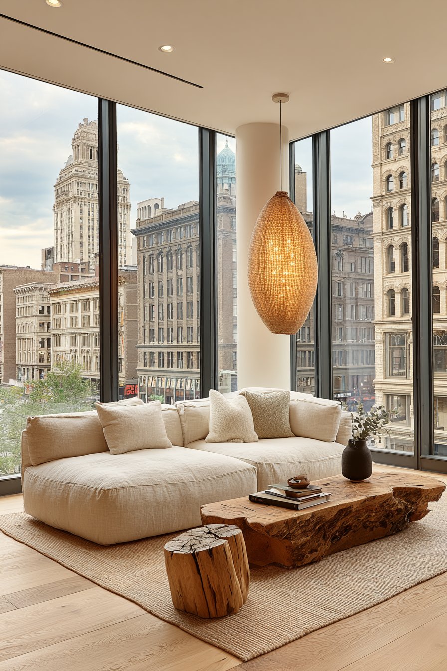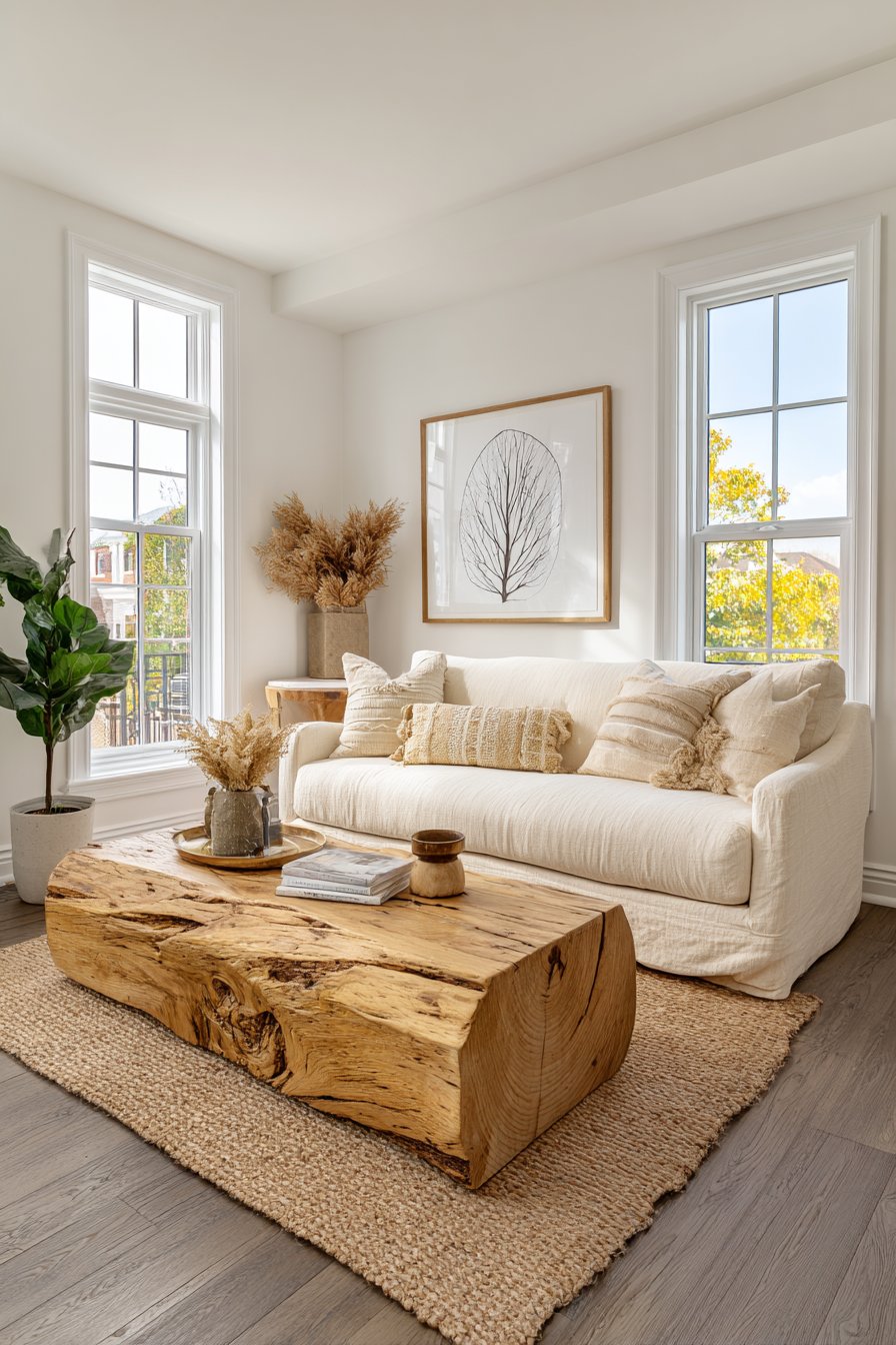 A chunky braided wool rug in cream anchors the seating arrangement, its substantial texture adding weight and warmth underfoot. The rug’s handcrafted quality is evident in the irregular braiding and slight variations in tone—imperfections that actually enhance its appeal and authenticity. Above this foundation, a live-edge wood coffee table celebrates the tree’s natural form, with the bark edge preserved to showcase the wood’s organic origins.