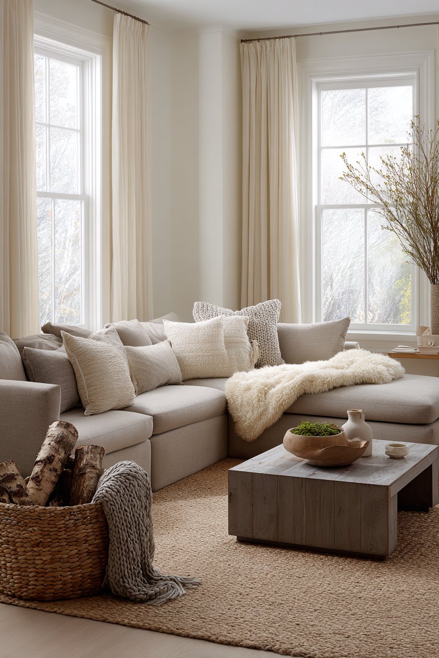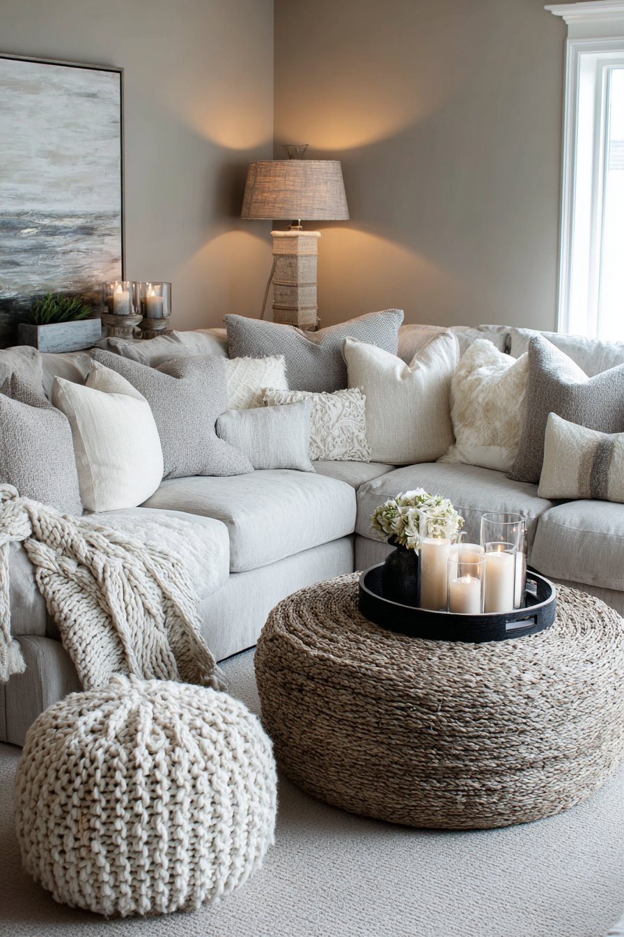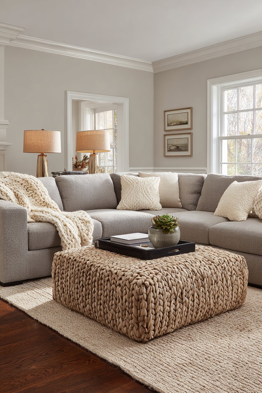 This design prioritizes tactile comfort through extensive use of varied textures, beginning with an oversized sectional upholstered in warm grey chenille fabric. The chenille’s plush pile creates a soft, inviting surface that begs to be touched, while the sectional’s generous proportions ensure ample seating for family gatherings. Layered cable knit throws and linen pillows in cream and taupe add dimension and visual richness.