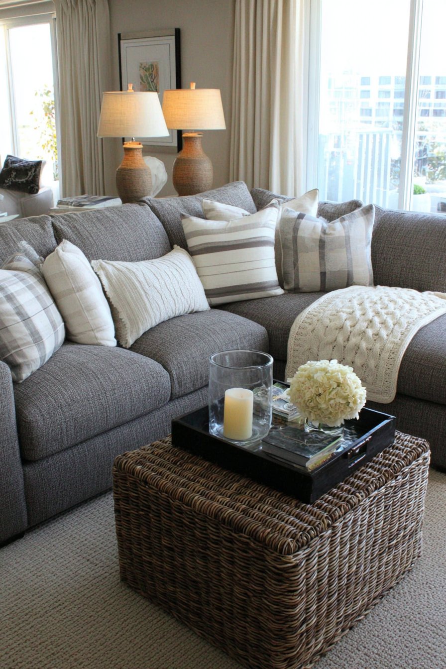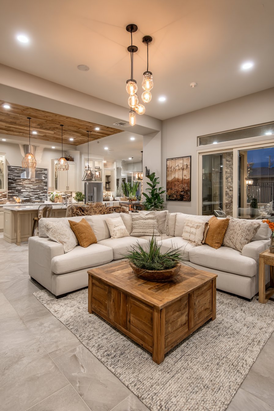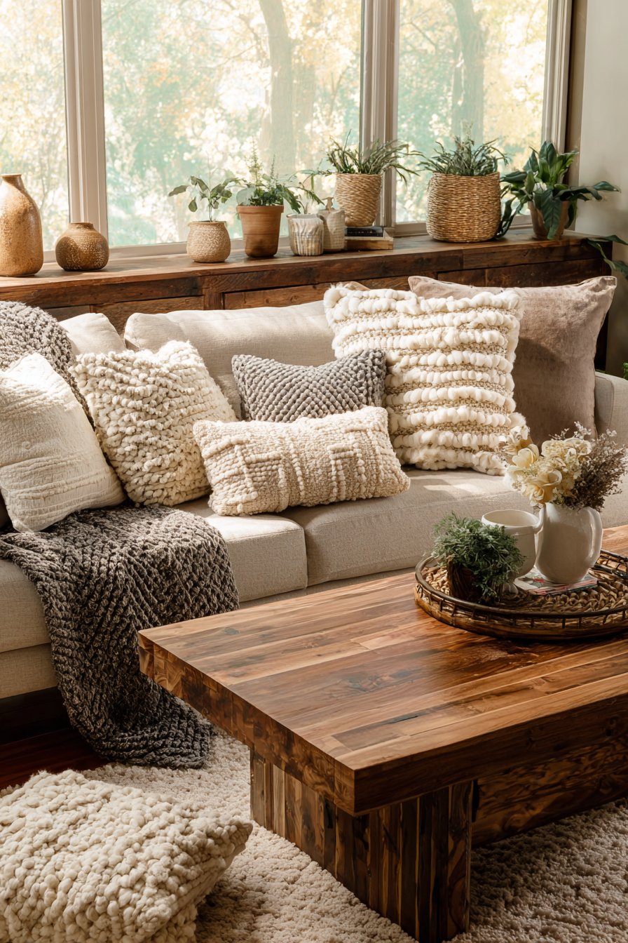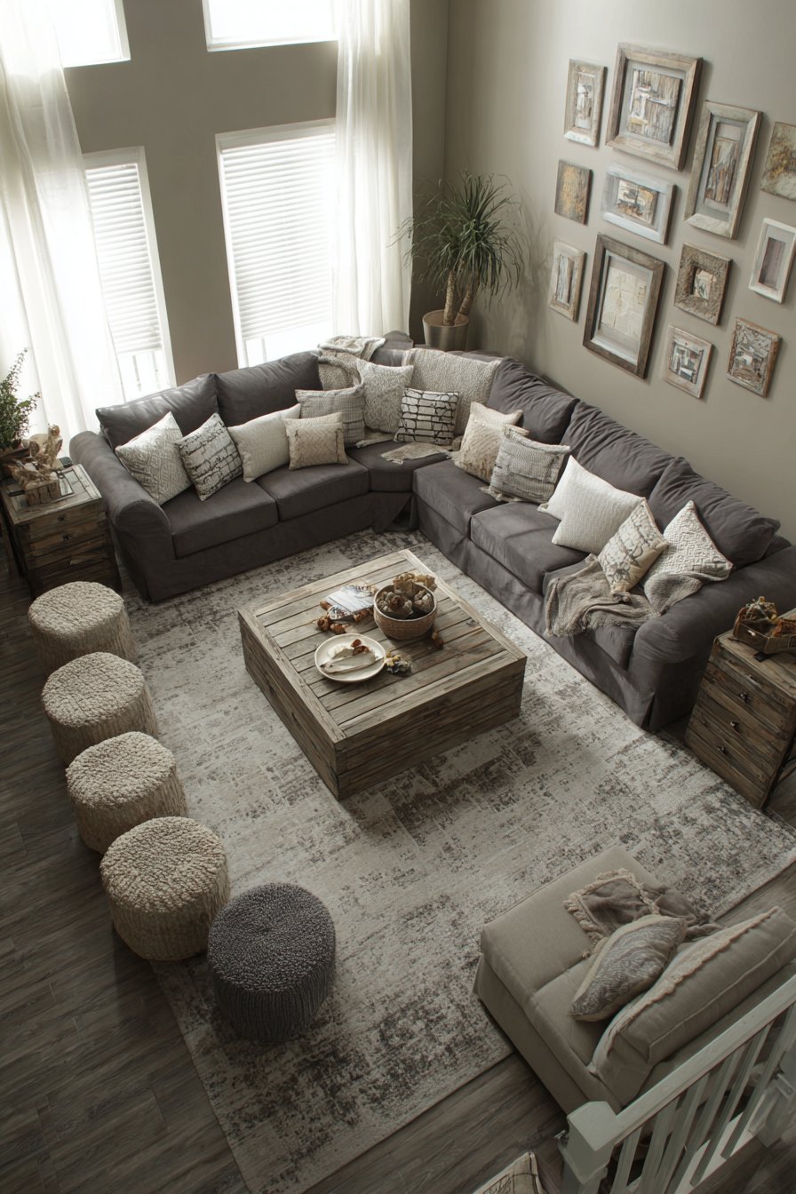 This design prioritizes tactile comfort through extensive use of varied textures, beginning with an oversized sectional upholstered in warm grey chenille fabric. The chenille’s plush pile creates a soft, inviting surface that begs to be touched, while the sectional’s generous proportions ensure ample seating for family gatherings. Layered cable knit throws and linen pillows in cream and taupe add dimension and visual richness.
