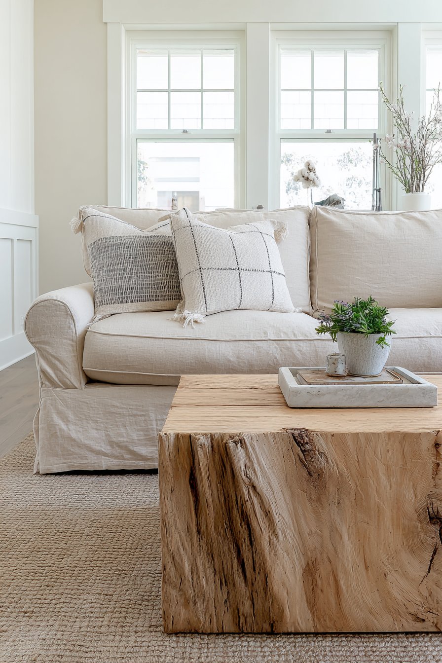 The reclaimed wood coffee table serves as a grounding element, its weathered finish introducing organic character and a sense of history to the contemporary setting. Positioned atop a hand-woven jute rug featuring subtle geometric patterns, the table creates a focal point that draws the eye while maintaining the room’s serene atmosphere. The interplay between the smooth linen upholstery and the rough-hewn wood demonstrates how contrasting textures can elevate a monochromatic scheme.