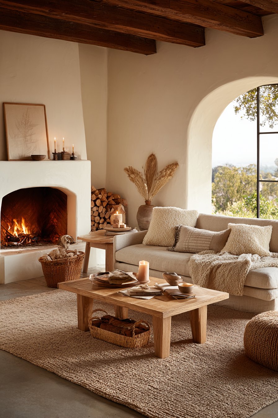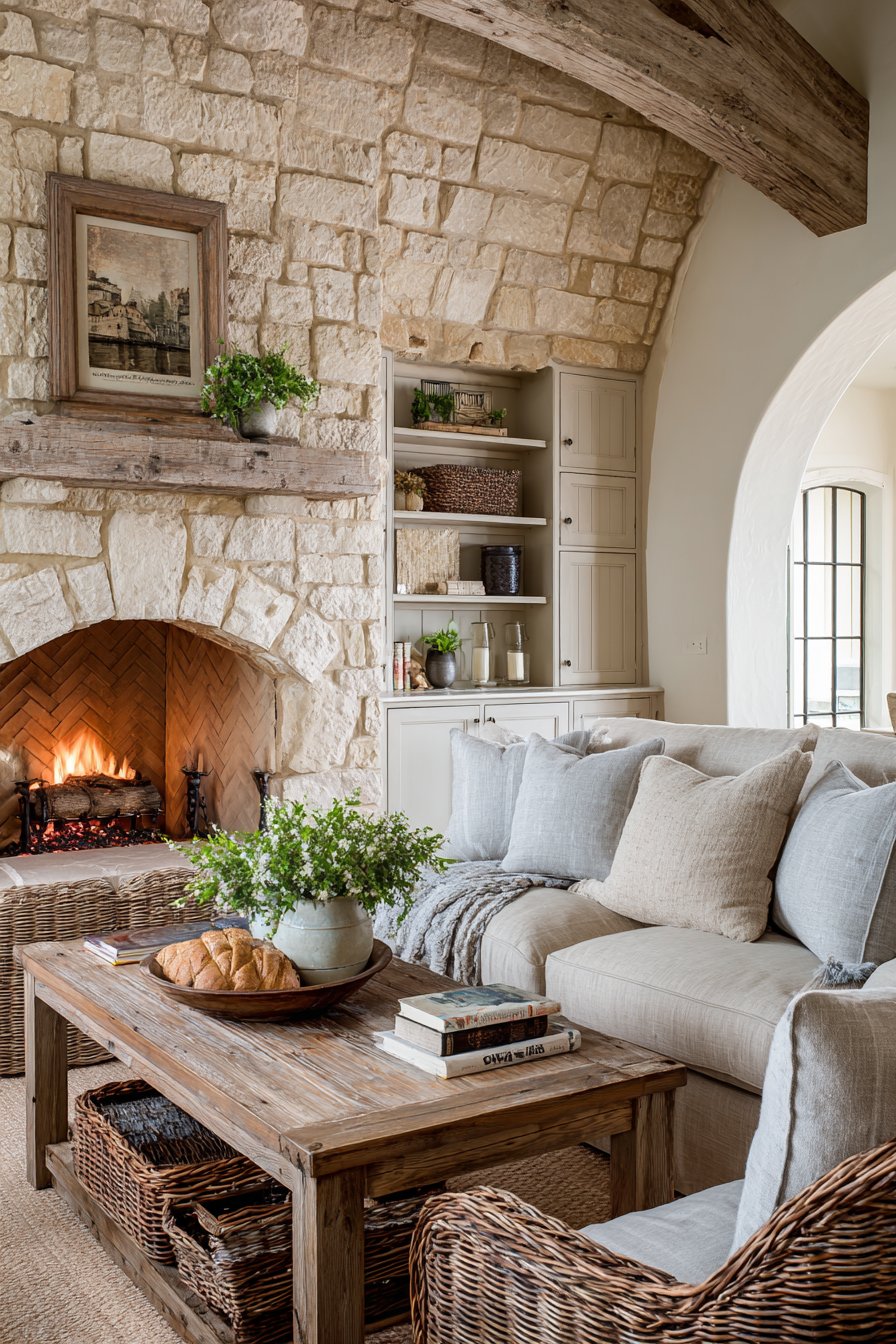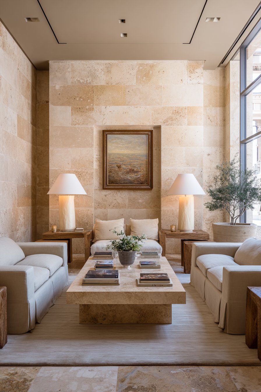 Soft grey-beige walls complement the cream limestone while providing subtle color variation that prevents the entirely neutral room from feeling flat. The combination of natural firelight and daylight creates warm ambiance that shifts throughout the day, with the neutral surfaces reflecting and amplifying both light sources. During evening hours, the fireplace becomes a glowing focal point that transforms the room’s atmosphere.