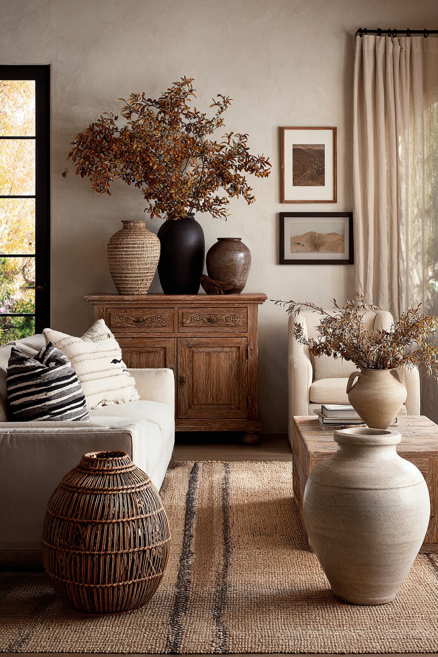 - Select handcrafted ceramic and woven objects to introduce organic authenticity
