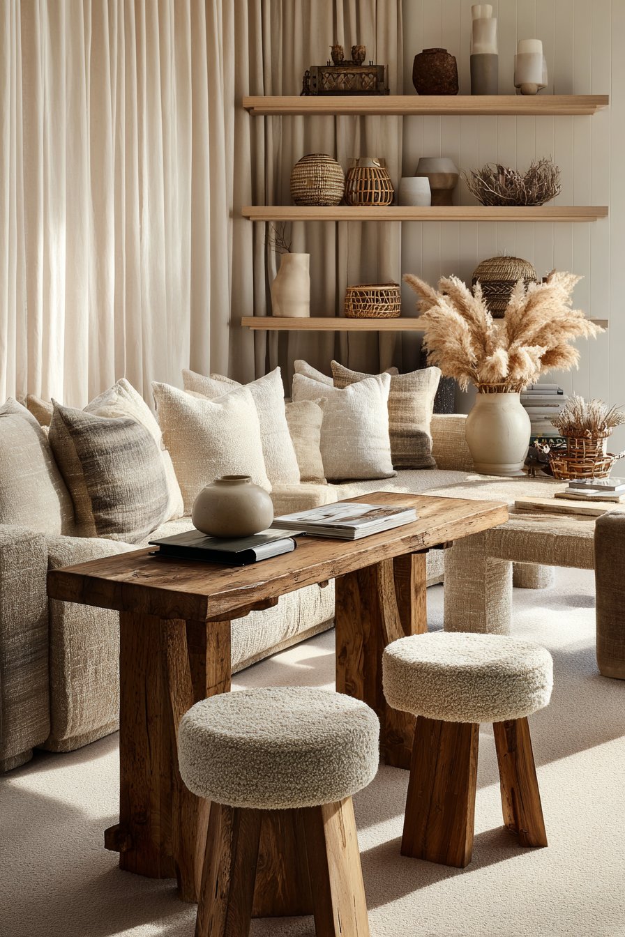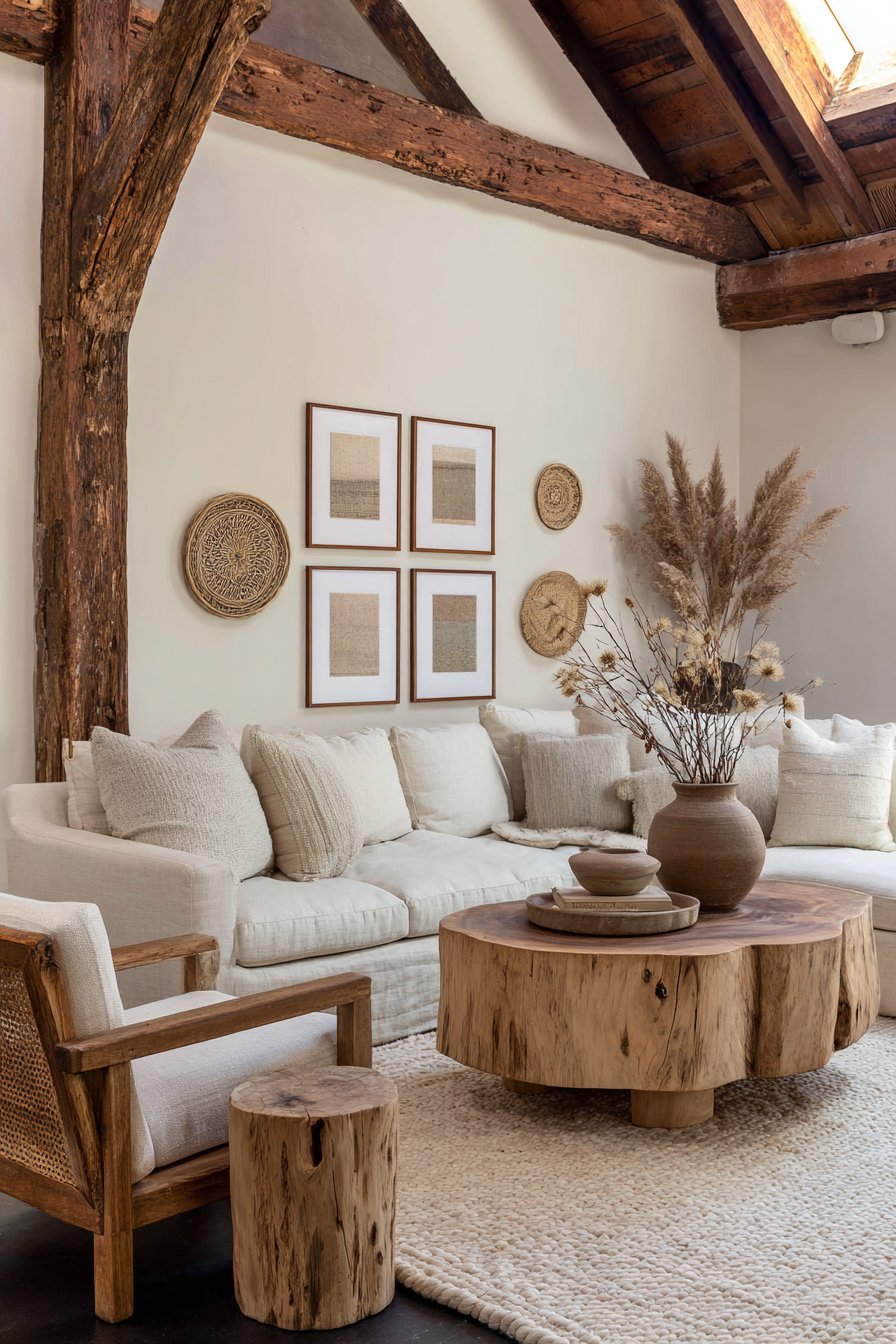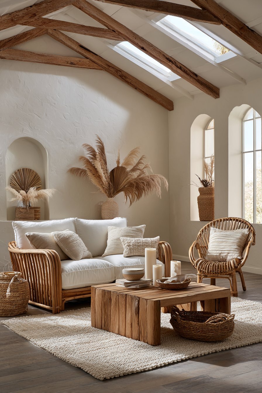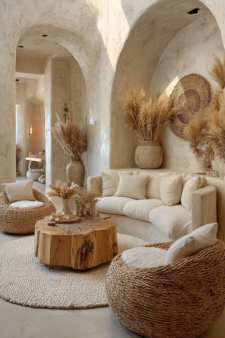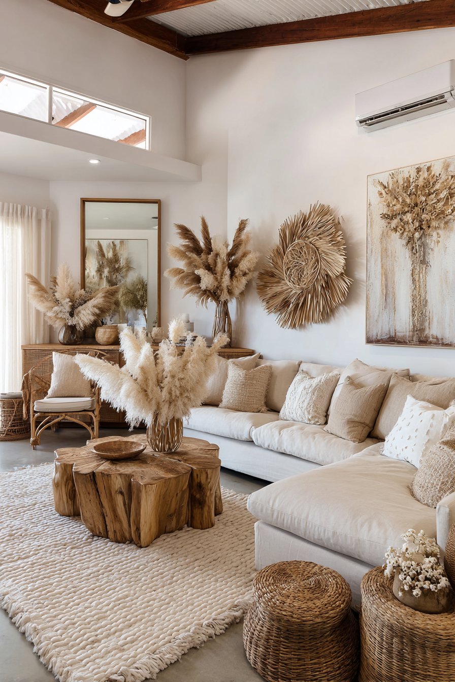 Walls in soft ivory create an airy backdrop that allows the natural materials to take center stage. Woven wall hangings and arrangements of dried pampas grass introduce additional organic elements while adding vertical interest to the composition. Natural daylight from skylights provides gentle overhead illumination that shifts throughout the day, highlighting the varied textures and creating an ever-changing play of light and shadow across the natural materials.