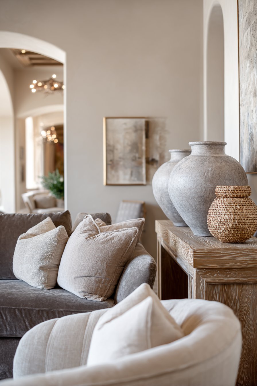 A rustic wooden console table positioned behind the sofa provides both practical storage and an opportunity for artful display. Simple ceramic vases in matte finishes and woven decorative objects arranged on its surface introduce organic shapes and handcrafted quality that prevent the monochromatic scheme from feeling too polished or cold. The console’s weathered wood finish adds character and a sense of history to the contemporary arrangement.
