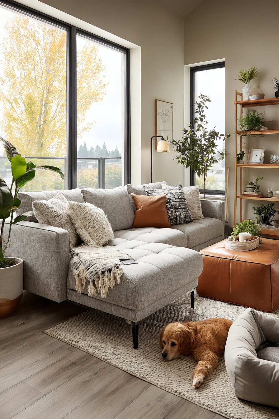 An easy-clean leather ottoman serves dual purpose as both footrest and coffee table, its material choice deliberate for pet-friendly living where spills and scratches are inevitable. Paired with a washable neutral area rug, the foundation can withstand the wear of daily pet life. Wall-mounted shelving keeps decorative items safely elevated above wagging tails and curious paws.