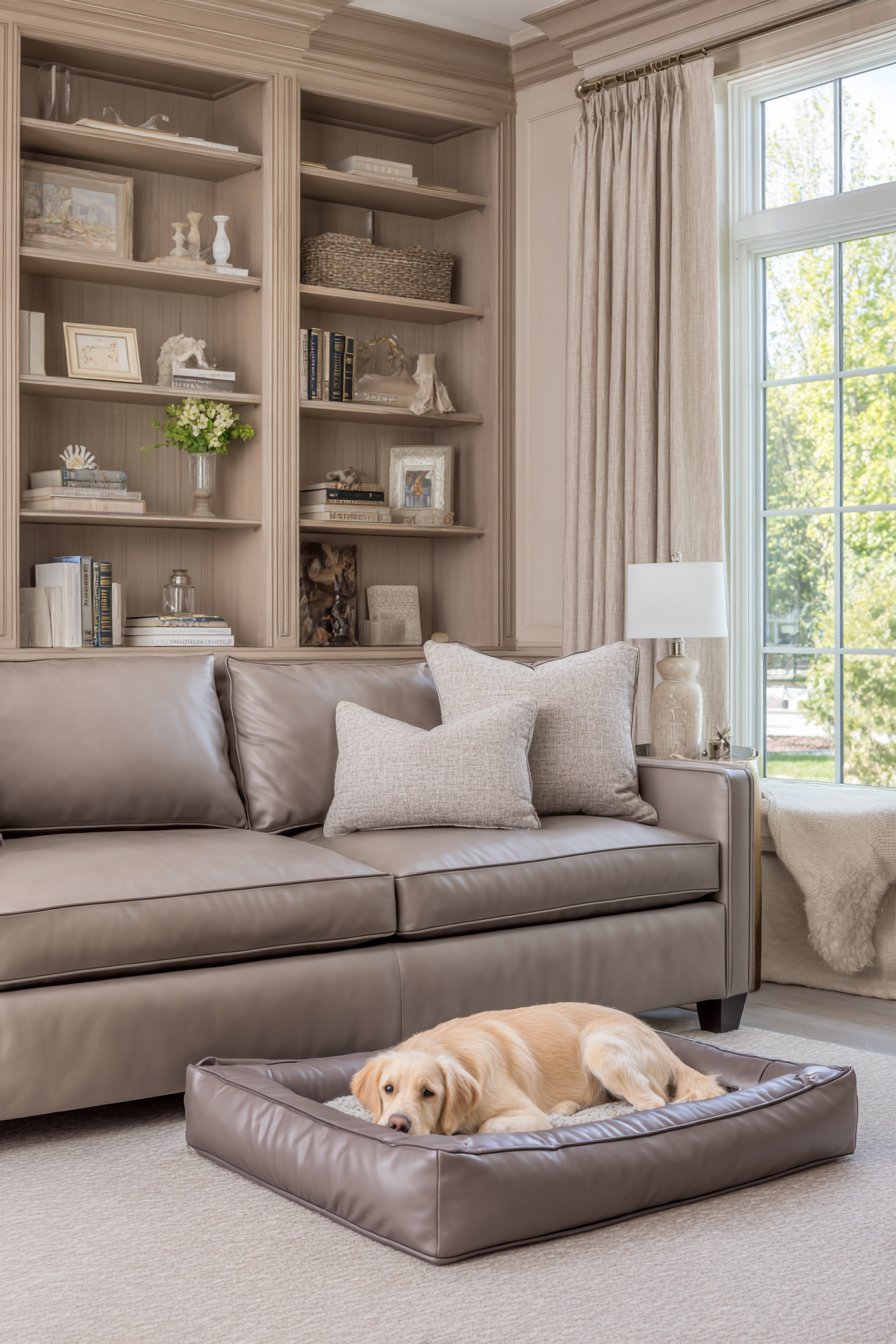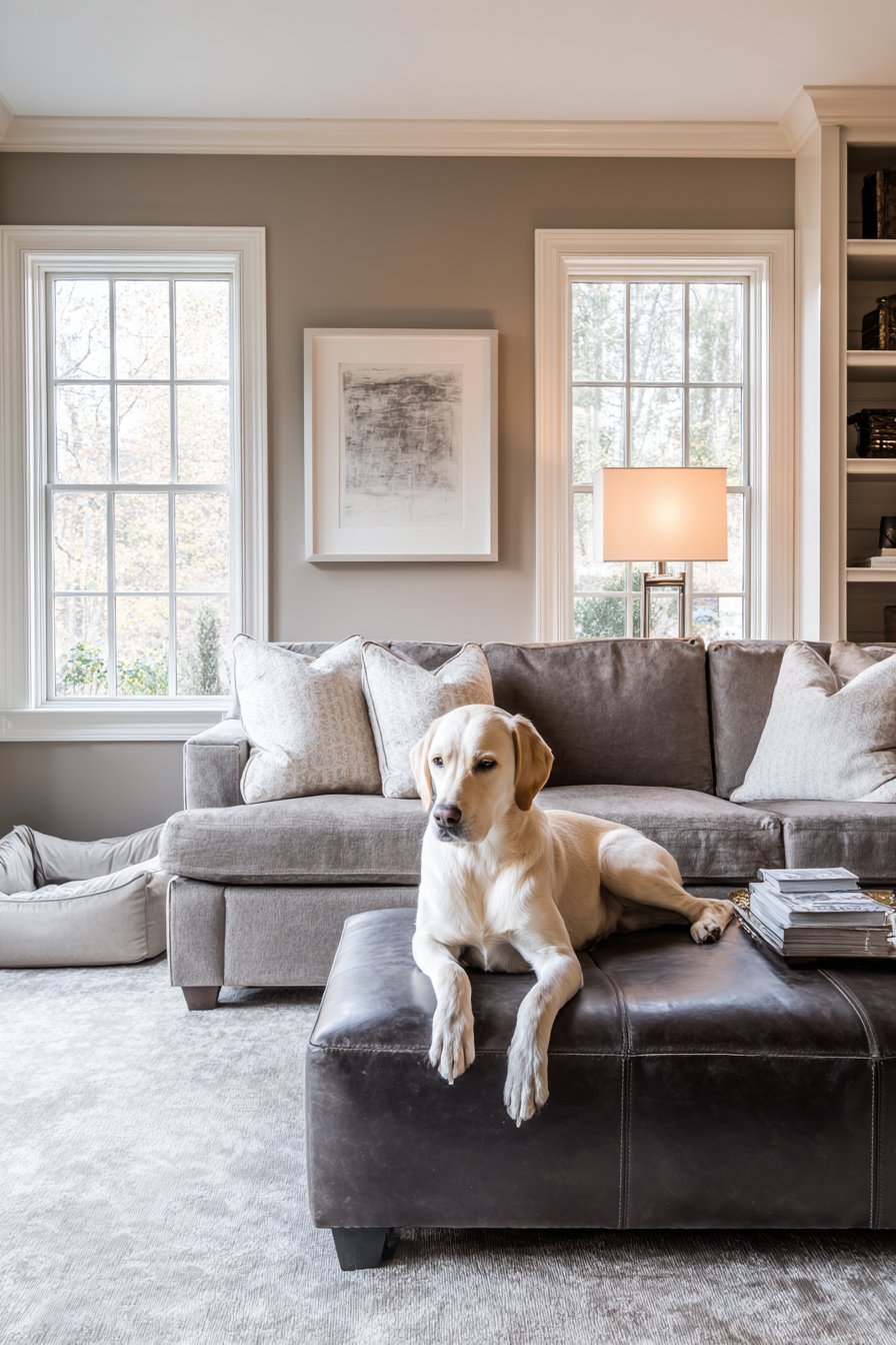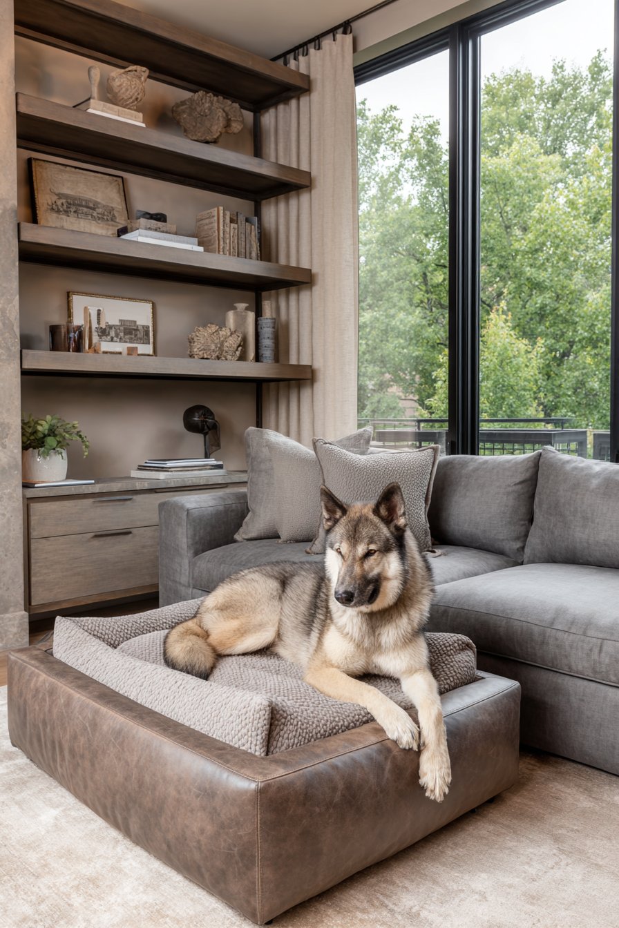 Walls in warm taupe hide minor marks and nose prints better than stark white would, a practical consideration often overlooked in design discussions. A dog bed in complementary neutral tone integrates seamlessly into the design rather than standing out as an eyesore. Natural light from large windows provides warmth while the neutral palette remains practical and beautiful despite the challenges of pet ownership.