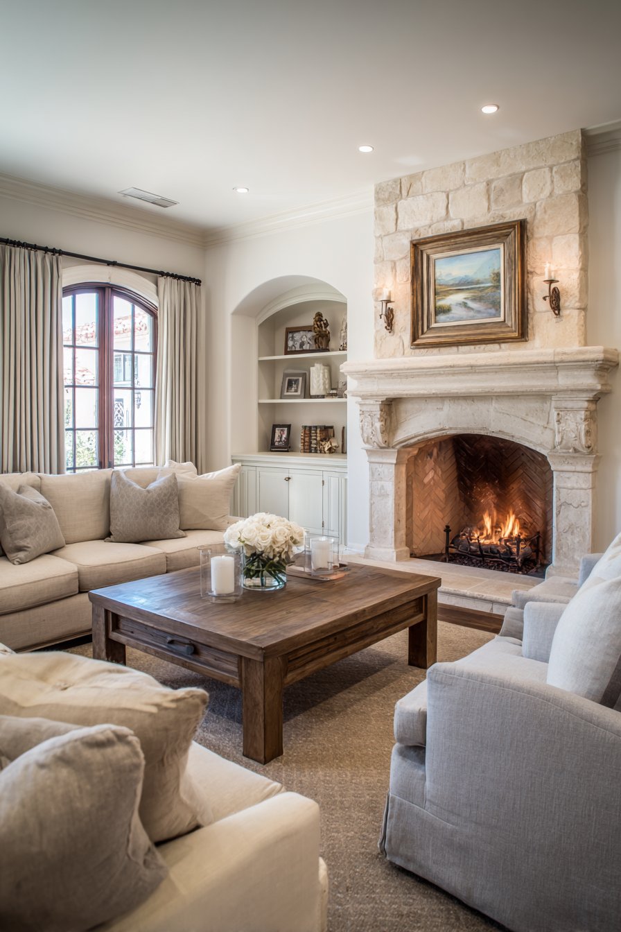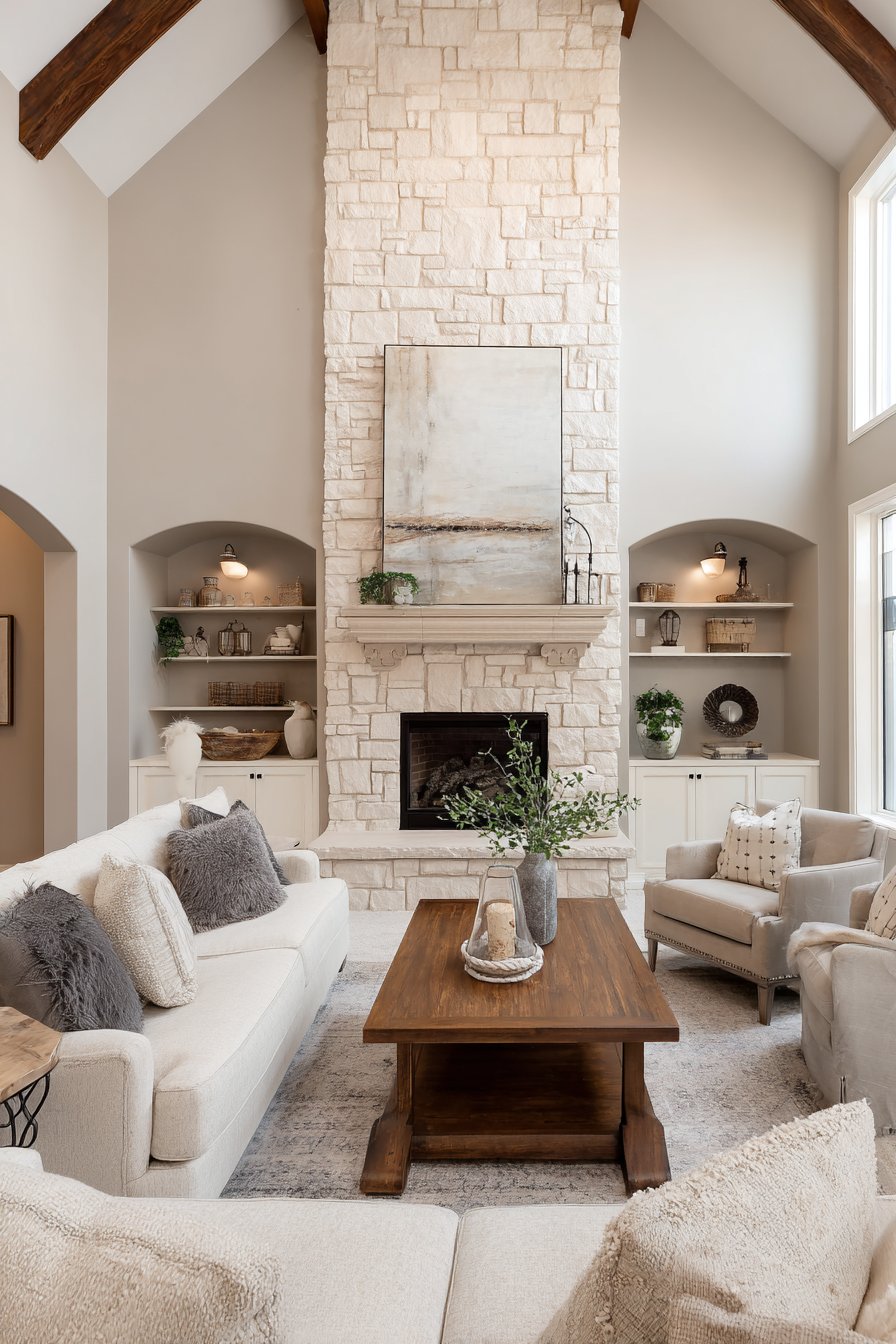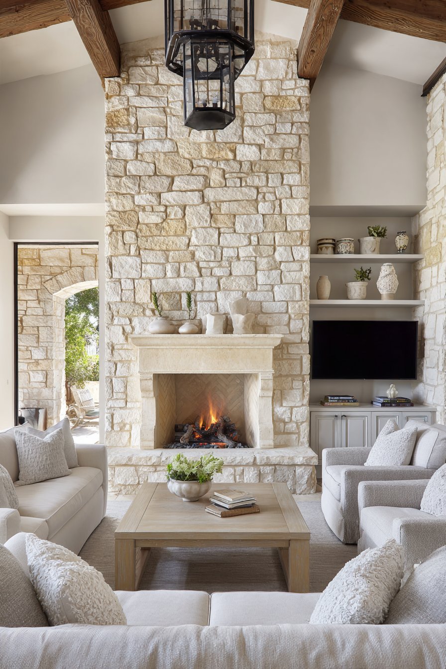 This design centers around the fireplace as the room’s architectural focal point, with a cream limestone surround and hearth creating a substantial visual anchor. The natural stone’s neutral tone and subtle variations add organic beauty while the fireplace’s prominent position determines the entire room’s furniture arrangement. Flanking built-in shelving in warm white provides symmetrical balance while offering storage and display opportunities.