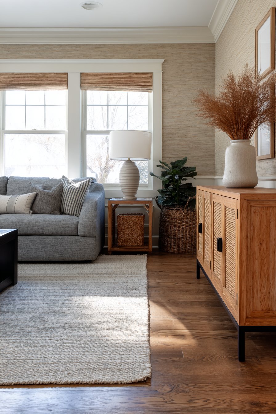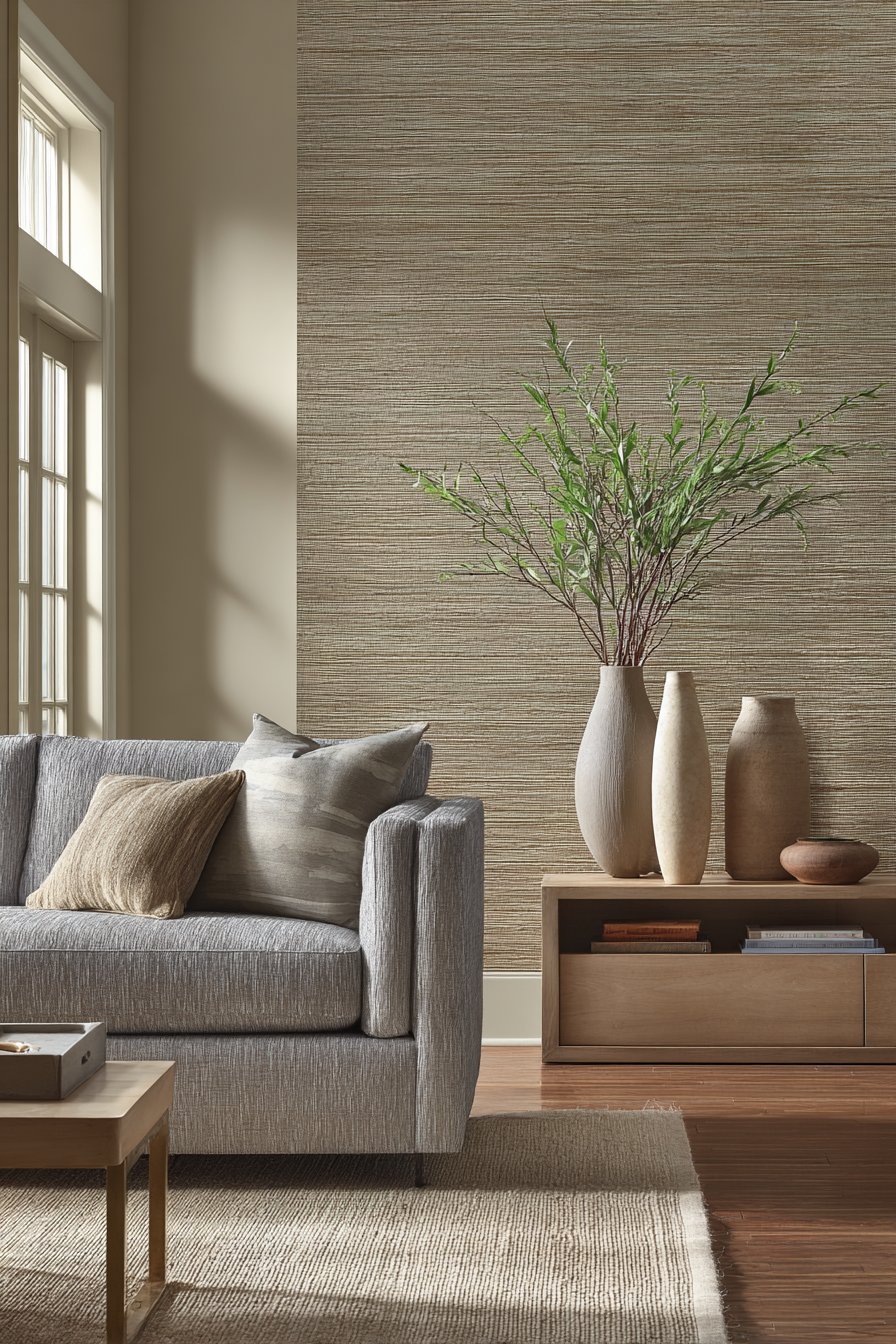 A neutral area rug and simple accessories maintain cohesion while allowing the textured wall to remain the room’s primary point of interest. Natural light from windows positioned perpendicular to the accent wall emphasizes the grasscloth’s texture variations throughout the day, casting shadows that accentuate its three-dimensional quality. This lighting position maximizes the wall treatment’s impact.