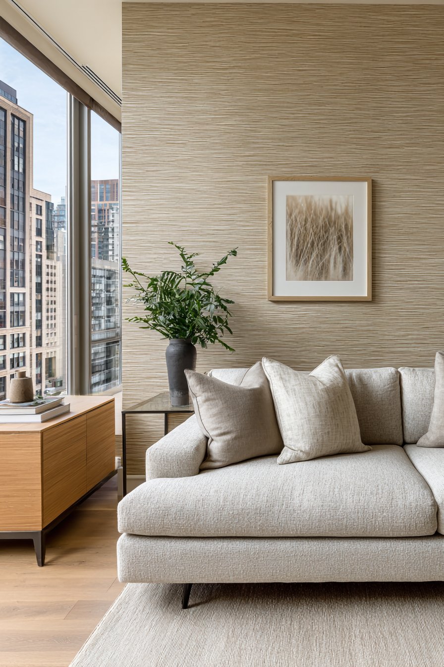 This design showcases how wall treatments can add significant interest to neutral spaces, with one accent wall featuring textured grasscloth wallpaper in natural tan contrasting with smooth walls in soft cream. The grasscloth’s organic texture and natural material add depth and dimension that paint alone cannot achieve, creating a focal point without introducing color.