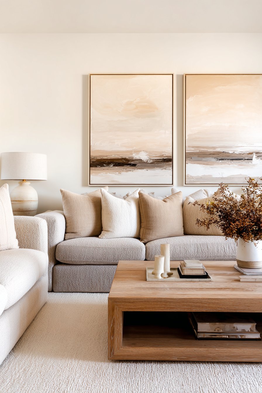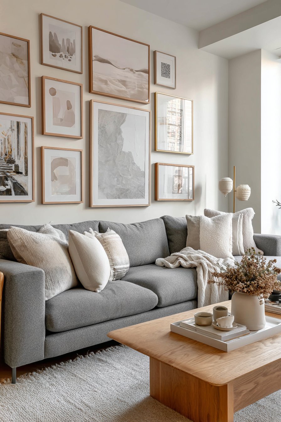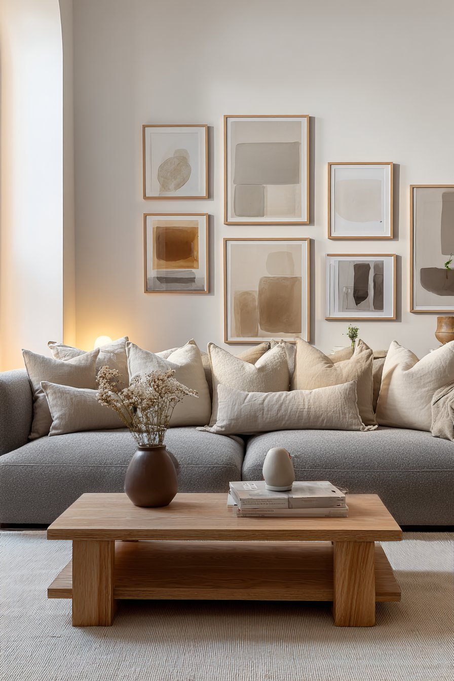 This design demonstrates how to create impactful gallery walls within neutral color schemes. Oversized neutral abstract art in creams, taupes, and soft greys hangs above a low-profile sofa in heather grey, the art’s generous scale appropriate for the minimal furniture below. Simple wood frames in natural oak unite the collection while their understated design keeps focus on the artwork itself.