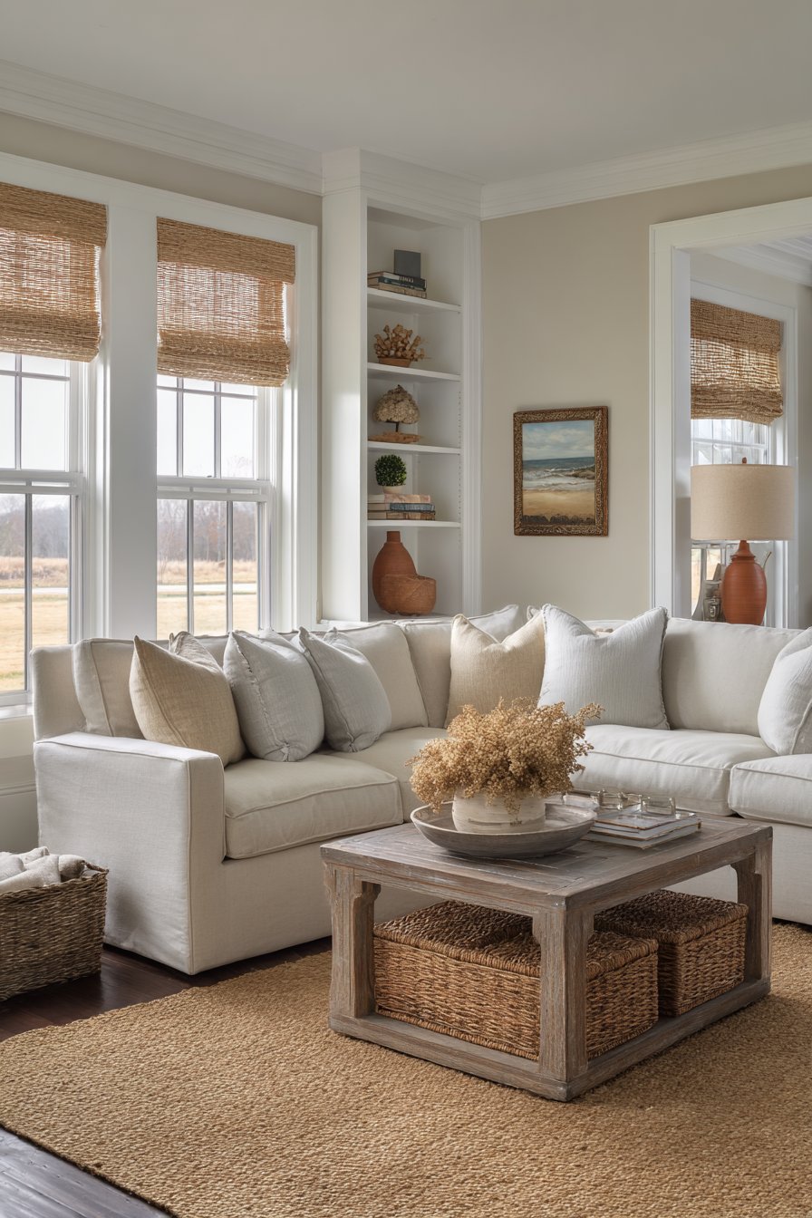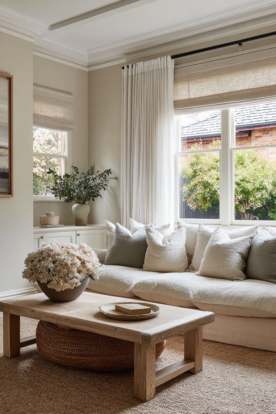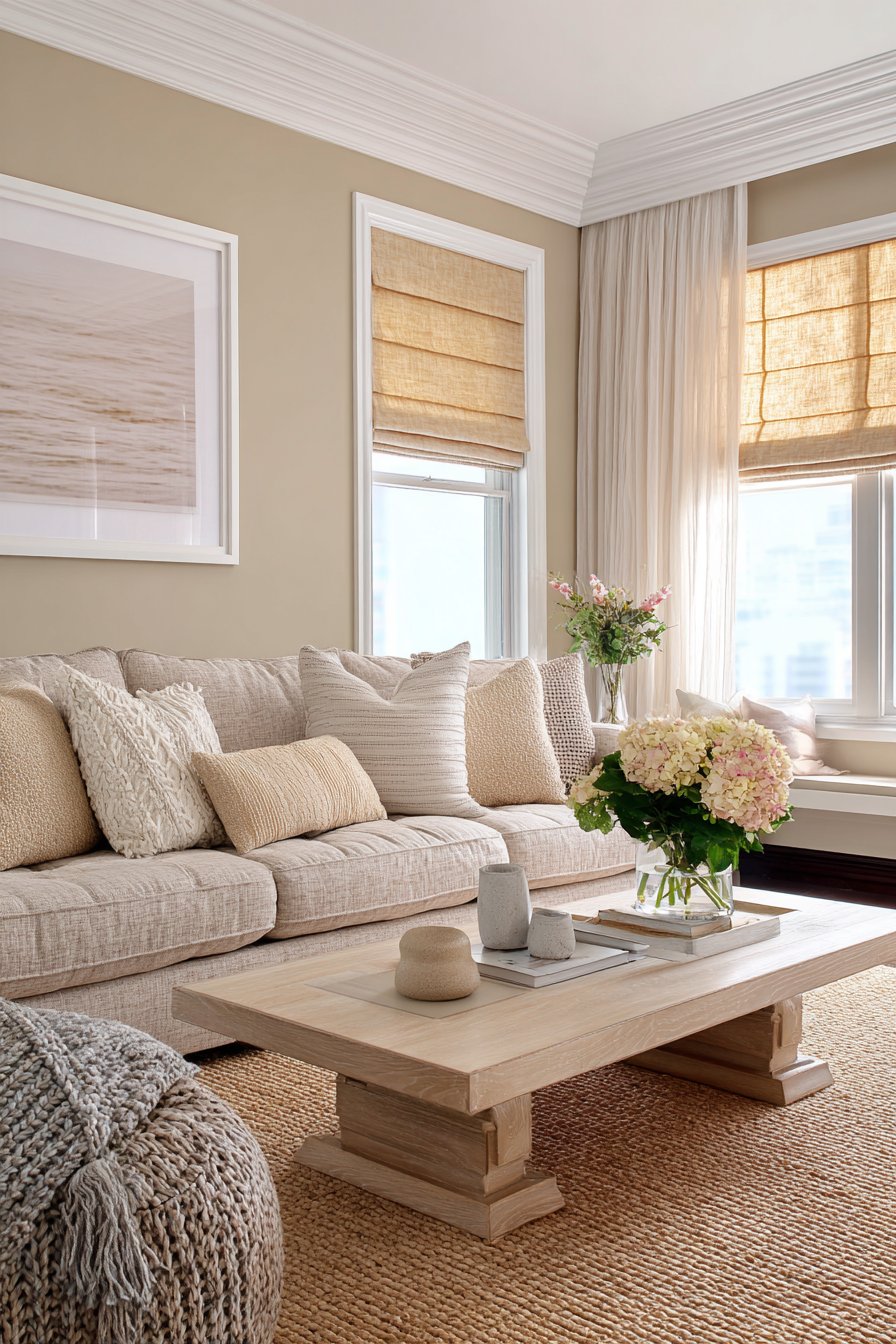 Walls in soft sand tone complement the window textiles’ natural flax and warm white tones, creating a cohesive palette that feels intentional and collected rather than matched. Natural light filtering through the various layers creates subtle variations in brightness and shadow throughout the day, demonstrating how neutral window treatments can actively contribute to a room’s changing ambiance.