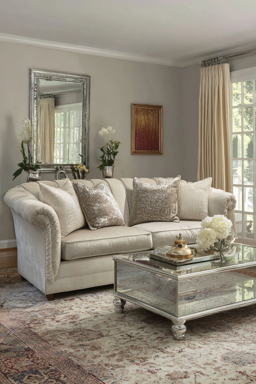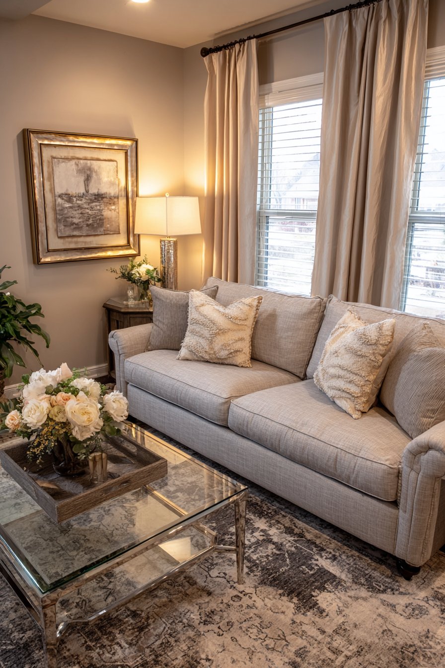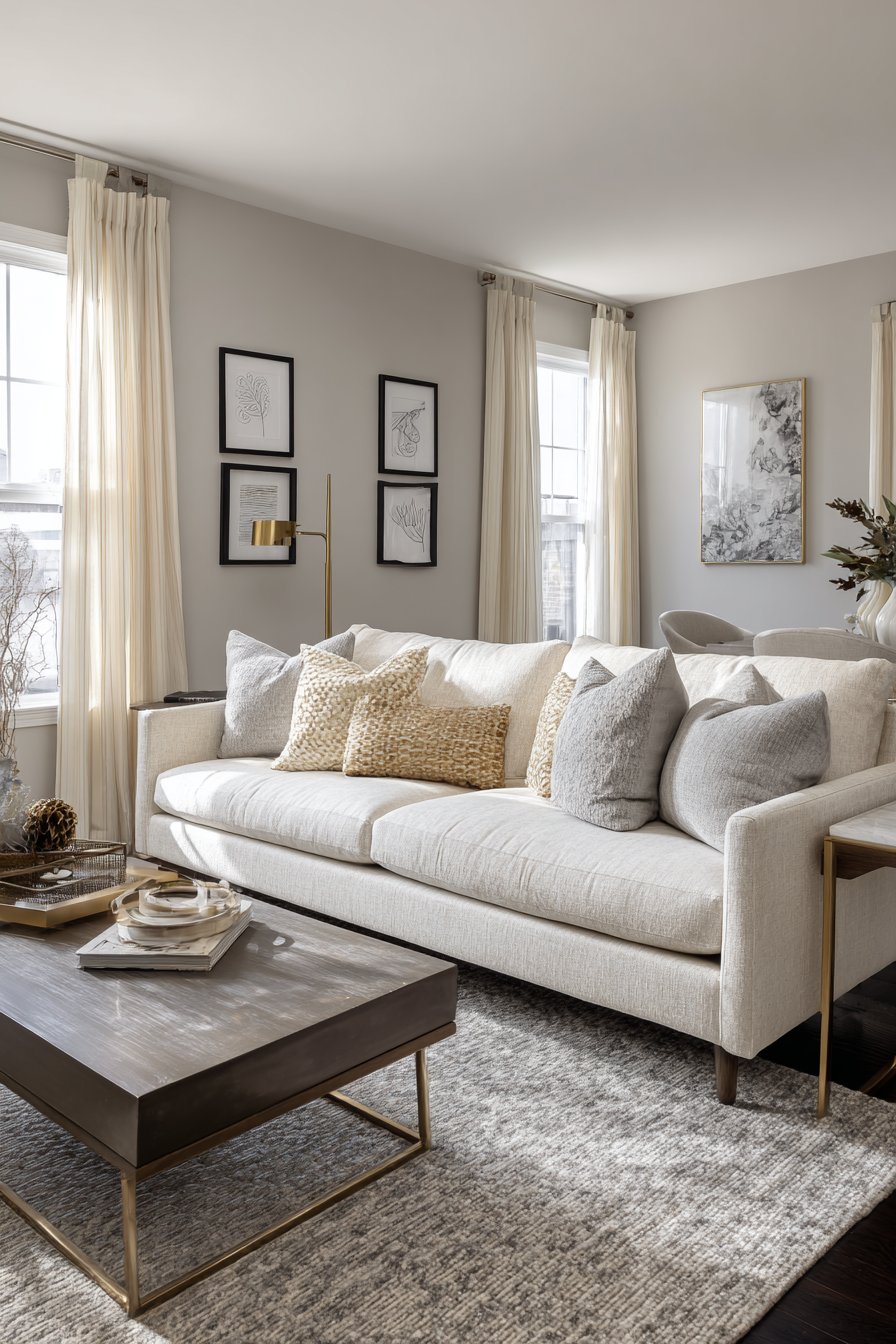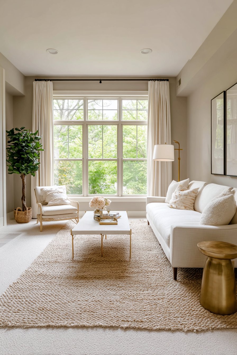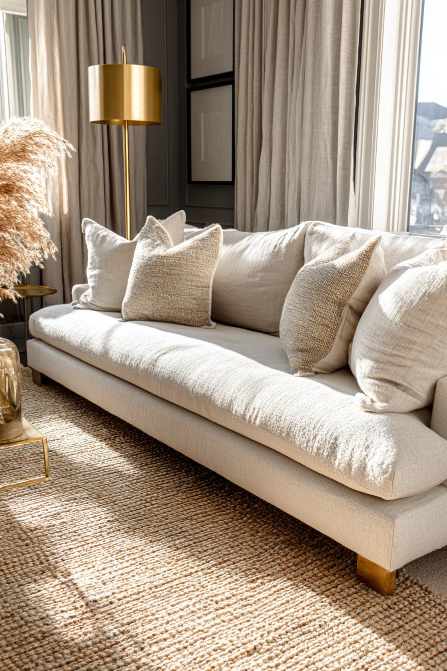 This design demonstrates how metallic accents can add dimension to monochromatic neutral spaces without introducing color. A cream sofa provides the neutral foundation while a brushed brass floor lamp introduces warm metallic gleam. The lamp’s brass finish catches and reflects light, adding sparkle and sophistication to the otherwise matte neutral palette.