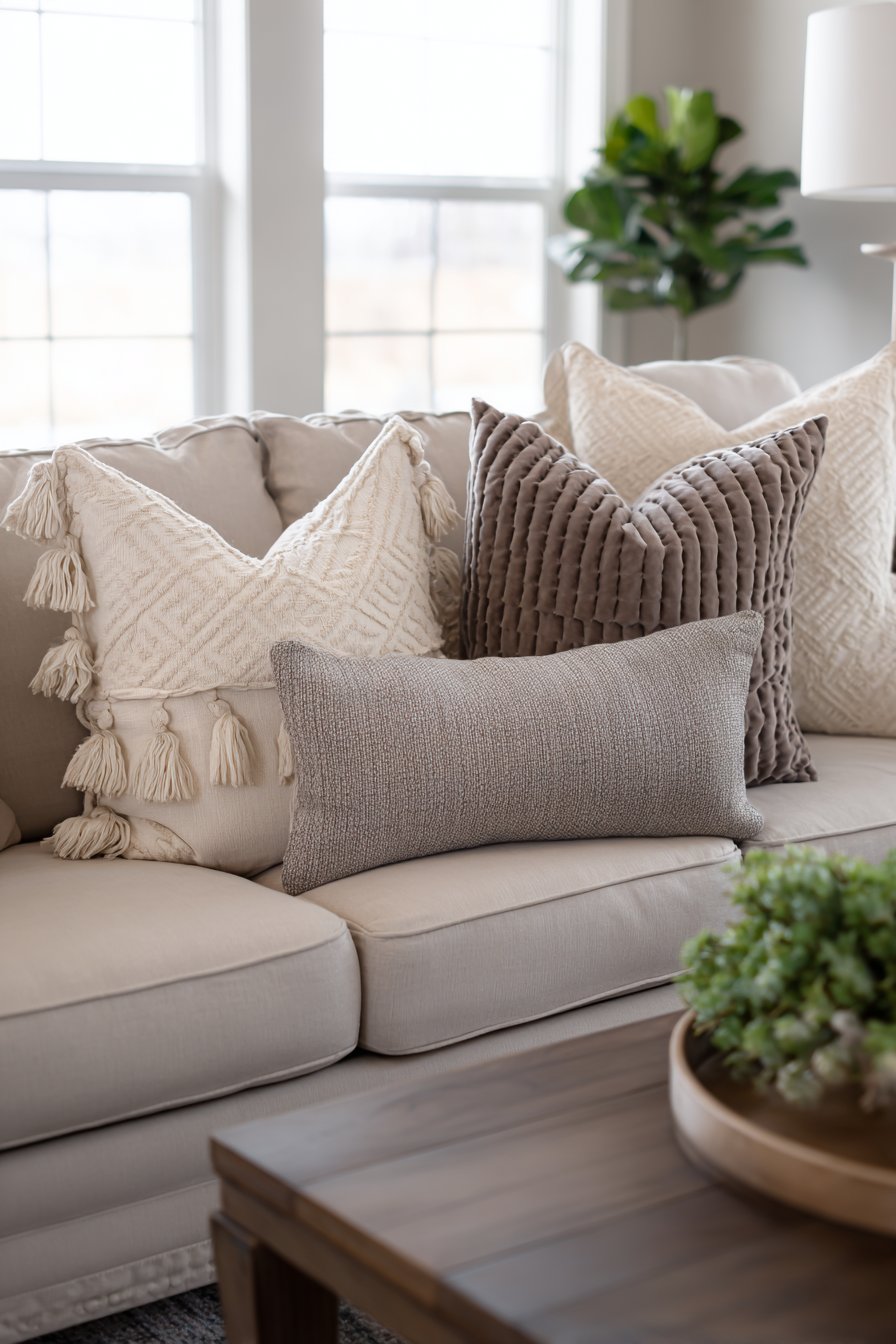 A wood coffee table and neutral rug visible in the composition provide context without distracting from the pillow arrangement. Natural light highlights the pillow textures, emphasizing how light reflects differently off velvet’s pile versus linen’s weave versus cotton’s texture. This detail-focused approach demonstrates that even small elements deserve thoughtful attention in creating beautiful neutral spaces.