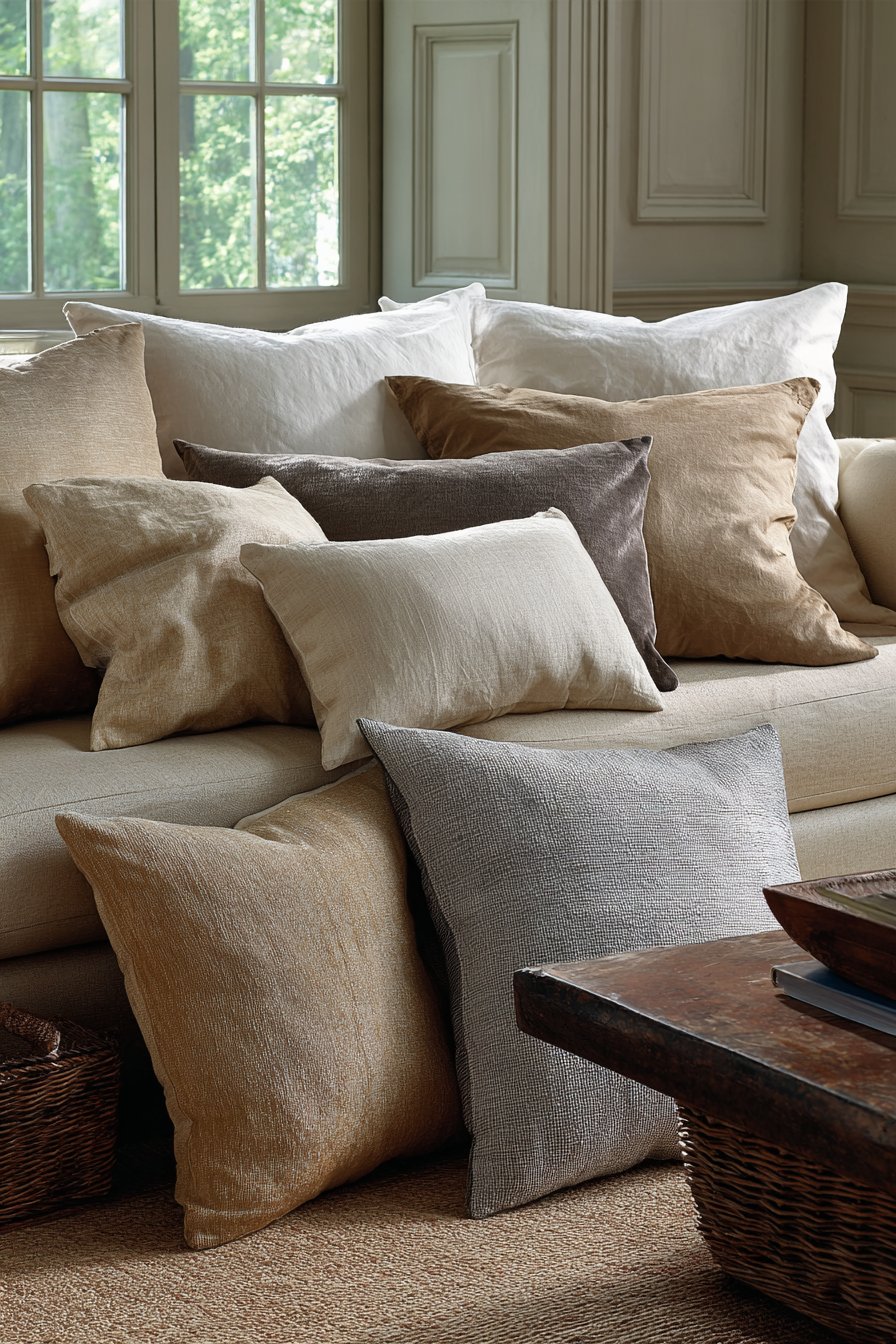 This design focuses specifically on the art of throw pillow arrangement, demonstrating how varied sizes, shapes, and textures create a collected, layered look. A neutral sofa serves as canvas for pillows in varied sizes: large linen euro shams in cream forming the back layer, medium velvet pillows in taupe providing mid-layer richness, smaller textured pillows in natural cotton adding detailed interest, and a lumbar pillow in soft grey providing horizontal contrast.