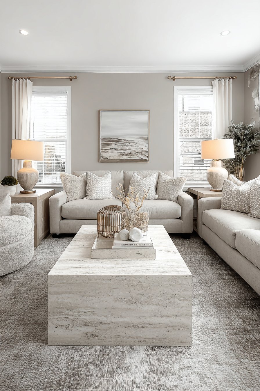 Identical table lamps with cream shades on matching side tables flanking each sofa reinforce the symmetrical composition. This mirrored approach creates a sense of calm and order that many find psychologically comforting, with the neutral tones enhancing the tranquil quality. Walls in warm greige provide a subtle backdrop that supports rather than disrupts the balanced arrangement.