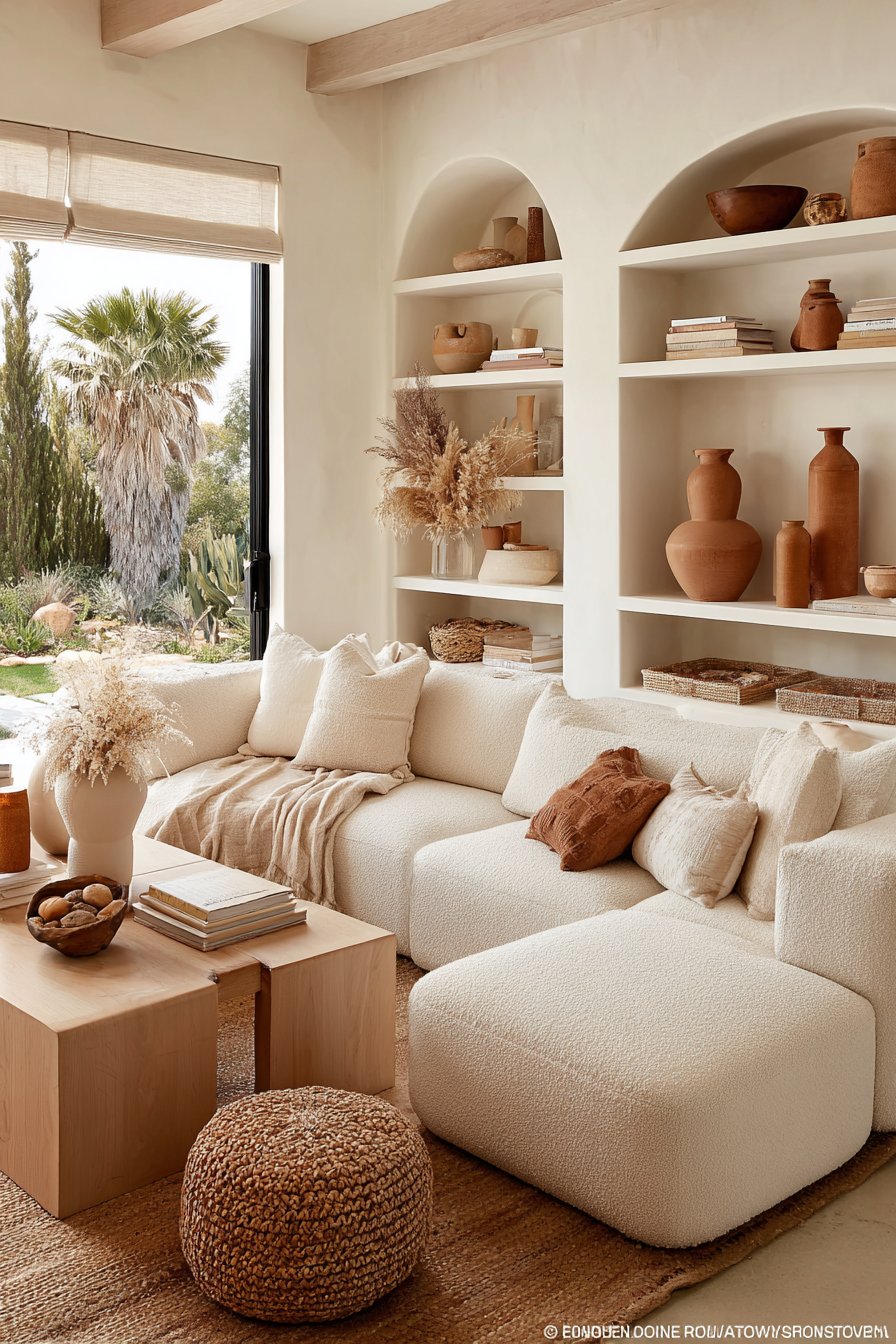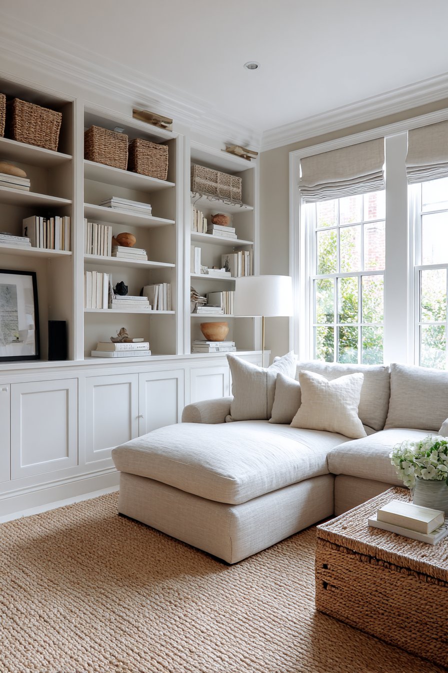 Functionality meets aesthetics in this thoughtfully designed space where built-in shelving in warm white provides extensive storage while maintaining the room’s neutral elegance. The shelving units, custom-fitted to the wall, house natural woven baskets that conceal clutter while adding textural interest, cream-bound books arranged by color for visual cohesion, and terracotta pottery that introduces earthy warmth without disrupting the neutral palette.