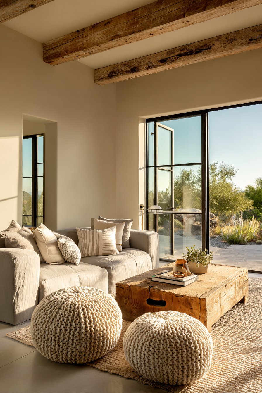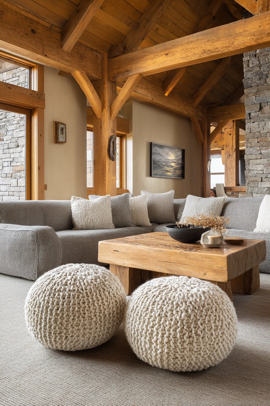 A reclaimed wood beam repurposed as a rustic coffee table brings raw, organic beauty to the refined setting. Its substantial proportions and weathered surface tell a story of previous use, adding character and authenticity that new furniture simply cannot replicate. Paired with poufs upholstered in natural undyed wool, the seating area offers flexible additional seating that can be easily moved as needed.