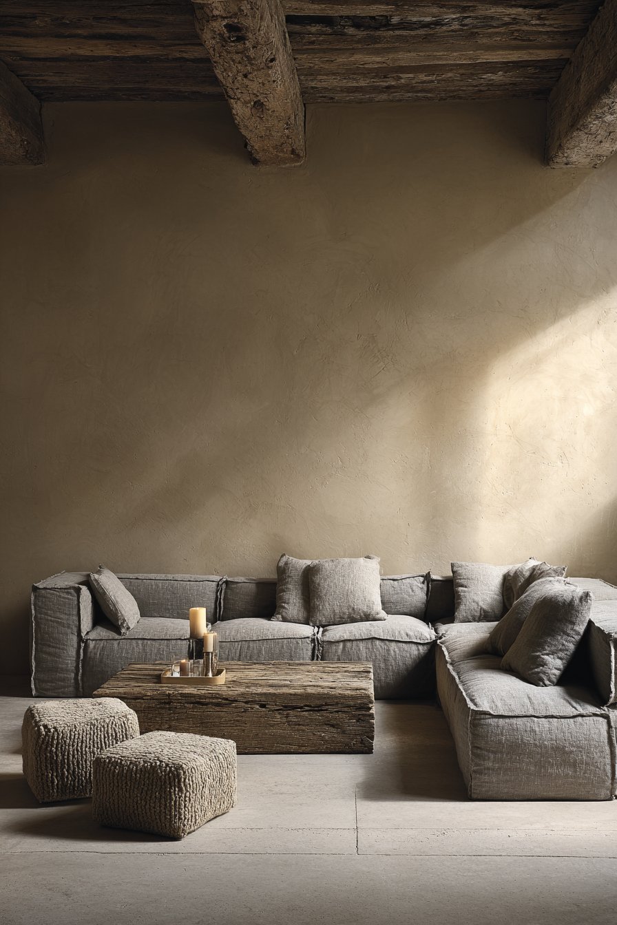 The stone-grey modular sofa with removable linen slipcovers serves as the practical yet beautiful foundation of this intimate living space. The modular design allows for flexible arrangements to suit different occasions, while the slipcovers offer the practical advantage of easy cleaning—essential for real-life living. The sofa’s arrangement creates a U-shaped conversation area that encourages face-to-face interaction and comfortable gatherings.