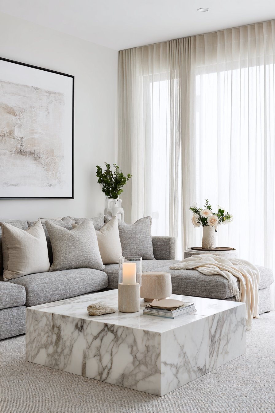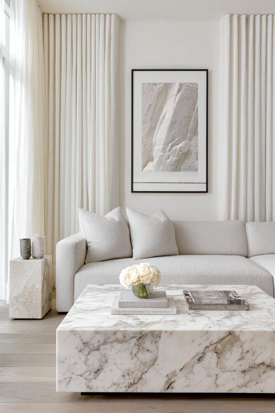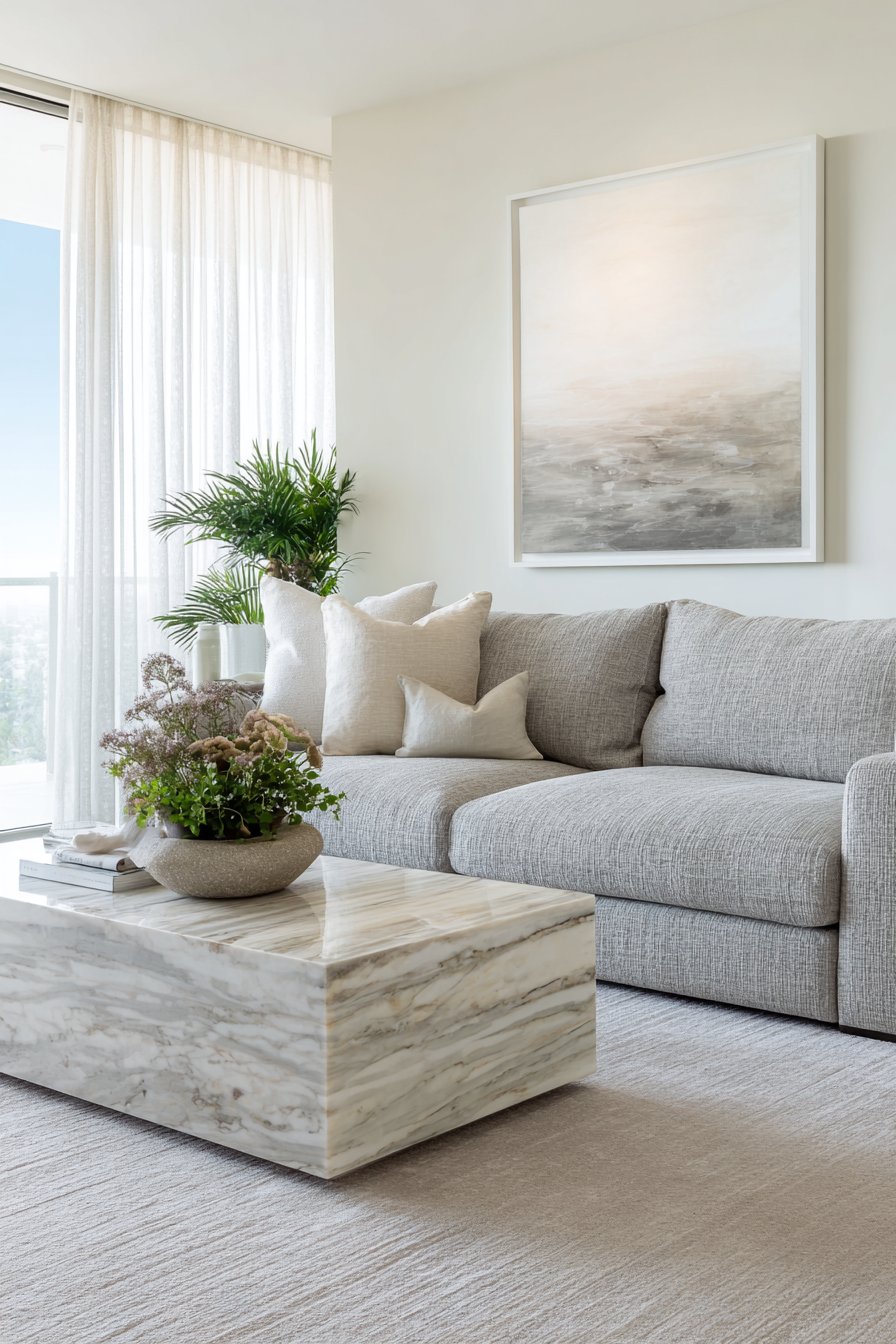 A sleek marble coffee table in cream with subtle grey veining serves as the room’s sculptural centerpiece. The natural stone’s cool elegance contrasts beautifully with the soft textile of the sofa, while its veining patterns introduce organic movement to the otherwise geometric composition. The marble’s polished surface reflects light, adding brightness to the space and creating visual interest through its natural variations.