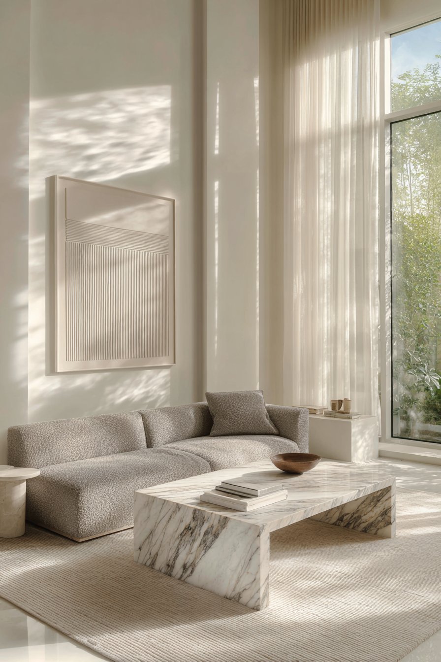 Sheer curtains in natural white linen diffuse bright natural light, creating an ethereal quality that enhances the room’s serene atmosphere. A single large abstract artwork in neutral tones—creams, taupes, and soft greys—serves as the focal point above the sofa, its generous scale appropriate for the minimalist setting where fewer elements mean each one carries more visual weight.