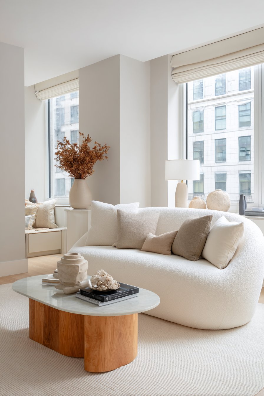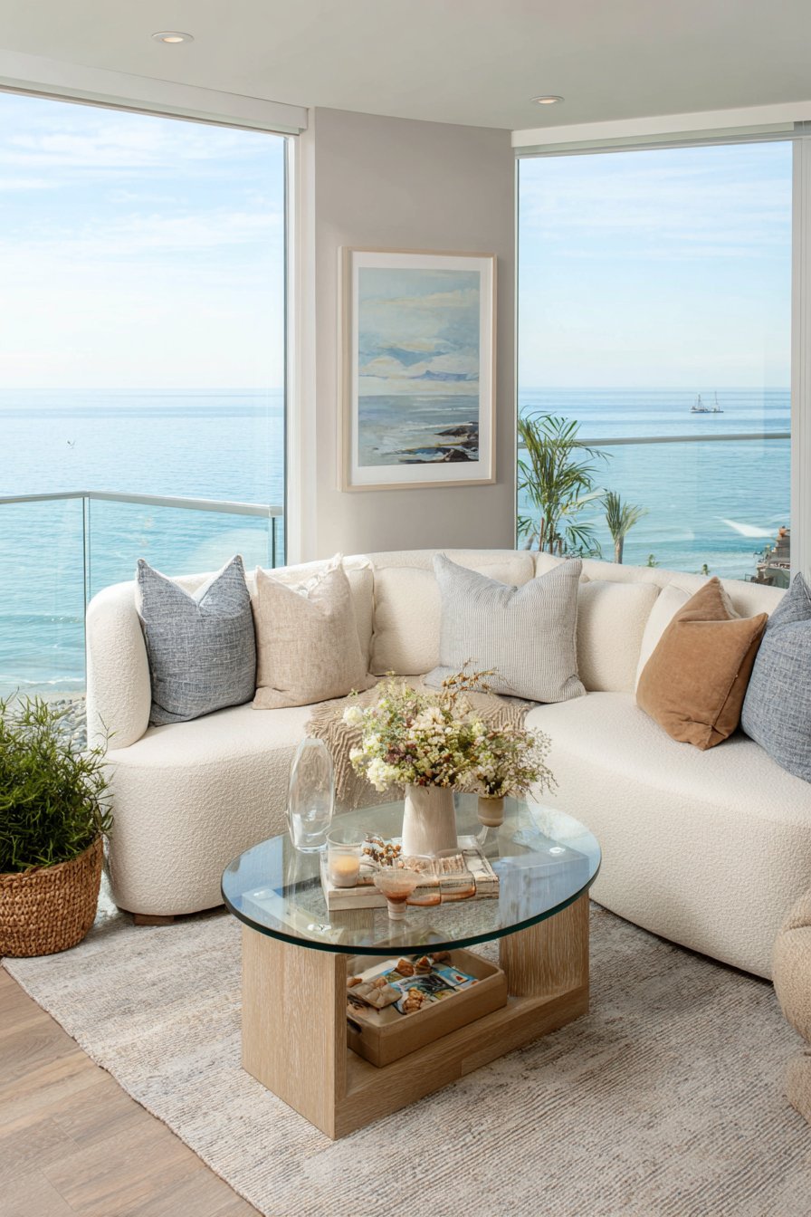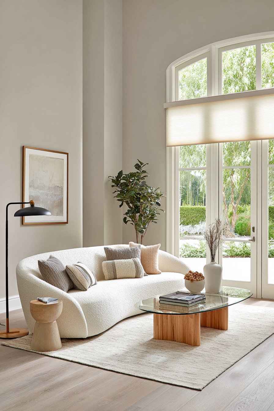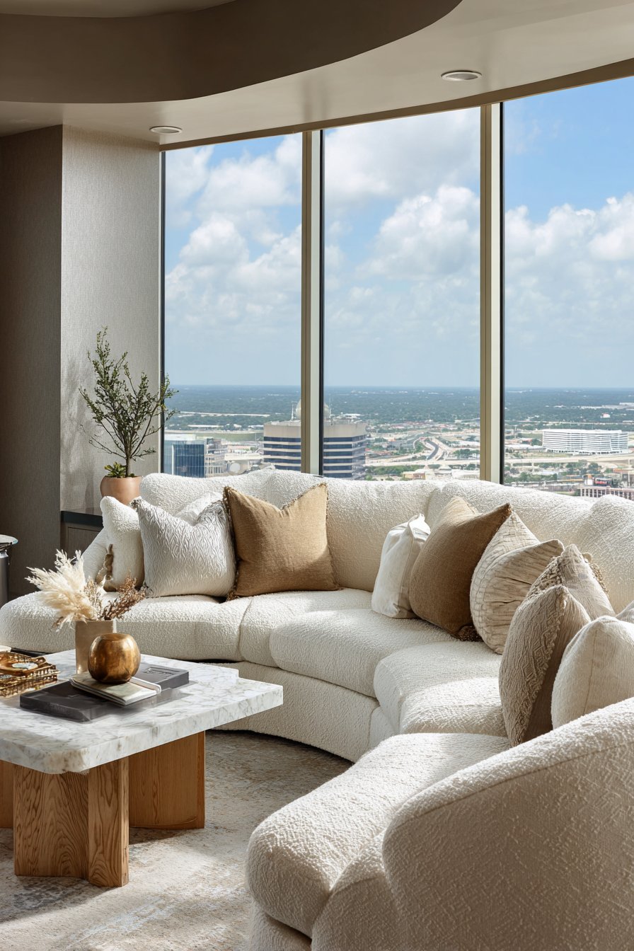 Styling the curved sofa with pillows in varying shades of sand and stone demonstrates how to create depth within a monochromatic scheme. Each pillow’s subtle difference in tone becomes more apparent when placed beside its neighbors, revealing the complexity possible within seemingly simple neutral palettes. A glass-top coffee table with natural oak base maintains visual lightness, preventing the room from feeling too heavy despite the substantial sofa.