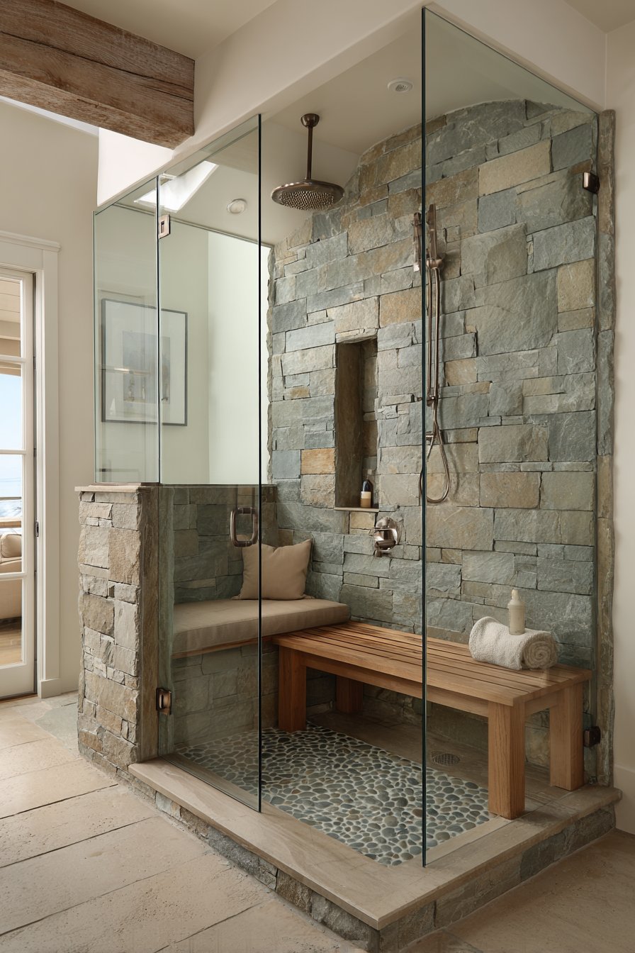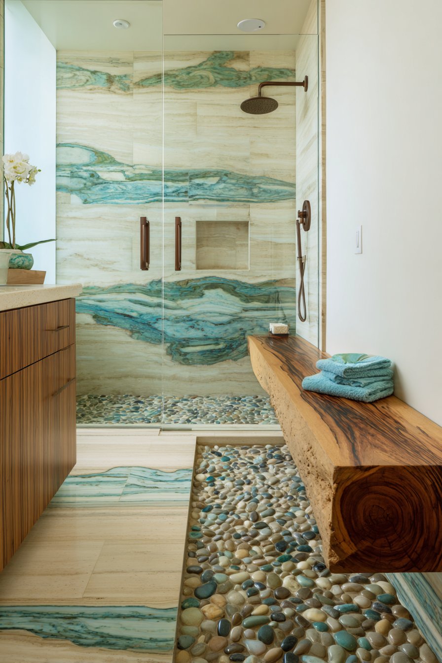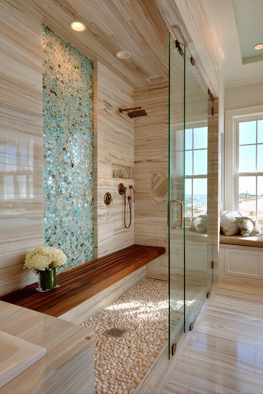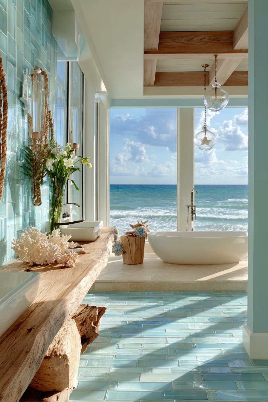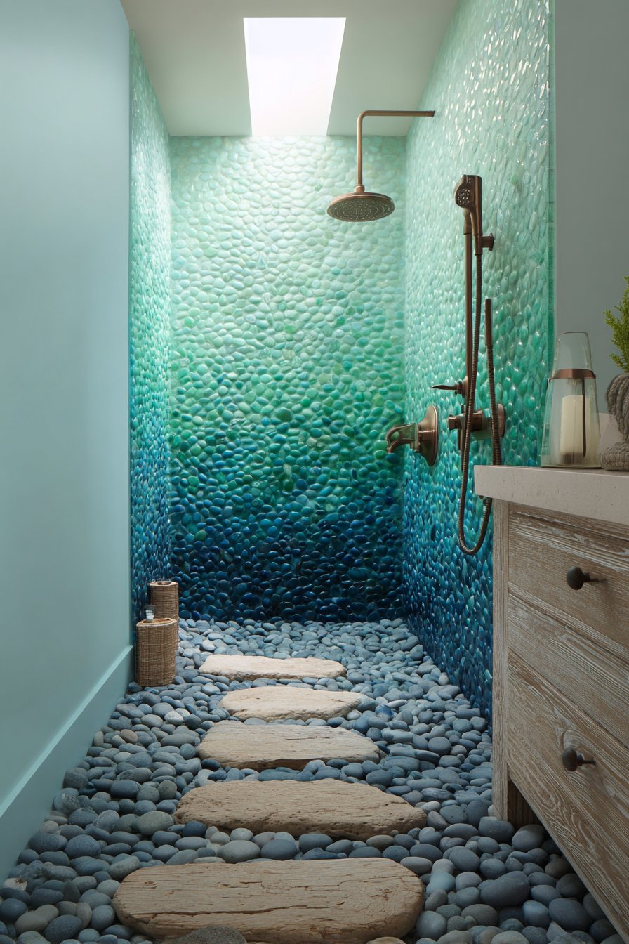 Step into a shower that feels like descending into the ocean depths with a carefully orchestrated gradient of seafoam green glass tiles transitioning from deep ocean blue to light aqua. This ocean bathroom idea creates an immersive experience where the tile arrangement mimics the natural progression of water from shallow to deep. The glass tiles catch and reflect light in mesmerizing ways, creating dimension and movement that truly brings the ocean’s essence into your daily routine. Pebble stone flooring beneath your feet completes the sensory experience, offering texture that recalls walking along a beach while providing practical slip resistance.