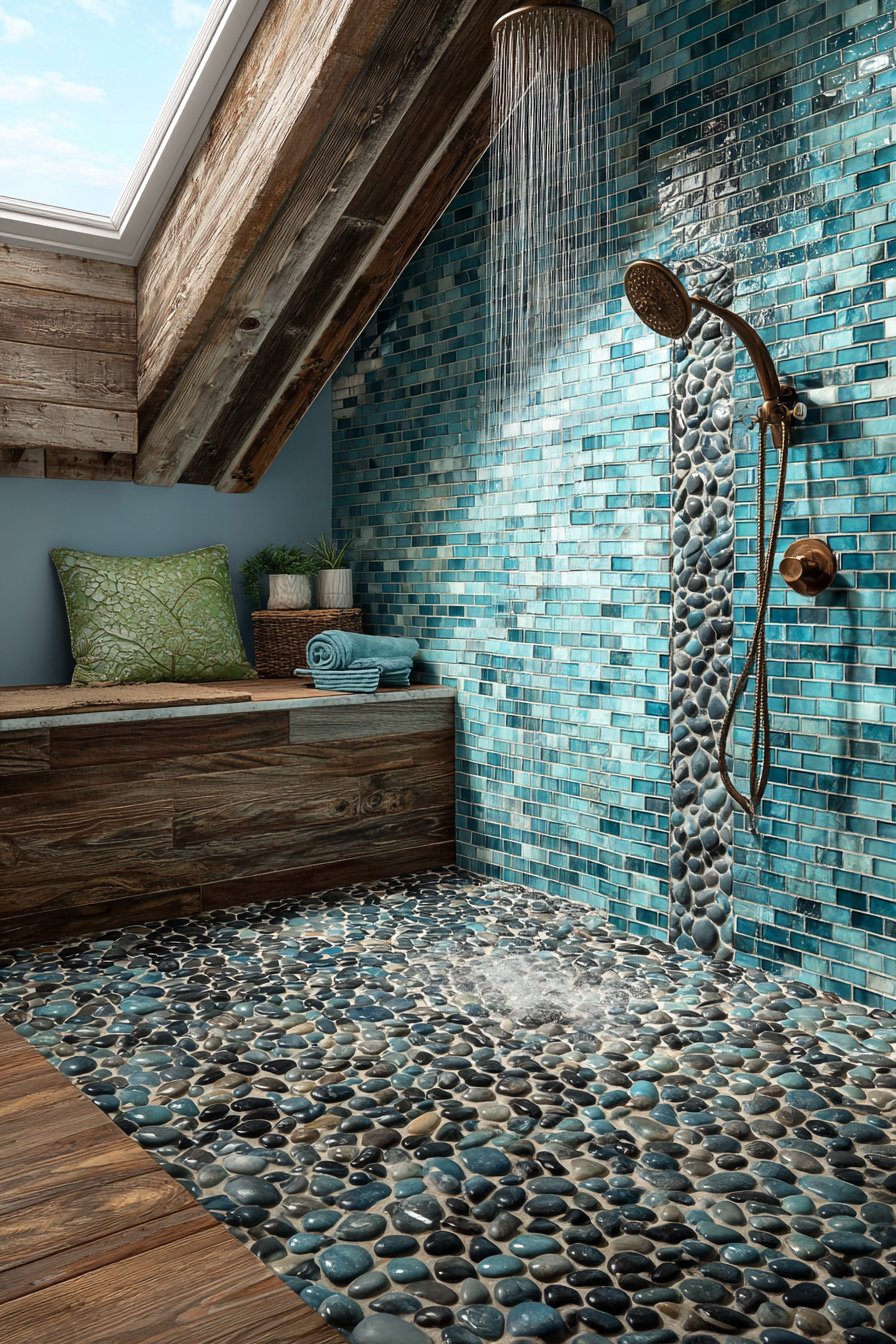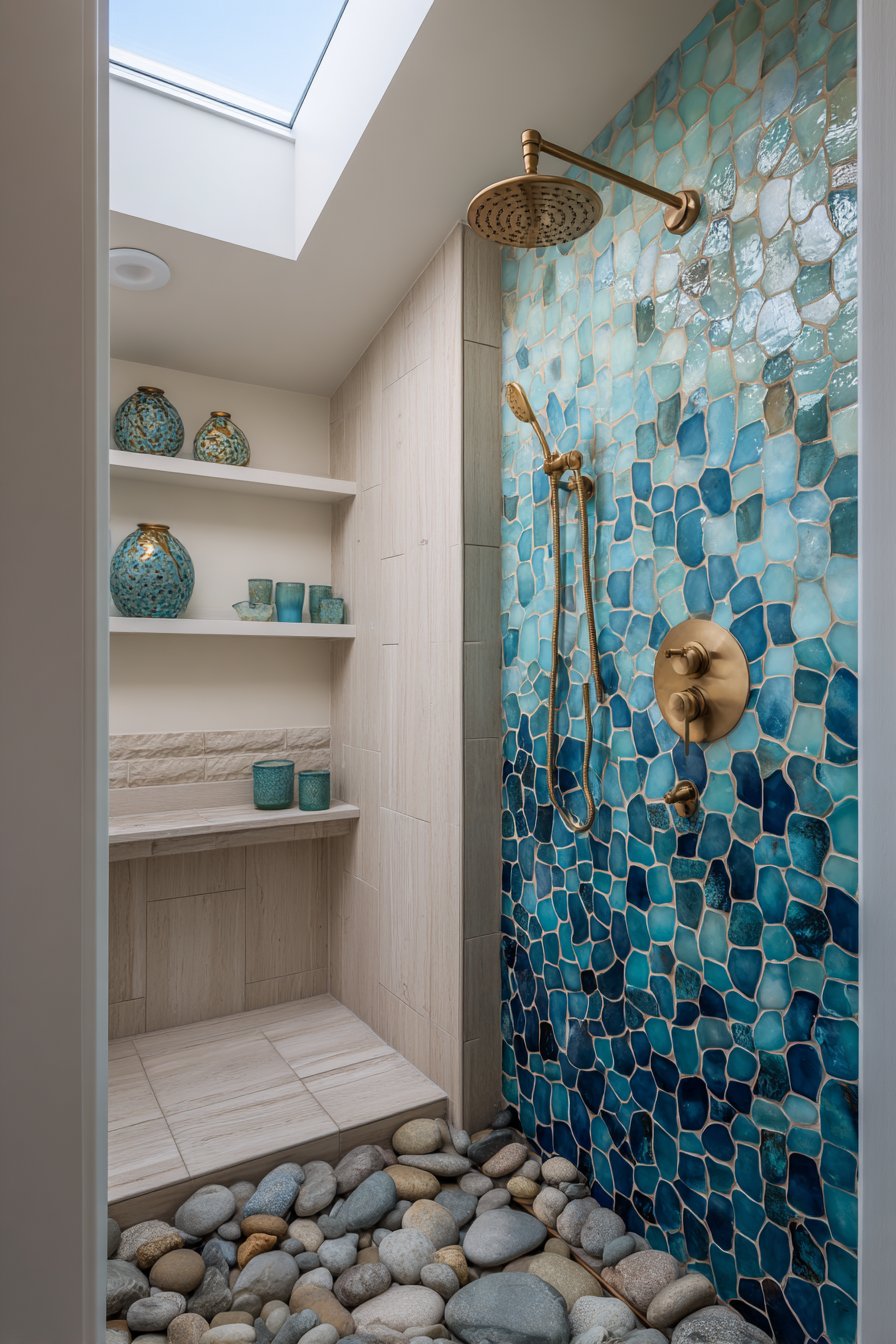 Natural light streaming through a skylight transforms this shower throughout the day, highlighting different aspects of the tile gradient as the sun moves across the sky. Morning light might emphasize the lighter aqua tones, while afternoon sun could make the deeper blues more prominent. This dynamic quality ensures the space never feels static, much like the ocean itself changes with light and weather conditions.