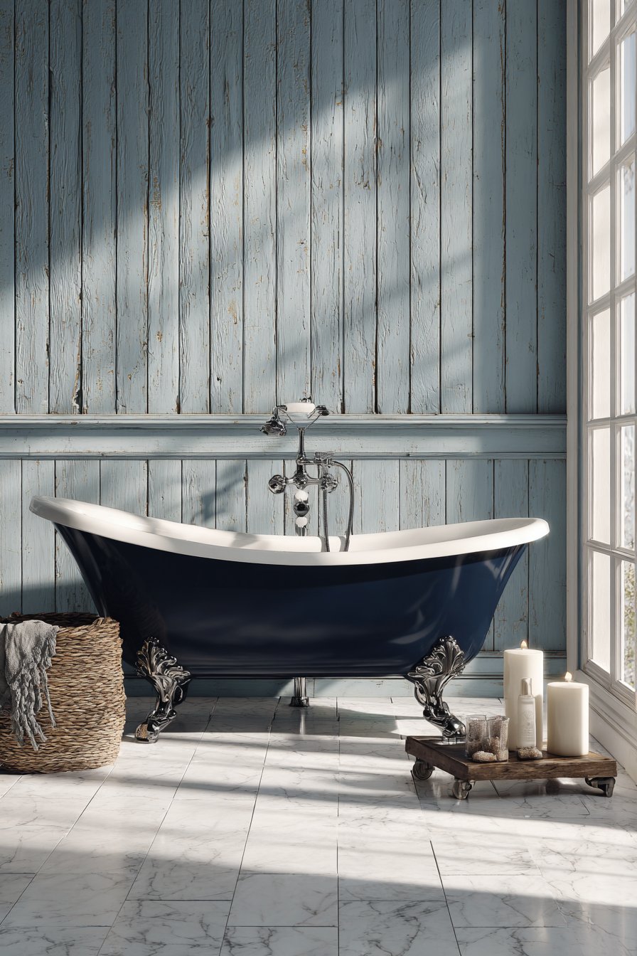 10. Navy Clawfoot Tub with Cottage Paneling