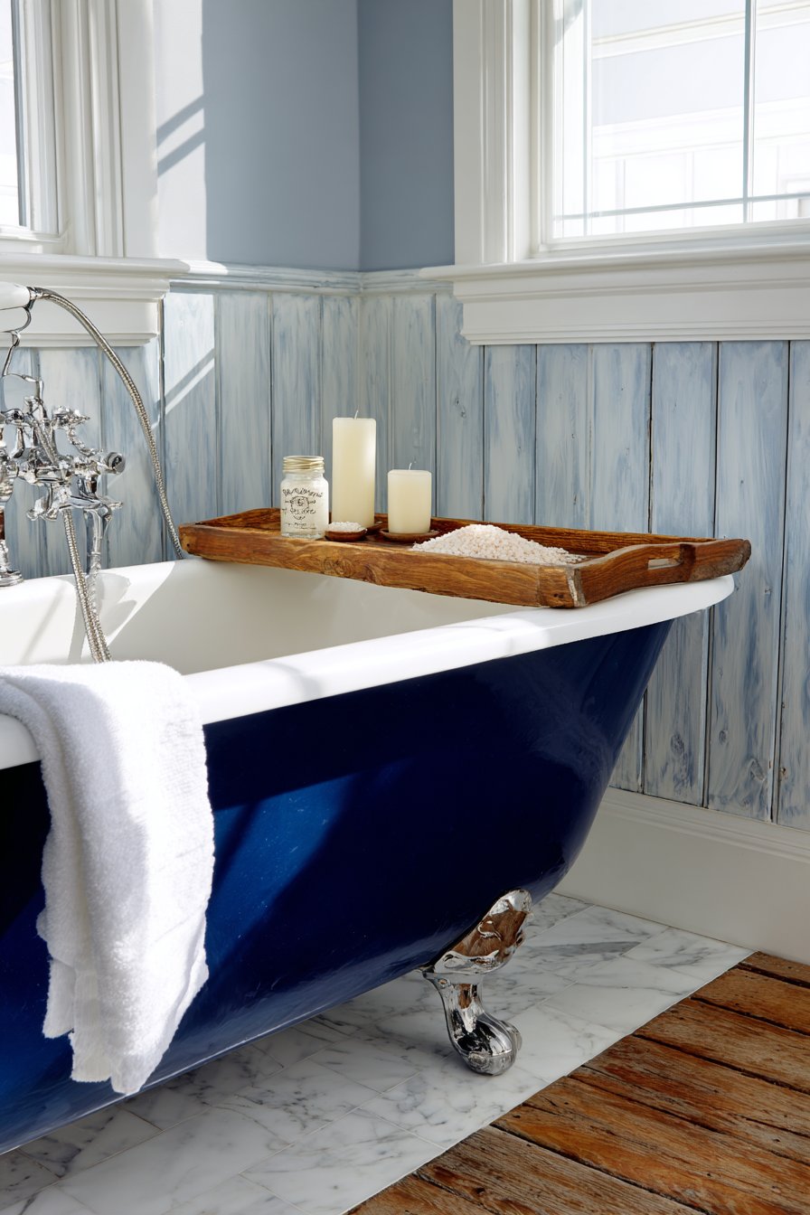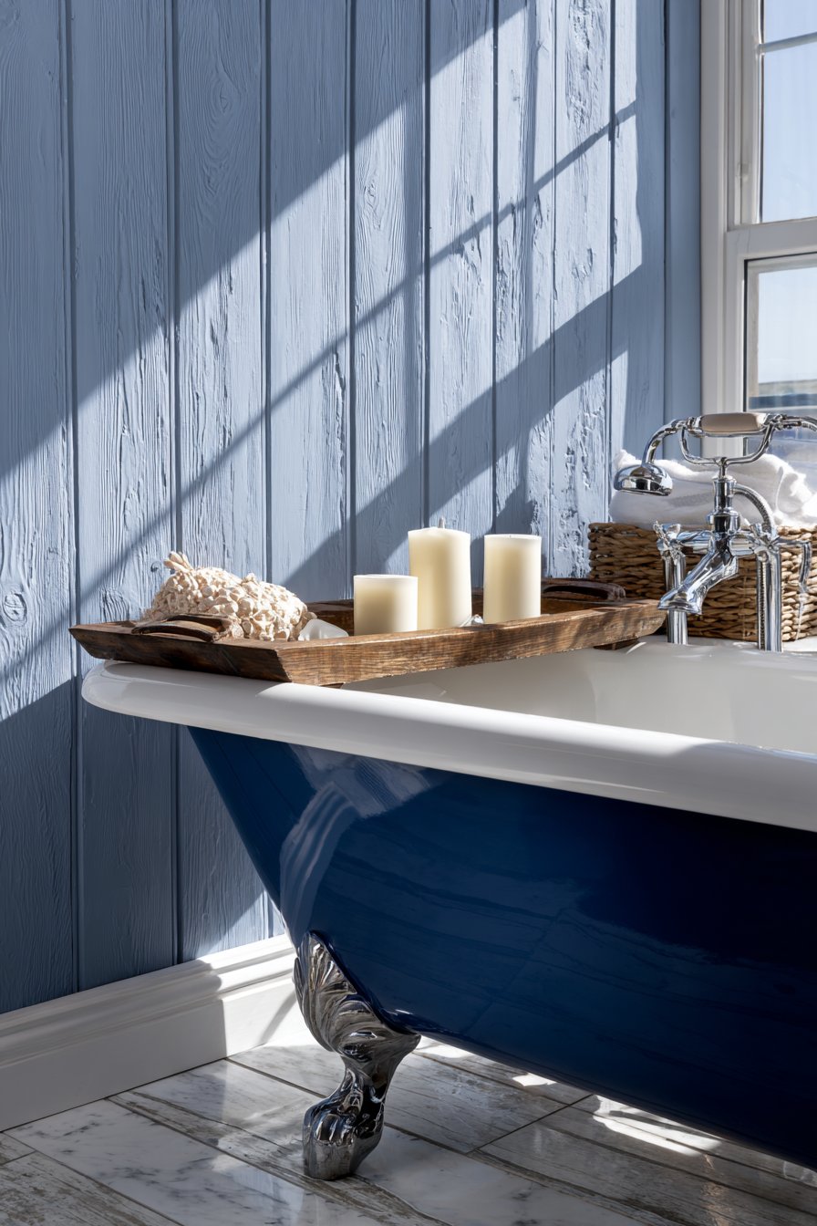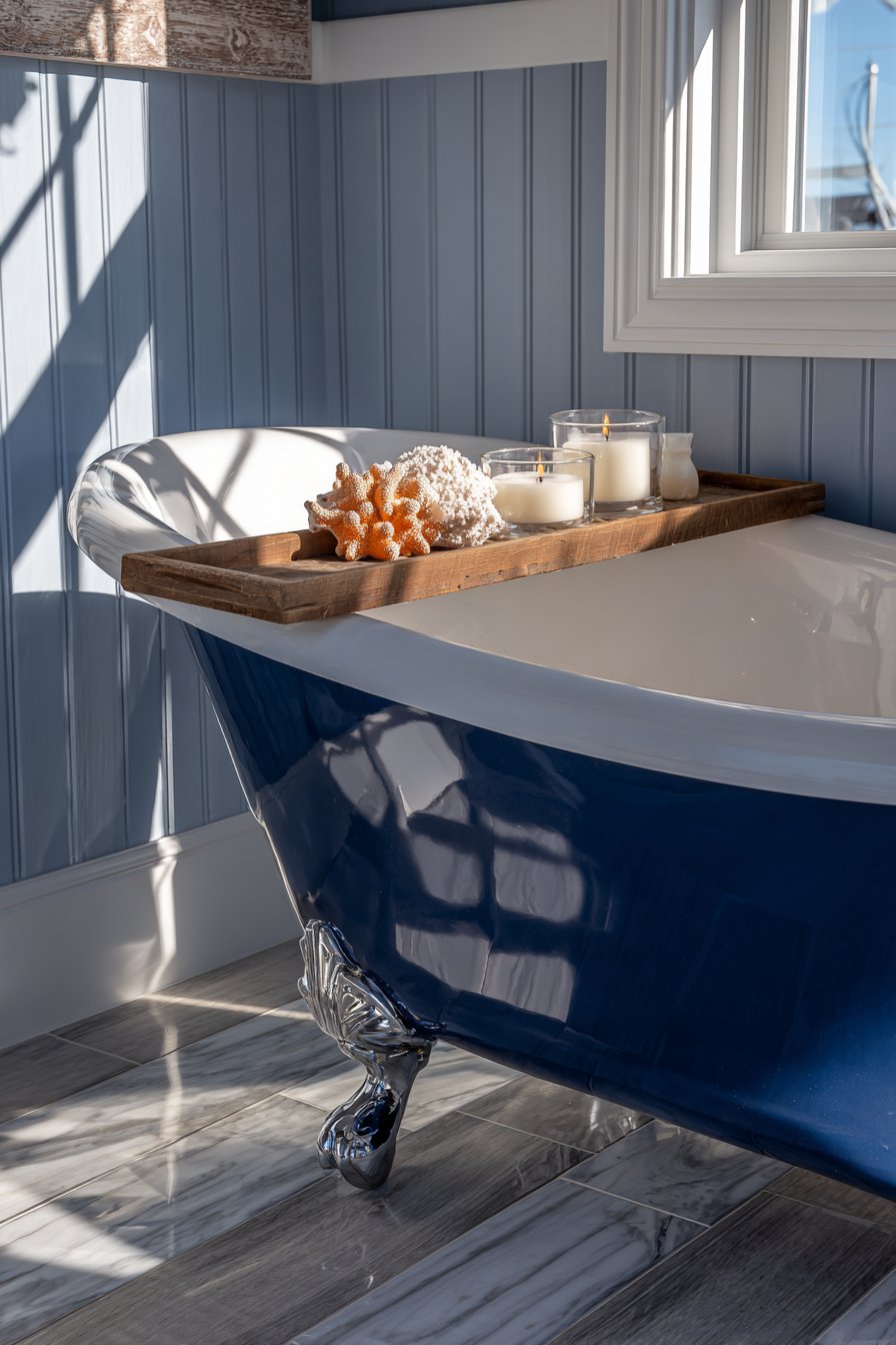 Traditional elegance defines this ocean bathroom idea centered on a clawfoot tub painted in deep navy blue, its bold color making it a sculptural focal point against white marble-look porcelain tiles. Painting a vintage clawfoot tub breathes new life into classic forms while allowing personal expression—the navy color ties it directly to ocean themes while maintaining timeless appeal. The curved lines and ornate feet of the tub style add character impossible to achieve with modern built-in tubs.