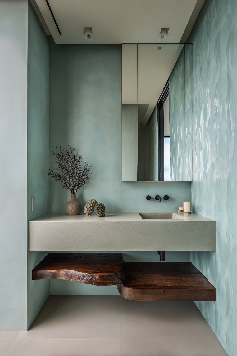 Matte black fixtures create strong contrast against the pale concrete and soft aqua, their dark presence grounding the light color palette and providing contemporary edge. A living edge wooden shelf displays minimal coastal accessories—perhaps a single piece of driftwood, a glass vessel with sand, a small succulent—demonstrating the power of curation and negative space. Natural light from a clerestory window washes the walls with soft illumination that emphasizes textures and creates an ethereal quality.