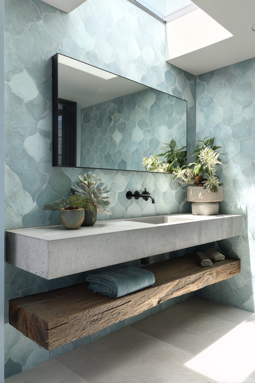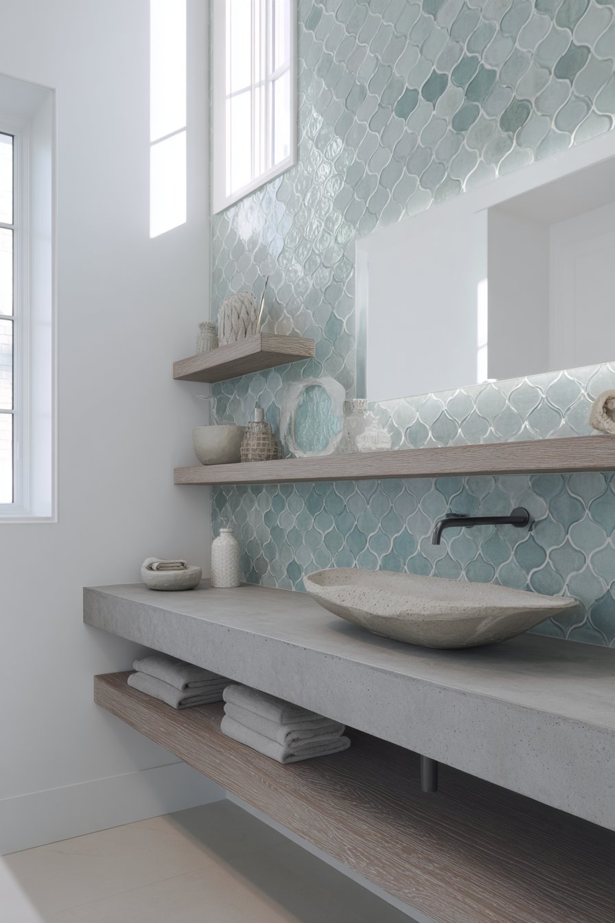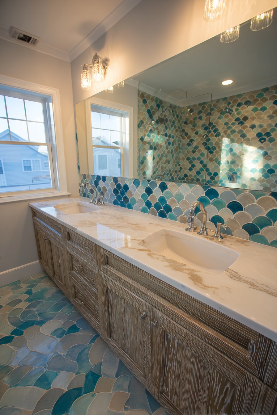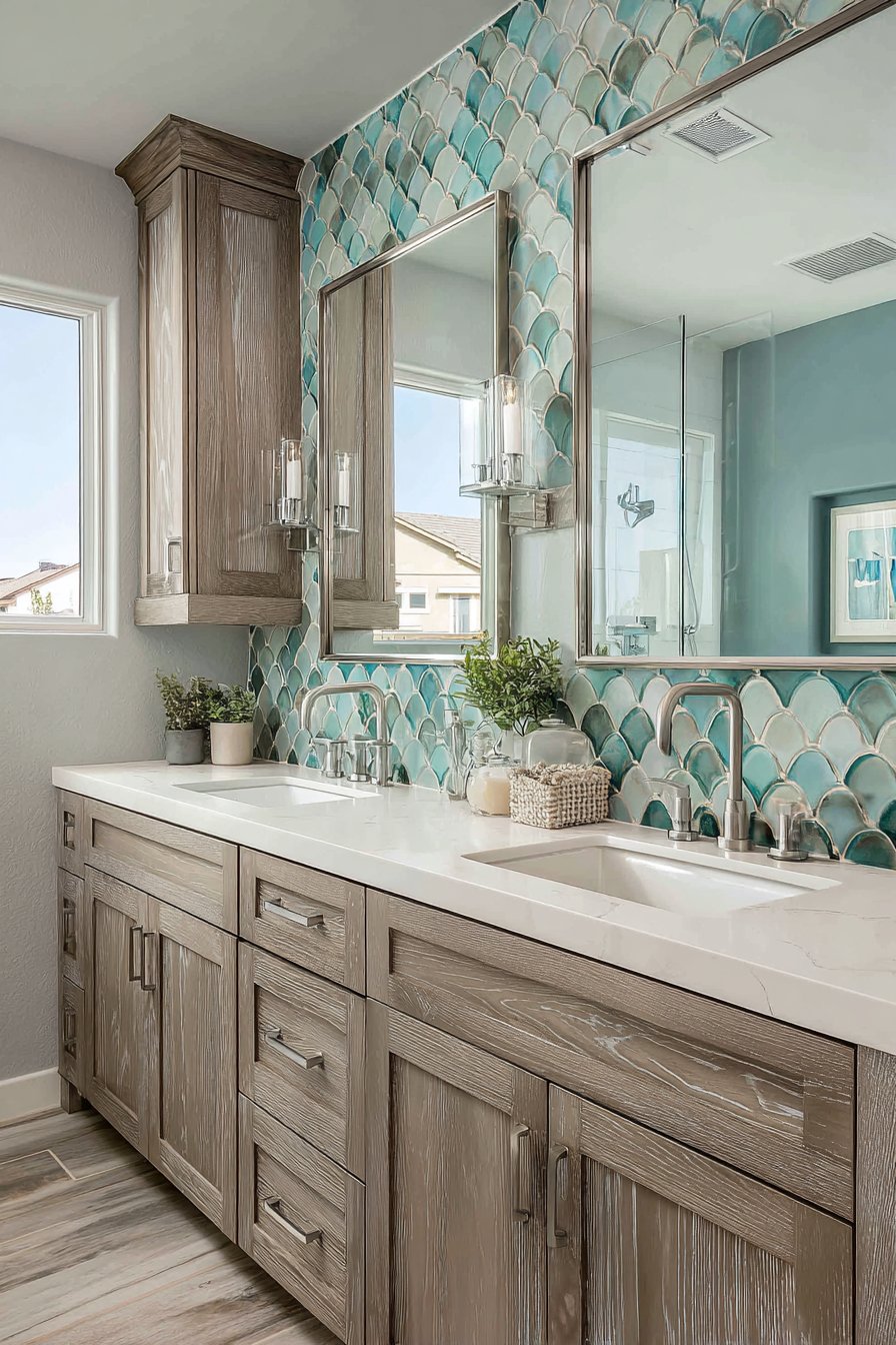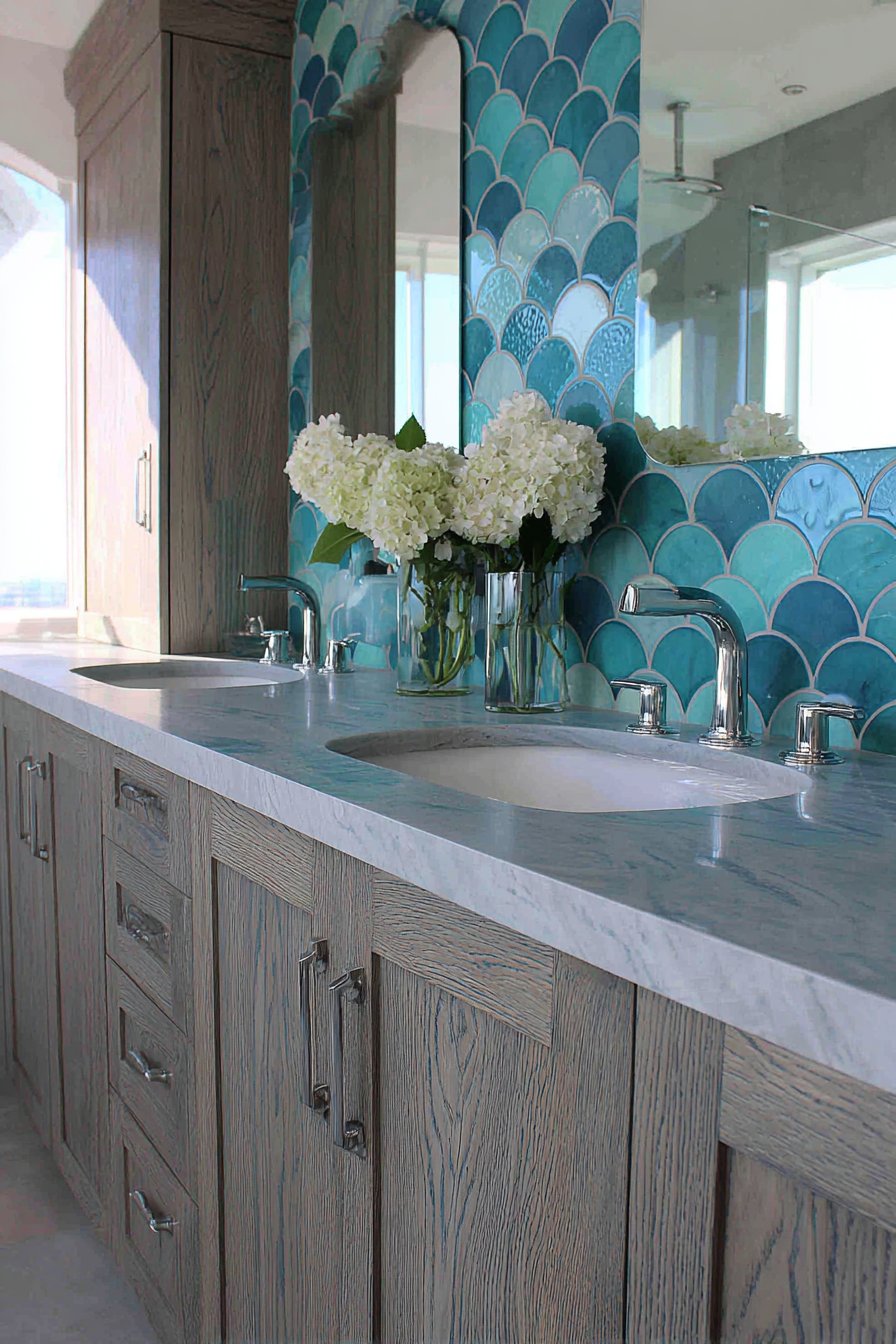 15. Fish-Scale Tile Double Vanity